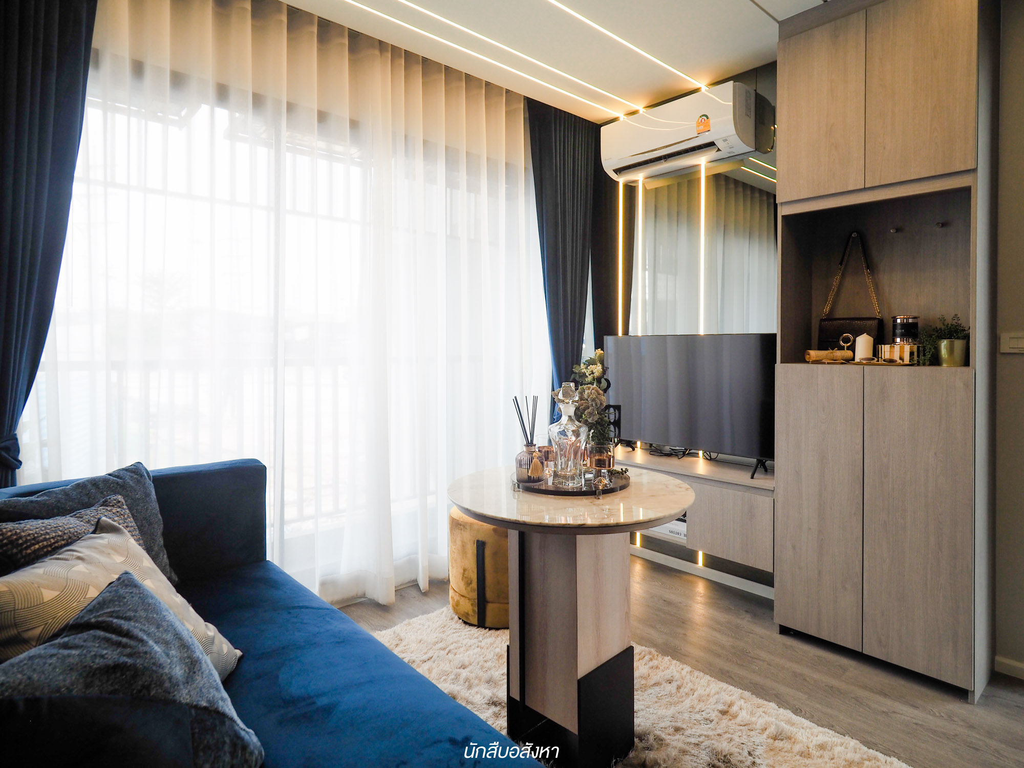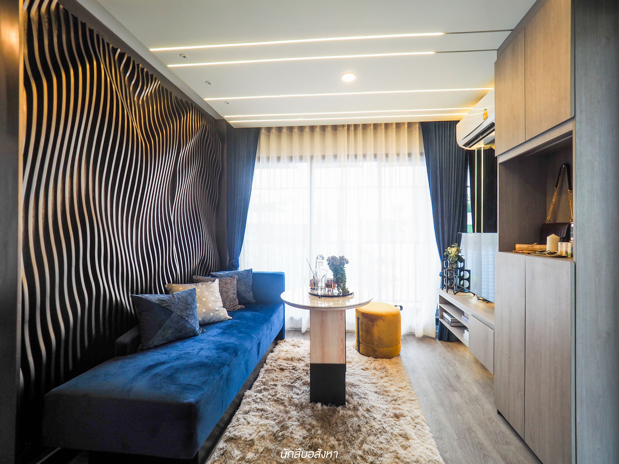 พื้นที่แรกจะเป็นพื้นที่ของห้องนั่งเล่นขนาดใหญ่ที่เชื่อมต่อกับครัวปิดที่ทางโครงการตกแต่งมาในรูปแบบ I – Shaped Kitchen พร้อมกับ Built-in เฟอร์นิเจอร์มาให้เรียบร้อย ซึ่งมุมของห้องนั่งเล่นนั้นอีกจุดเด่นจะเป็นในส่วนของกระจกทรงสูงเต็มบานที่สามารถเทควิวจากมุมห้องได้แบบเปิดกว้างเลยครับ