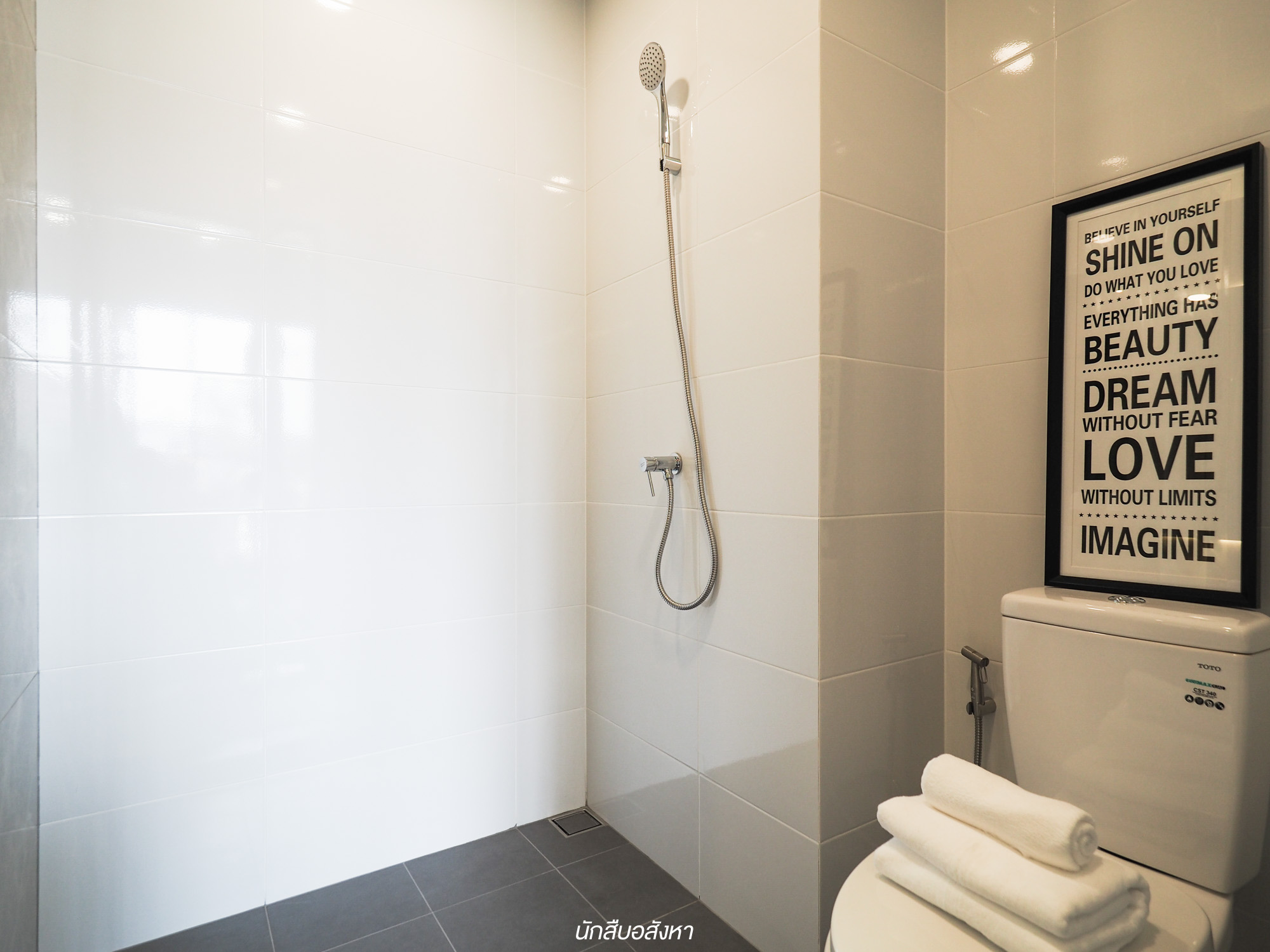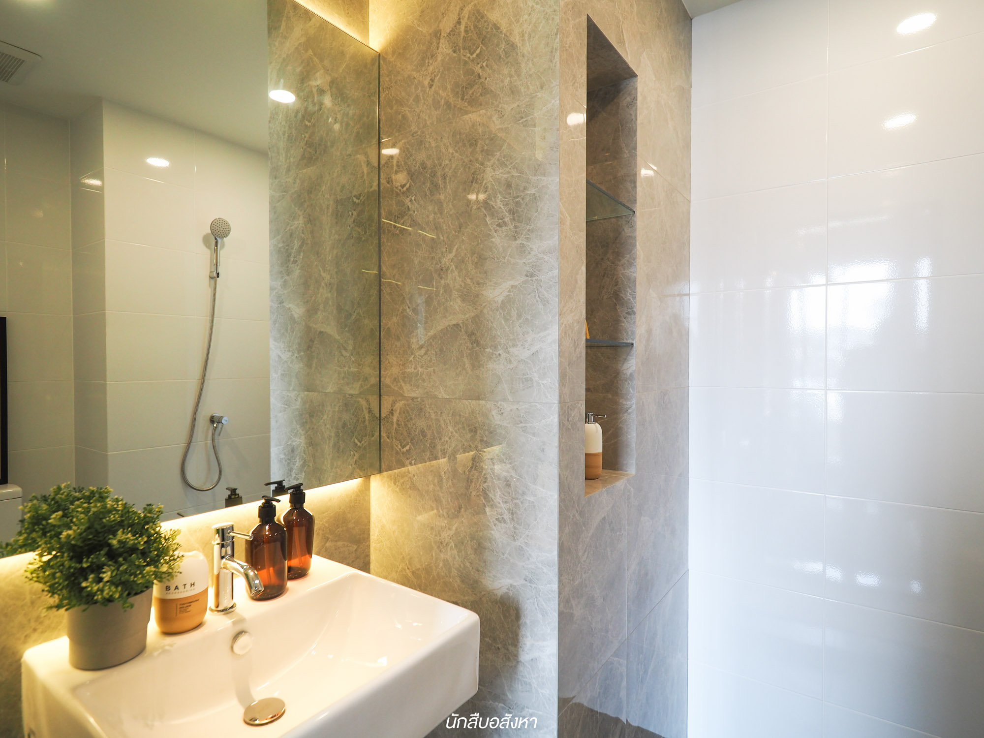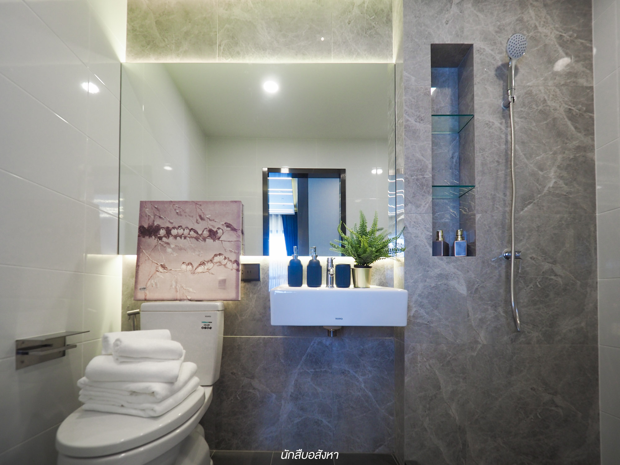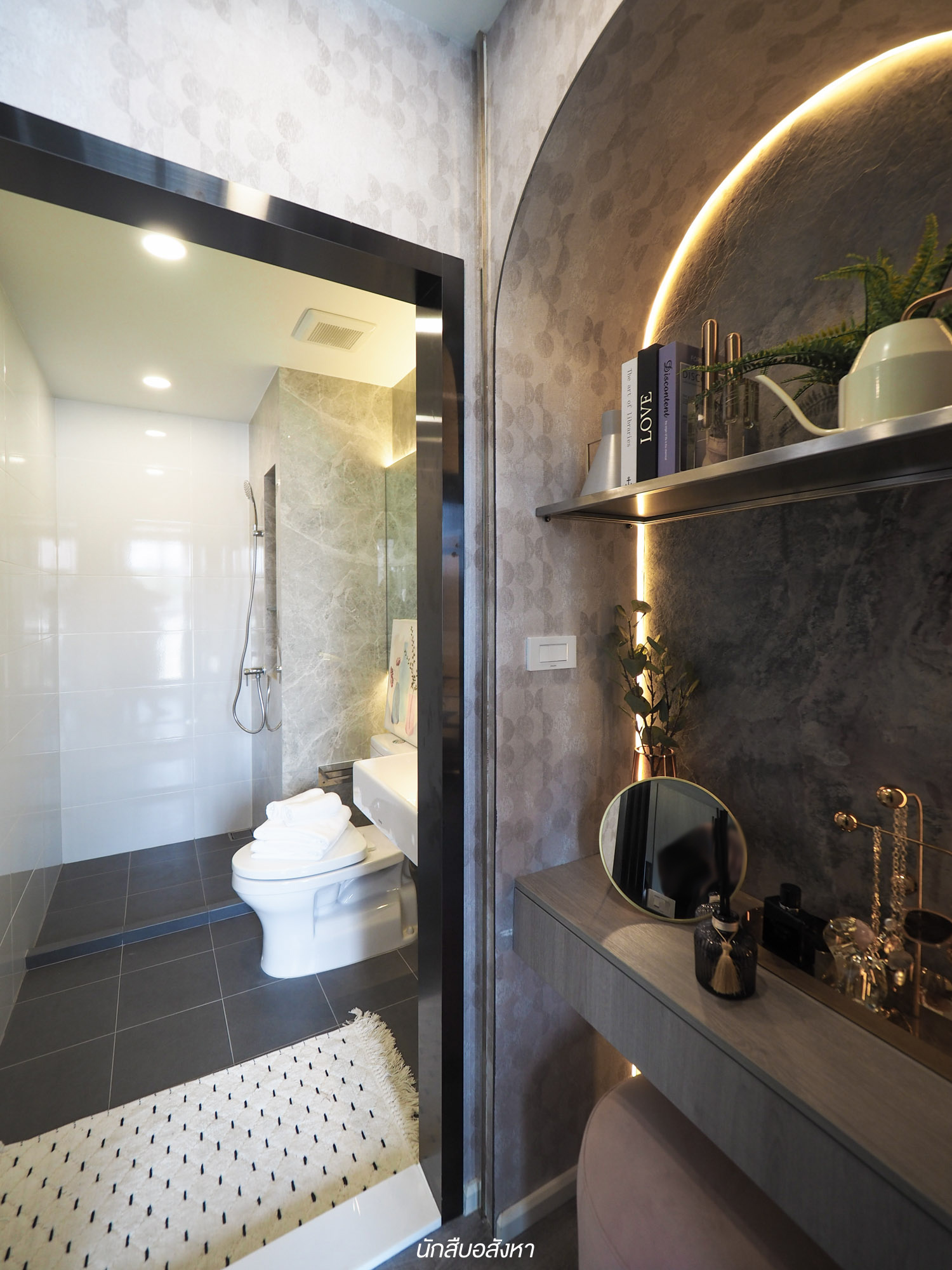 บริเวณหน้าห้องน้ำมีมุม Multipurpose ที่ทางโครงการตกแต่งเป็นมุมแต่งหน้าเอาไว้เป็นไอเดีย ซึ่งผมเองมองว่ามุมนี้สะดวกสำหรับสาวๆ ดีครับ ส่วนห้องน้ำนั้นทางโครงการให้สุขภัณฑ์แบรนด์มาตรฐานมา แบ่งโซนแห้งโซนเปียกเป็นสัดส่วน มีเจาะช่องสำหรับวางของเหมือนห้องก่อนหน้านี้ และมีปลั๊กรองรับเช่นกันครับ