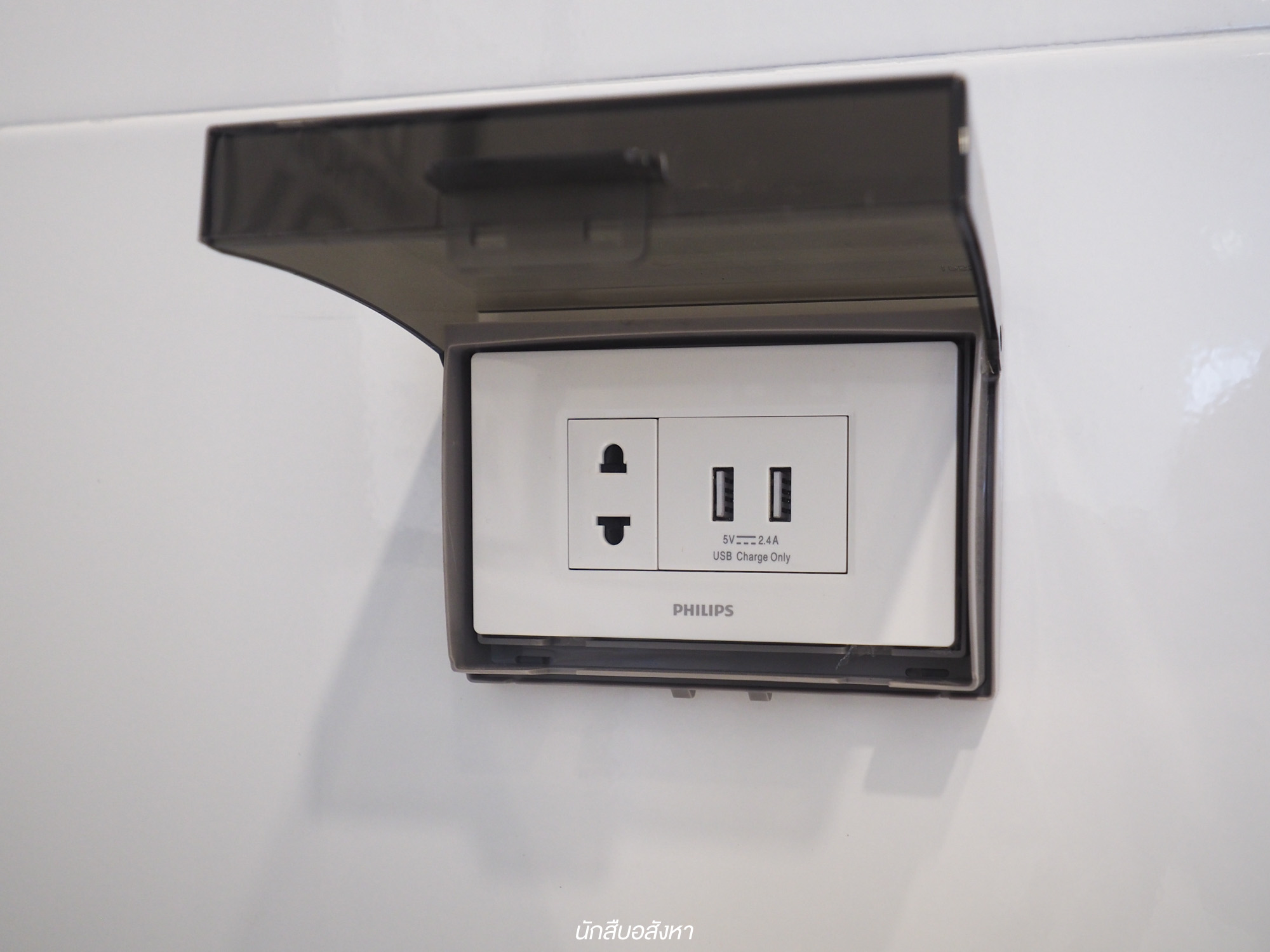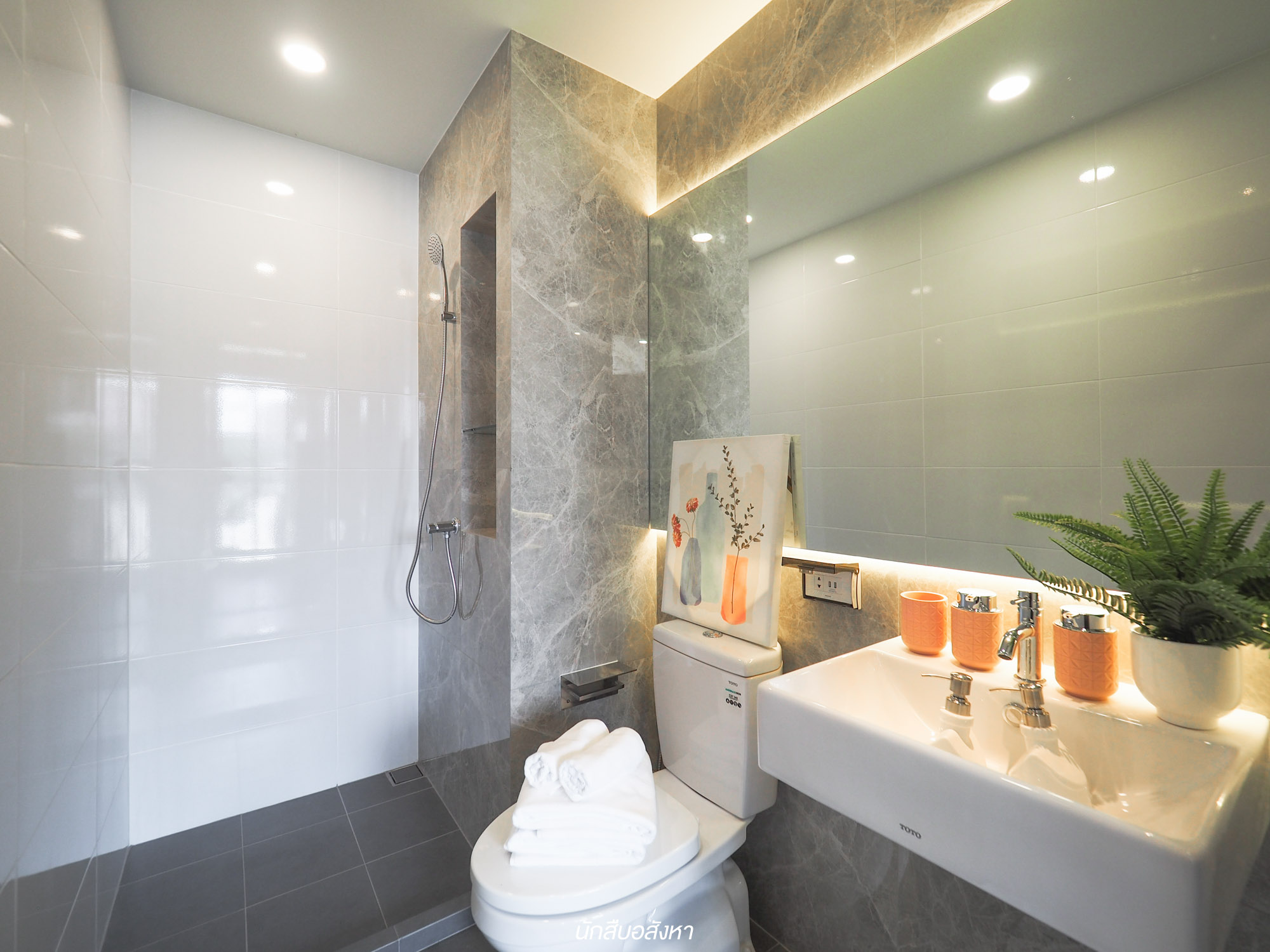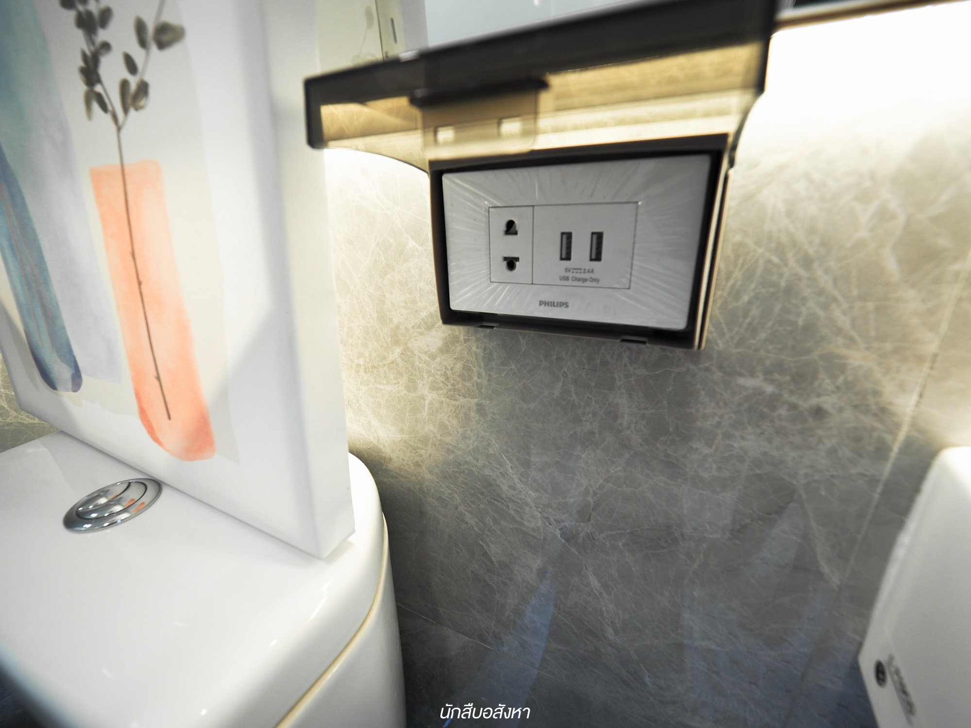 ซึ่งพื้นที่ของ Smart Closet ยังเชื่อมไปยังห้องน้ำ ซึ่งภายในห้องน้ำนั้นมีแบ่งเป็นโซนแห้งโซนเปียก เจาะช่องสำหรับวางของใช้ต่างๆ มาให้เรียบร้อย พร้อมกับมีปลั๊กสำหรับเสียบใช้งานภายในห้องน้ำมาให้ ซึ่งรองรับ USB อีกด้วยครับ
