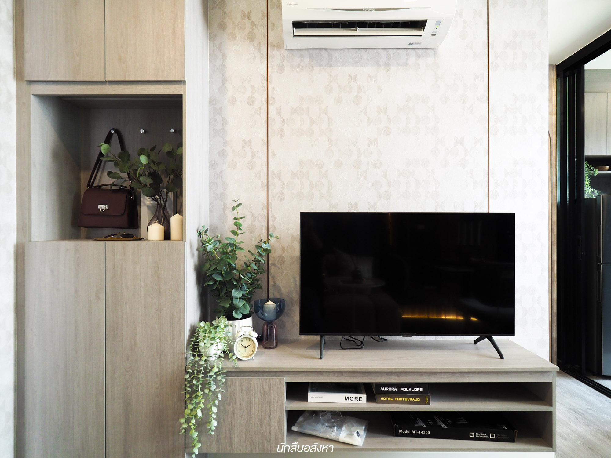 เริ่มกันที่ห้องแรก ซึ่งห้องนี้จะเป็น Unit Plan ขนาดเริ่มต้นของโครงการ ความน่าสนใจของห้อง Type คือการเพิ่มฟังก์ชัน Smart Closet เข้ามาให้ภายในห้อง เรียกได้ว่าเป็นห้องเล็กที่พื้นที่ใช้สอยไม่ได้เล็ก จัดเต็มจริงๆ ครับ