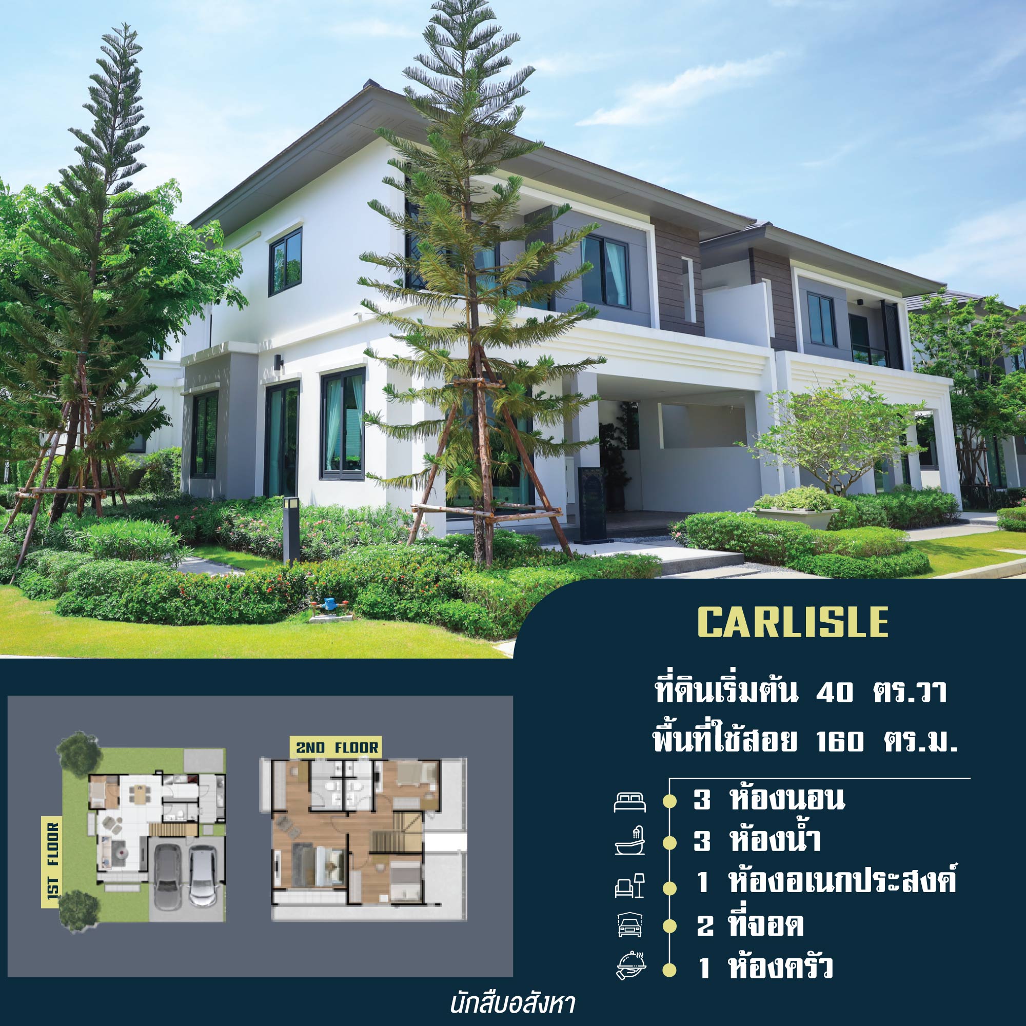 ◾ CARLISLE บ้านแฝด 2 ชั้น ที่ดินเริ่มต้น 40 ตร.วา พื้นที่ใช้สอย 160 ตร.ม. ขนาด 3 ห้องนอน 3 ห้องน้ำ 1 ครัวไทย 1 ห้องอเนกประสงค์ 2 ที่จอดรถ