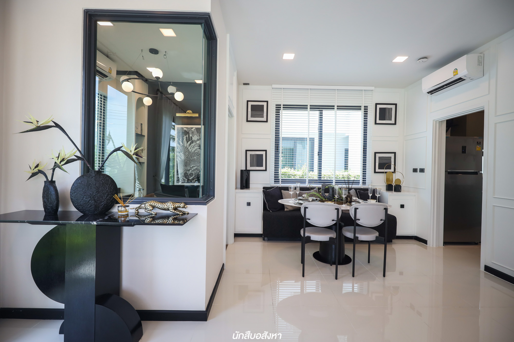 ถ้าเทียบฟังก์ชันระหว่างบ้านแฝดในตลาดอสังหาฯ กับบ้านแฝด CARLISLE บ้านไทป์นี้ให้อารมณ์ไม่เหมือนบ้านแฝดแต่เหมือนบ้านเดี่ยวครับ เริ่มต้นแต่ตัวบ้านที่จะติดกับเพื่อนบ้านแค่ครัวนอกเท่านั้น บ้านหลังนี้จึงค่อนข้างให้ความเป็นส่วนตัวครับ และมีพื้นที่เดินได้รอบบ้าน พื้นที่ด้านหน้า ด้านข้าง และด้านหลัง สามารถครีเอทเป็นมุมต่างๆ ได้ตามไลฟ์สไตล์ และบริเวณโซนจอดรถจะได้ร่มเงาจากส่วนของบ้านที่ยื่นออกมาครับ พอเข้ามาในบ้านผนังเจาะช่องแสงบานใหญ่ เพื่อช่วยดึงแสงภายนอกเข้ามาด้านใน ทำให้บ้านรู้สึกกว้างและโปร่งสบายกว่าบ้านแฝดทั่วไปๆ ระยะการจัดวางเฟอร์นิเจอร์ตามมุมต่างๆ รองรับครอบครัวที่มี 4-5 คน แต่ก็ยังมีระยะห่างที่พอดีสบายไม่อึดอัด