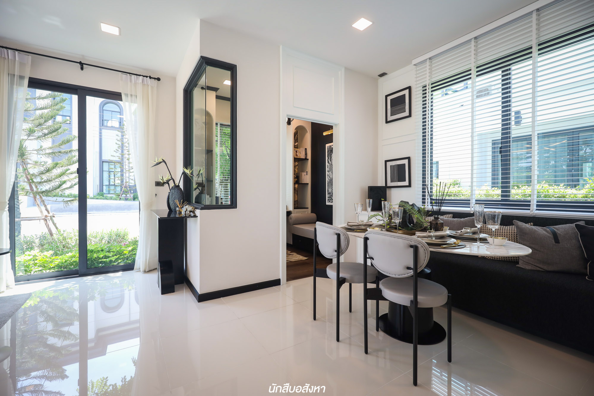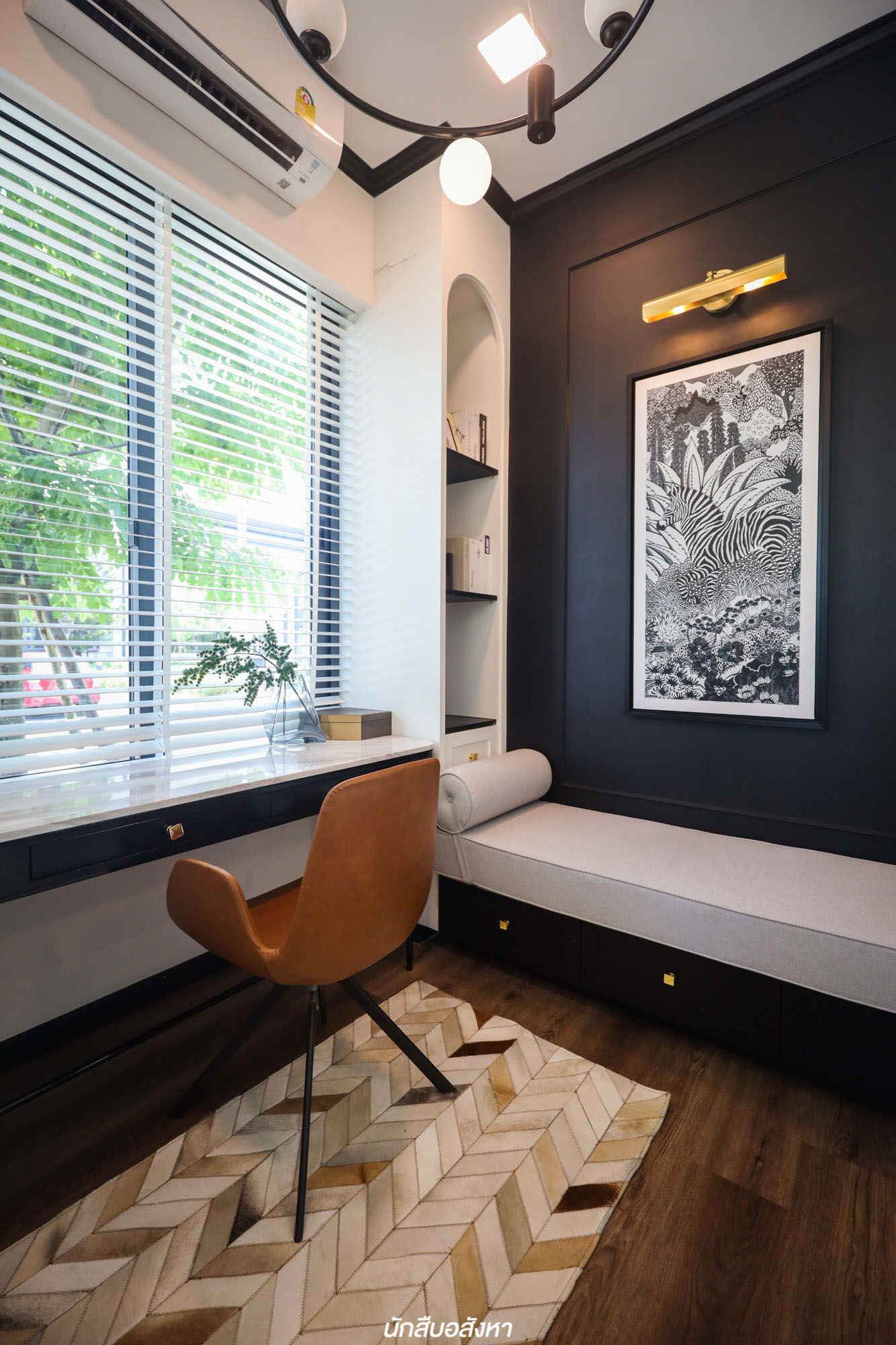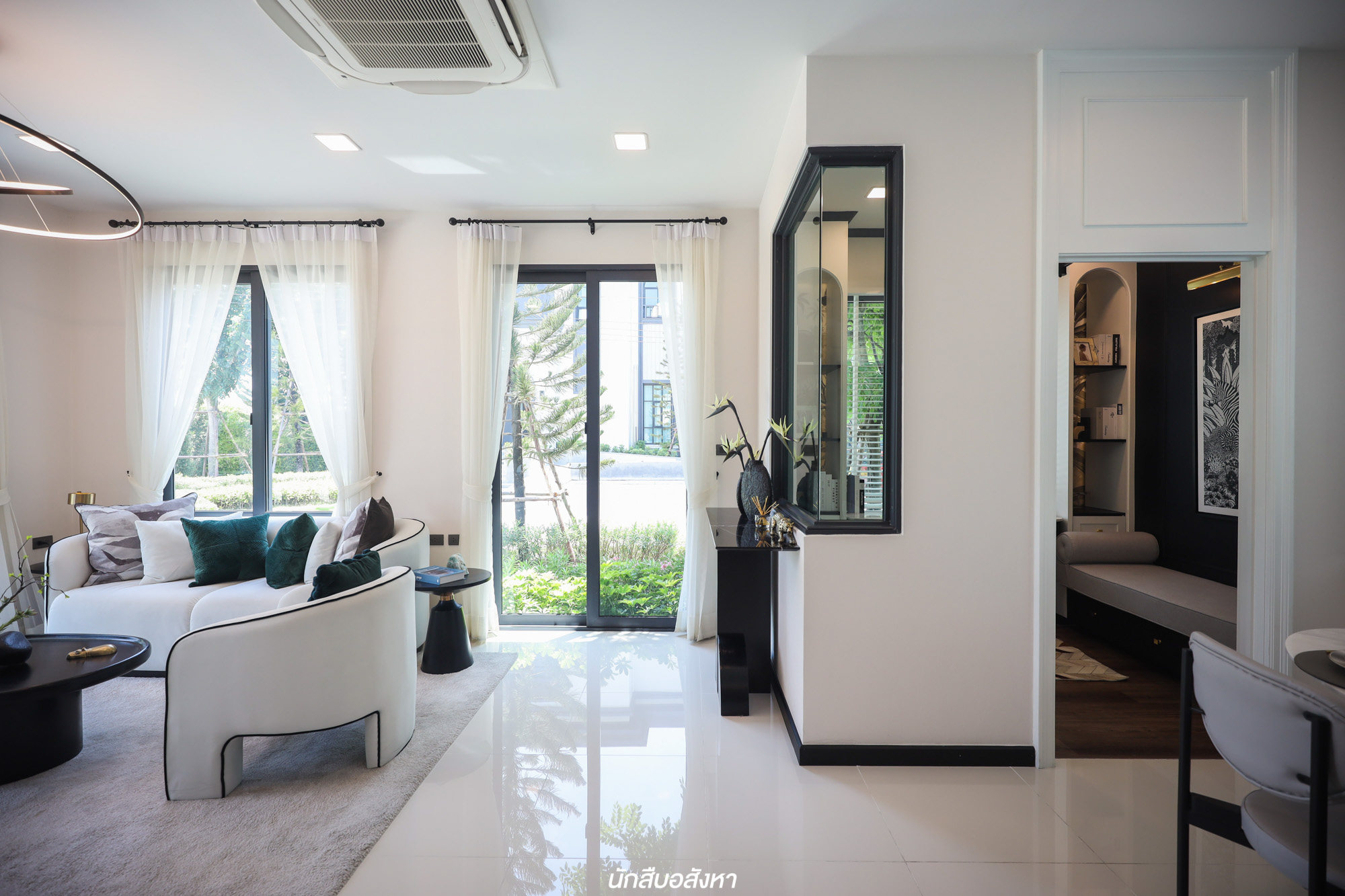 พื้นที่อเนกประสงค์คือจุดเด่นที่สำคัญของบ้านไทป์นี้เลยครับ เพราะเป็นฟังก์ชันที่เพิ่มเข้ามาจากไทป์เริ่มต้น โครงการกั้นห้องไว้ให้เรียบร้อยแล้ว ใส่กระจกเข้ามุมทำให้ห้องดูโปร่ง และหน้าต่างเชื่อมออกข้างนอกมองเห็นสวนด้านข้าง และยังเปิดออกเพื่อถ่ายเทอากาศในห้องนี้ได้ ฉะนั้นห้องนี้ค่อนข้างเหมาะมากที่จะทำเป็นห้องนอนผู้สูงอายุในอนาคต นอกจากทำเป็นมุม Work From Home ตามไอเดียของโครงการ