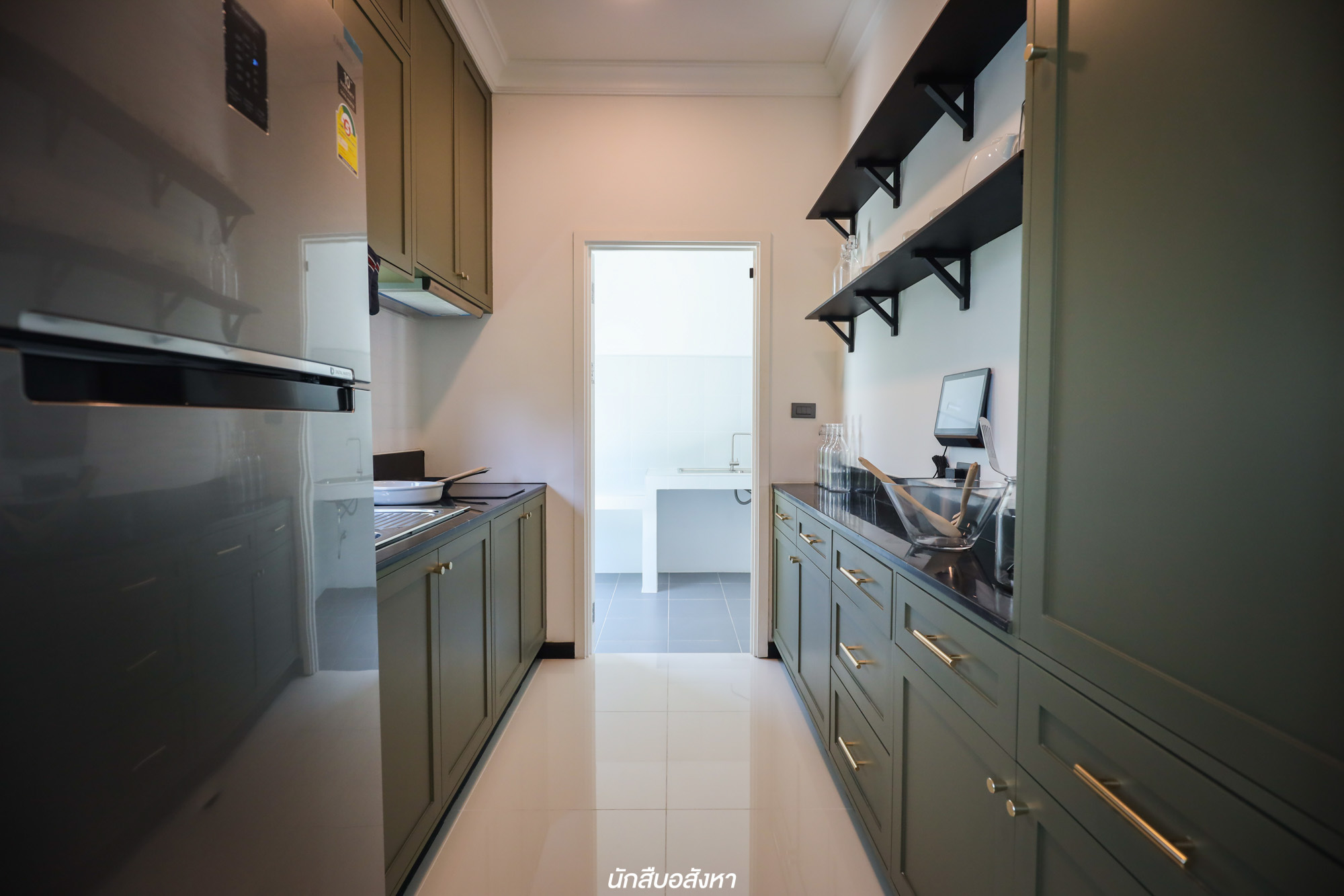 ส่วนพื้นที่ใช้สอยที่สำคัญของบ้านเลย คือห้องครัวครับ ห้องครัวจะเป็นห้องที่ครอบครัวมีการใช้งานมากที่สุด ทั้งเก็บของ ทำอาหาร ที่นี่ทำเป็นห้องครัวปิดขนาดใหญ่ มีการเชื่อมต่อกับครัวไทยที่อยู่นอกบ้าน โดยกั้นทั้งสองมุมอย่างเป็นสัดส่วนครับ ผมมองว่าการออกแบบส่วนครัวทำให้เราใช้งานได้สบายและลื่นไหล มากขึ้น และการออกแบบให้สามารถทำครัวแบบจริงจังด้านนอกได้เต็มที่เป็นฟังก์ชันที่ตอบโจทย์ครัวไทยอย่างแท้จริง บริเวณครัวไทยยังมีการกั้นด้วยกระจกใส เปิดปิดประตูได้ทั้ง 2 ด้าน โดยไม่ต้องทำเพิ่ม