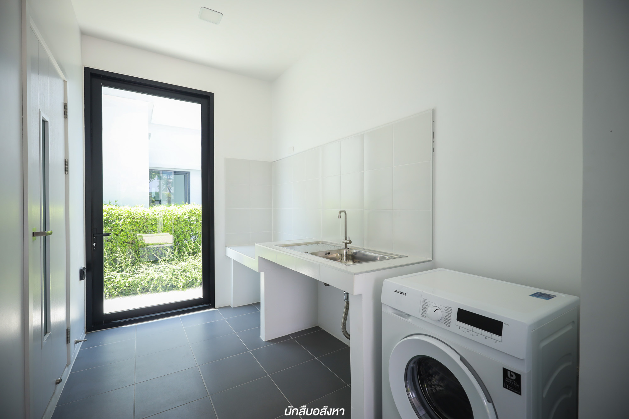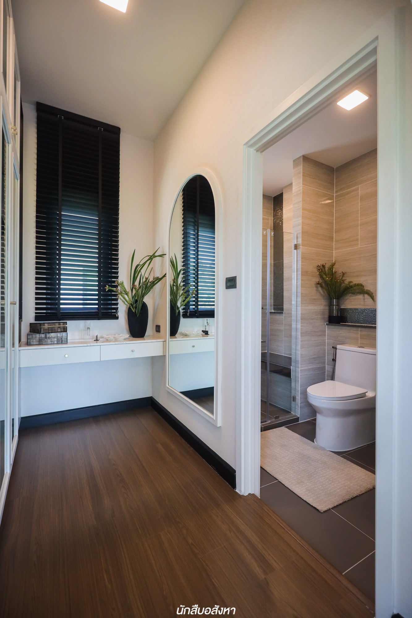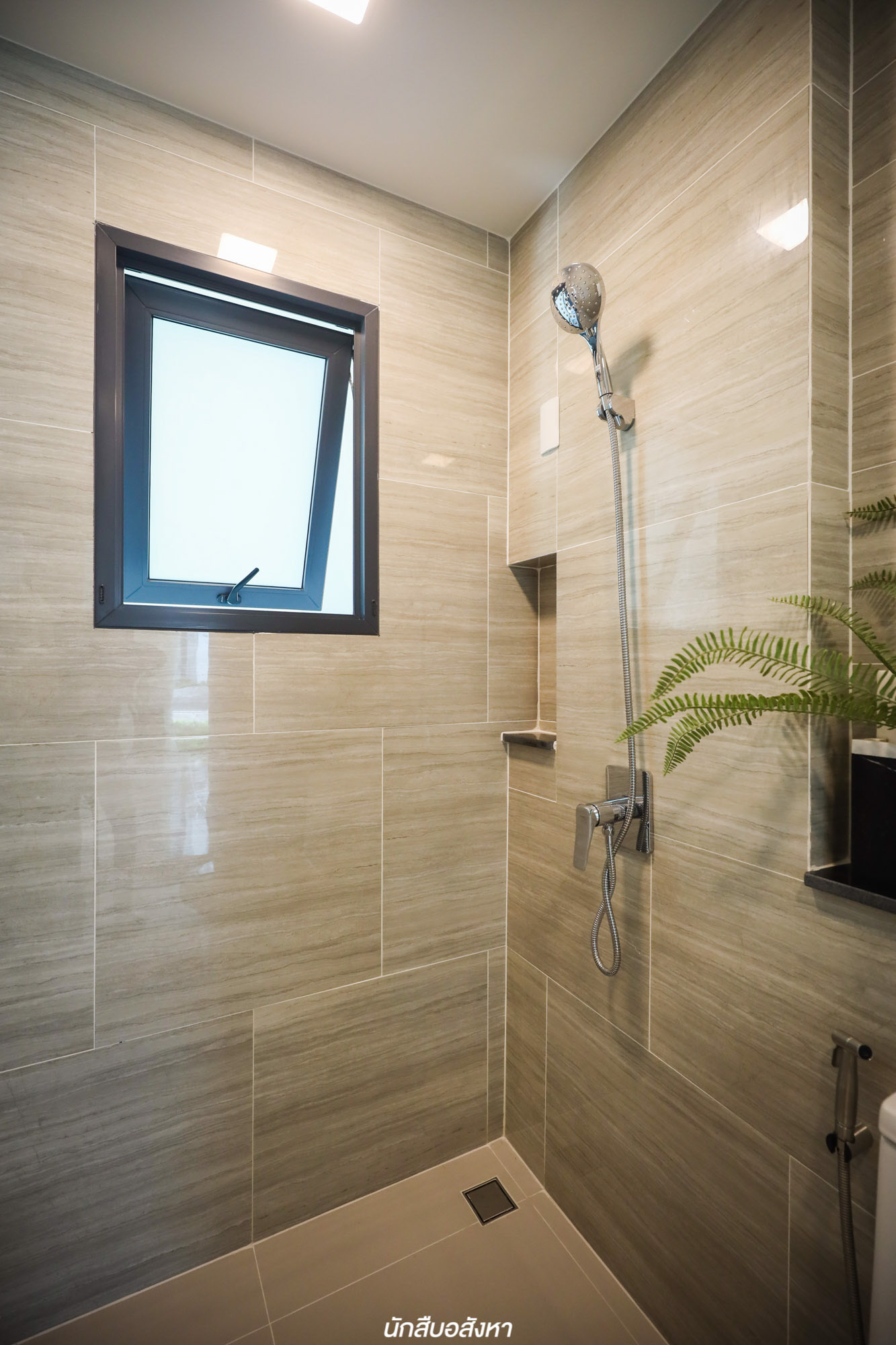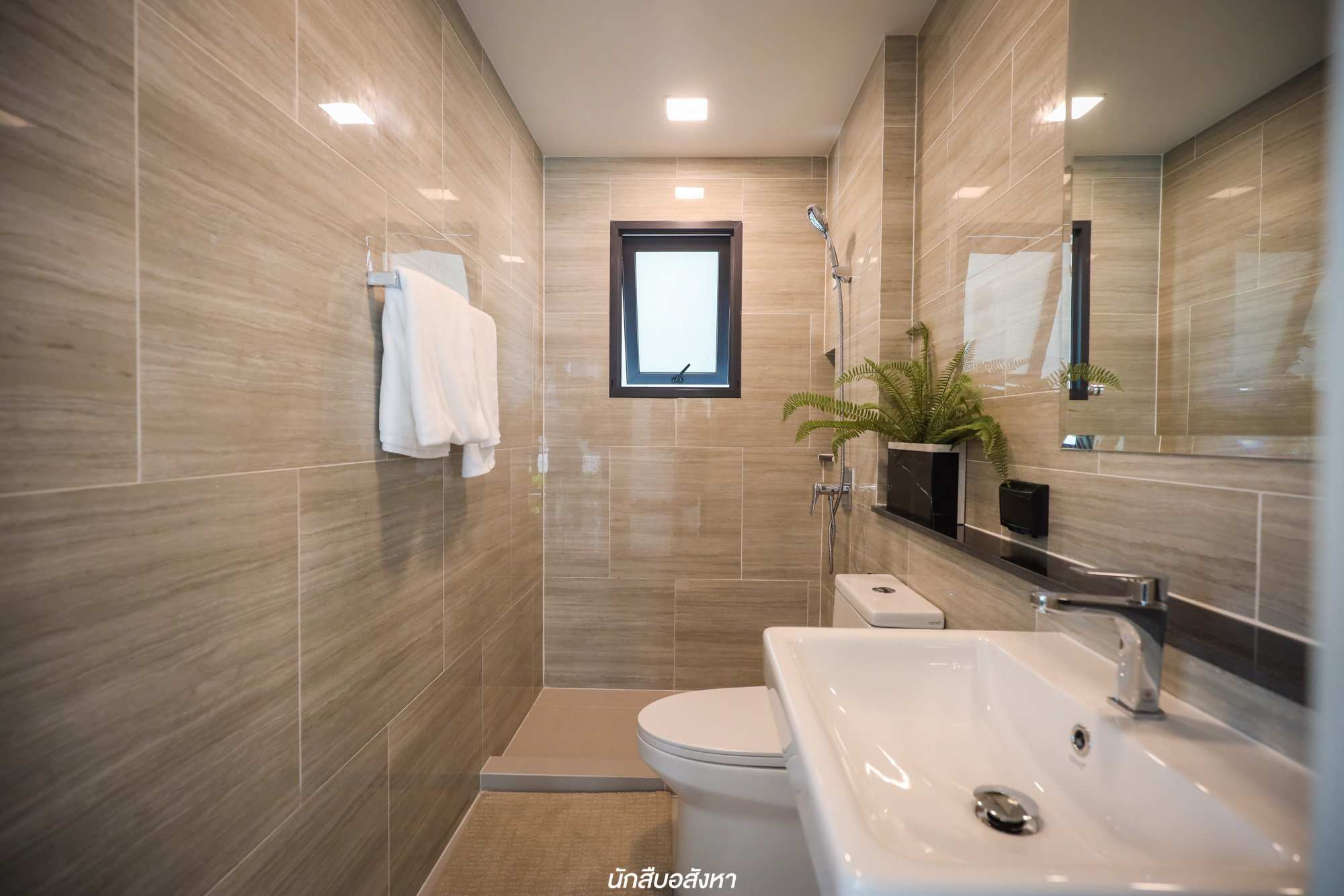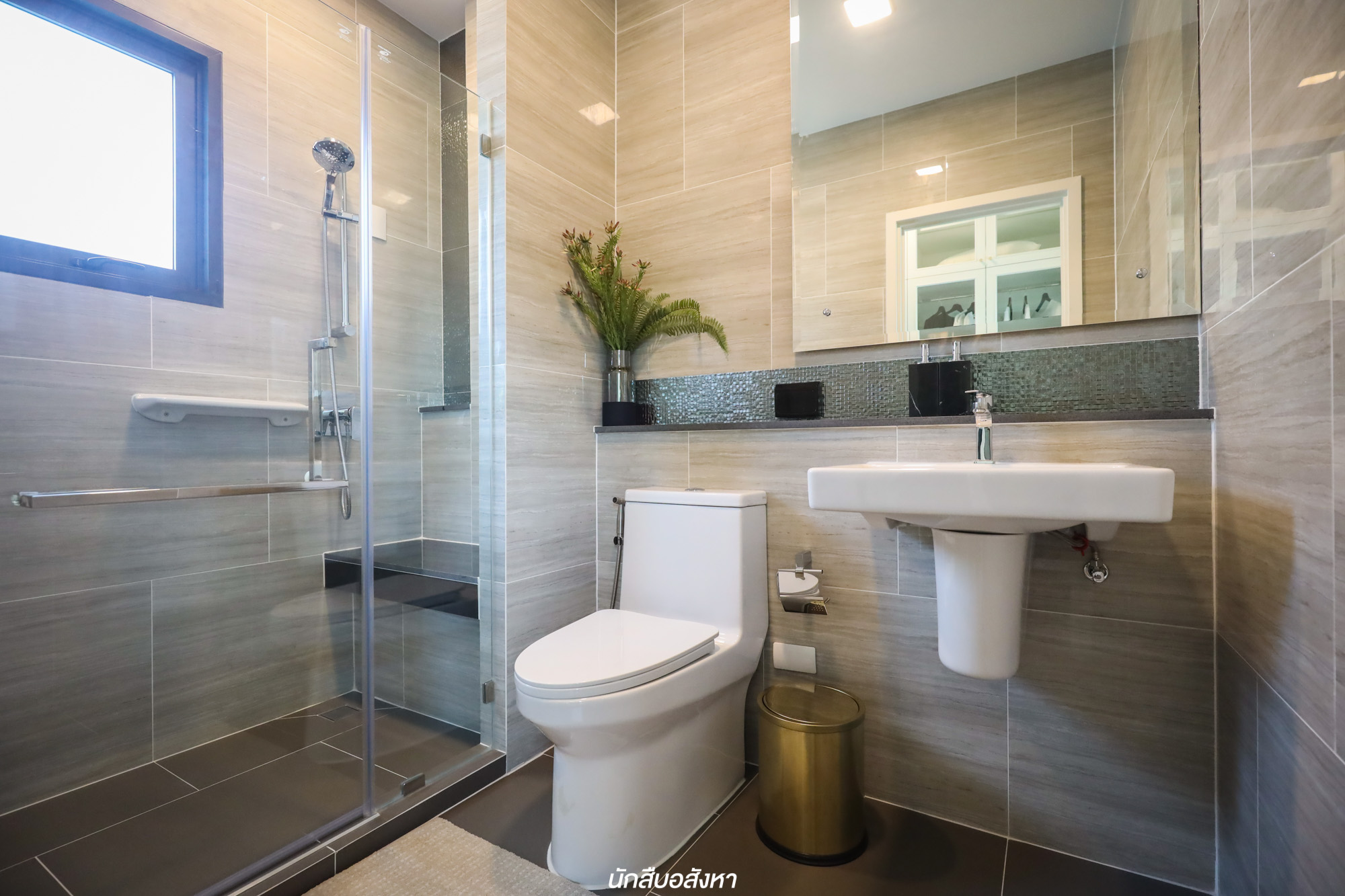 อีกหนึ่งฟังก์ชันที่ดีคือห้องน้ำชั้นล่างถูกออกแบบมาให้มีช่องแสงธรรมชาติกว้าง หน้าต่างบานกระทุ้งสามารถเปิดออกได้ ยิ่งช่วยถ่ายเทอากาศ ช่วยในเรื่องของการลดกลิ่นอับ ลดความชื้นและฟังก์ชันการใช้งานครบสอดรับกับห้องชั้นล่าง ฉะนั้นหากจะทำ Multipurpose Room ให้เป็นอีกหนึ่งห้องนอนก็จะทำให้การใช้งานที่สะดวกสบายขึ้นด้วย