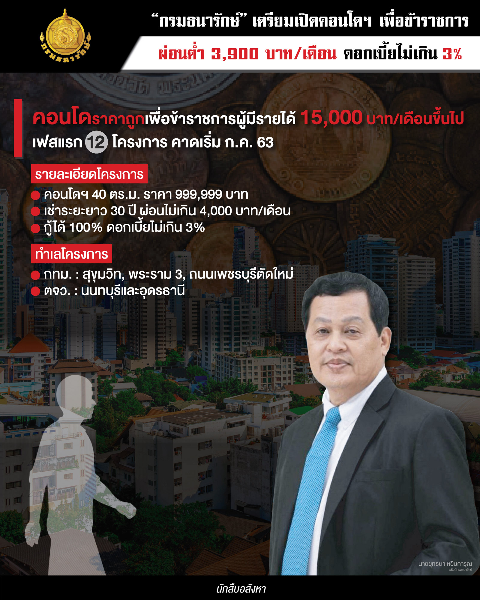 งานนี้ข้าราชการเตรียมเฮกันได้เลยครับ เพราะกรมธนารักษ์เตรียมผุด Project ใหม่ซึ่งเป็นการนำเอาราชพัสดุมาพัฒนาให้เกิดประโยชน์ด้วยการสร้างคอนโดฯ ซึ่งเป็น “คอนโดฯ ราคาถูกเพื่อข้าราชการ” ได้เช่าระยะยาว 30 ปี โดยจะให้ข้าราชการเช่าระยะยาวในสัดส่วน 70% ส่วนที่เหลือจะจัดสรรให้กับข้าราชการกรมธนารักษ์จำนวน 30% และธนาคารอาคารสงเคราะห์จะสนับสนุนสินเชื่อดอกเบี้ยต่ำ 3% ให้ทั้งผู้ประกอบการสร้าง และข้าราชการ โดยให้ กพ. เป็นผู้ร่วมพิจารณาหาผู้มีสิทธิ์เช่าซื้อแต่ละโครงการ
