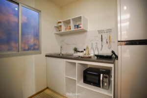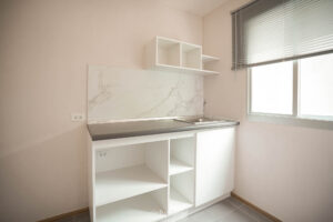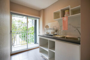 และไฮไลต์คือห้องครัวปิด ที่อยู่ด้านในสุดของห้อง ฝั่งนอกตัวอาคาร มาพร้อมกับชุดซิ้งค์ล้างจาน มีชั้นลอยสำหรับวางของ และพื้นที่ข้างซิ้งค์เหมาะสำหรับทำเป็นที่ประกอบอาหาร และอีกหนึ่งจุดเด่นที่เอาใจสายทำอาหารเอง คือกระเบื้องกันเปื้อน หมดกังวลเรื่องคราบติดผนัง ปูพื้นด้วยกระเบื้อง พร้อมหน้าต่างบานเลื่อนช่วยถ่ายเทอากาศ และกลิ่นออกจากห้อง