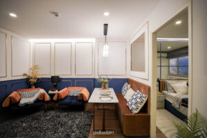 จุดเด่นของห้องพัก คือขนาดเริ่มต้นใหญ่กว่าคอนโดทั่วไป การจัดฟังก์ชันห้องมีทั้งแบบยืดหยุ่นรองรับการปรับเปลี่ยนการใช้งานในอนาคต และอีกแบบที่กำหนดฟังก์ชันชัดเจน เป็นสัดส่วน ต้องบอกว่าการแบ่งฟังก์ชันก็ทำให้ได้พื้นที่ใช้สอยที่คุ้มค่าและใช้งานได้จริง บวกกับเพดานสูง 2.5 ม.ทำให้ห้องโปร่งสบายมากขึ้น กับไฮไลต์ฟังก์ชันคือ 1 ครัวปิดทุกห้อง ทางโครงการแถมเฟอร์นิเจอร์ลอยตัวให้พร้อมใช้งาน จากแบรนด์ IndexLivingmall ที่สามารถมั่นใจถึงคุณภาพ หากเลือกไม่รับเฟอร์ฯ ก็จะได้รับเป็นส่วนลดเพิ่มอีก 40,000 บาท