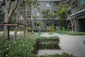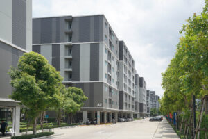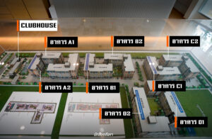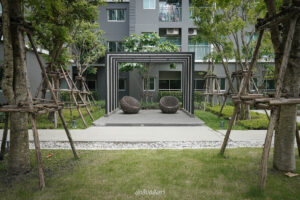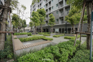 โดยอาคารจะแบ่งออกเป็น 4 กลุ่มอาคาร อาคาร A B C และ D แต่ละอาคารจะมีสวนเป็นของตัวเอง เว้นสเปซตรงกลางไว้ให้ผู้พักอาศัย มีพื้นที่พักผ่อนเน้นให้ธรรมชาติแทรกอยู่ตรงกลาง ทำให้รู้สึกสดชื่น ไม่อึดอัด และในแต่ละอาคารก็จะมีพื้นที่ส่วนกลางรองรับการพักผ่อนของลูกบ้าน ไม่จำเป็นต้องไปใช้คลับเฮาส์ที่เดียว แต่ชั้น 1 ก็จะมีฟาซิลิตี้เล็กๆ เอาไว้นั่งทำงานหรือพักผ่อนได้ โดยเข้ามาใช้บริการได้ตั้งแต่ 6 โมงเช้า ถึง 4 ทุ่ม ซึ่งคนที่ทำงานกลับมาช่วงเย็นก็ยังพอมีเวลาได้ใช้ส่วนกลางได้คุ้มค่ามากขึ้น บวกกับค่าส่วนกลางแค่ 25 บาทต่อตร.ม. ทำให้ช่วยลดค่าใช้จ่ายต่อเดือนได้อีก