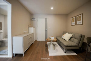 ต่อไปผมจะพาไปดูห้องจริง กับแบบห้อง Studio ขนาดเริ่มต้น พื้นที่ใช้สอย 30 ตร.ม. ที่ลองจัดวางด้วยเฟอร์นิเจอร์ลอยตัวที่โครงการให้มา ประกอบไปด้วย