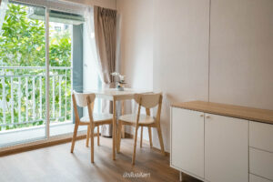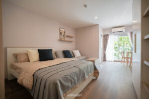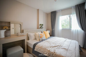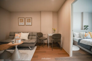 สำหรับใครที่ต้องการความเป็นสัดส่วน มีการแบ่งโซนอย่างชัดเจน แนะนำไทป์นี้ครับ ฟังก์ชัน 1 ห้องนอน 1 ห้องน้ำ และ 1 ห้องครัวปิด แยกโซนพื้นที่นั่งเล่นกับห้องนอนออกจากกัน ทั้งยังได้พื้นที่ใช้สอยมากขึ้น ซึ่งห้องนี้ก็มาพร้อมเฟอร์นิเจอร์แบบพร้อมอยู่เช่นกันครับ