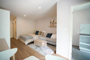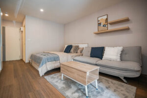 ถัดเข้ามาคือส่วนของพื้นที่ห้องนอน และโซนนั่งเล่น ออกแบบแบบ Open plan เป็นพื้นที่พักอาศัย อยู่ตรงกลางระหว่างห้องน้ำกับห้องครัวปิด มีขนาดกำลังพอดี สามารถวางเฟอร์นิเจอร์ได้อย่างไม่รู้สึกอึดอัด อีกทั้งยังเหลือพื้นที่บริเวณเชื่อมไปยังระเบียงด้านที่สามารถวางชุดโต๊ะกับเก้าอี้ได้สบาย ๆ