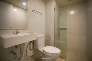 โดยรวม Layout ห้องเป็นแบบตอนลึกเข้าไป ง่ายต่อการจัดวางเฟอร์นิเจอร์ เมื่อเข้ามาภายในห้อง จะเจอกับห้องน้ำก่อนเป็นอย่างแรก โดยมีการแบ่งโซนเป็น 2 ฝั่ง กั้นด้วยกระจกใสแบบไม่เต็มบานระหว่างฝั่งอาบน้ำกับฝั่งโถสุขภัณฑ์ ทำให้พื้นที่ภายในไม่อึดอัดจนเกินไป
