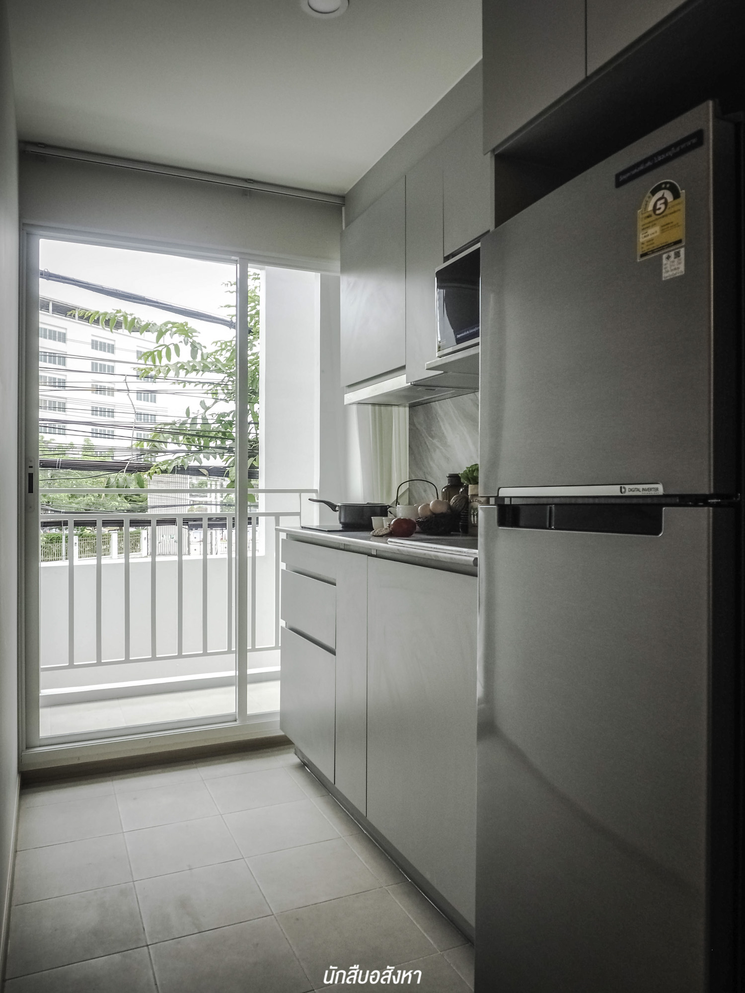 ถัดเข้าไปจะเจอกับครัวที่ติดกับระเบียง ต้องบอกก่อนว่าทางโครงการไม่ได้ให้ประตูกั้นส่วนครัวมาให้ แต่ผู้พักอาศัยสามารถติดประตูกั้นได้ เพื่อป้องกันปัญหาเรื่องกลิ่น ระหว่างการประกอบอาหารครับ