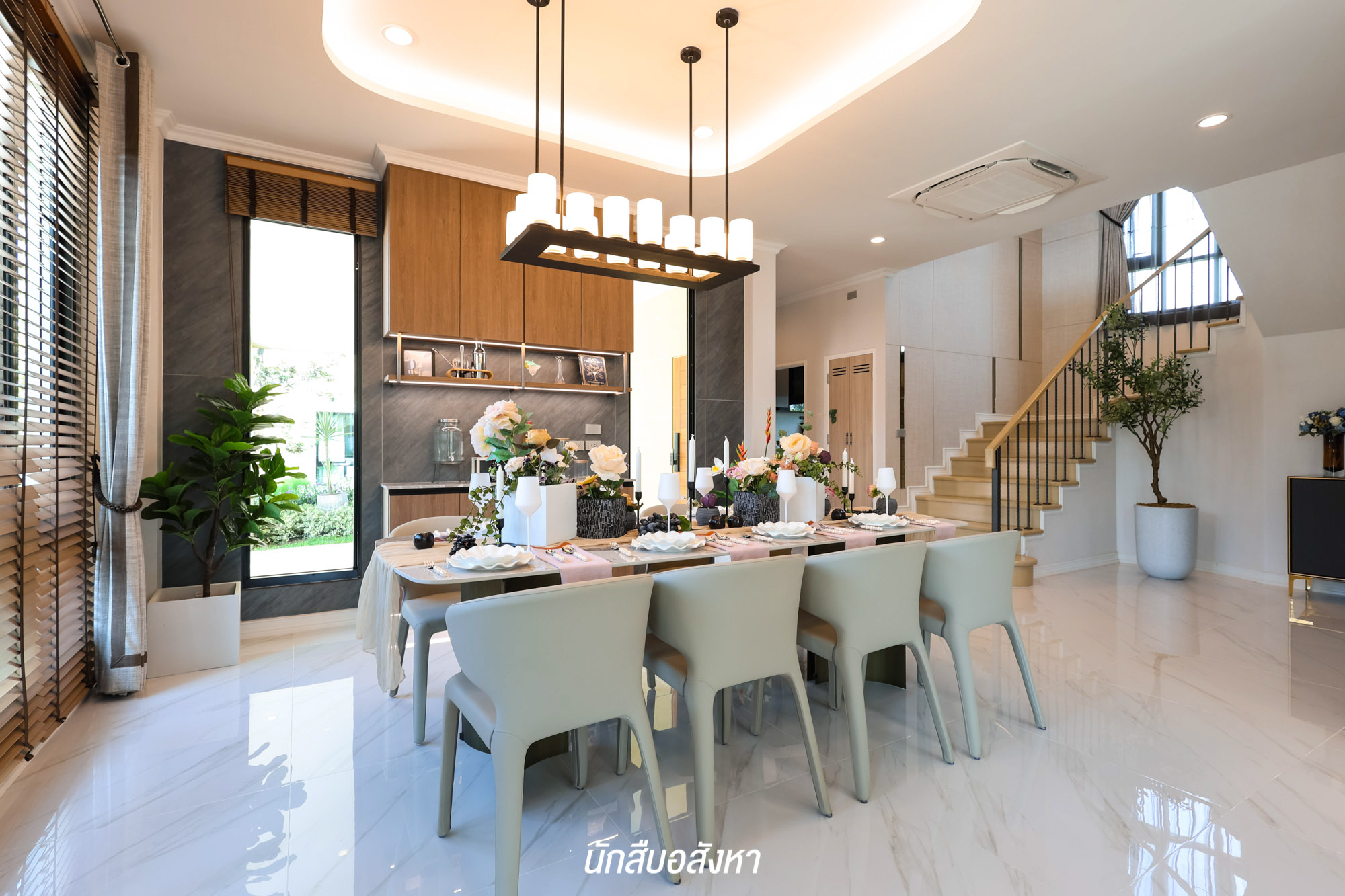 เมื่อเข้ามาภายในตัวบ้าน ชั้นล่างจะเป็นพื้นที่ Open Plan ทุกพื้นที่เชื่อมต่อถึงกันโดยไม่มีผนังกั้น ทำให้สามารถจัดวางฟังก์ชันได้อย่างอิสระ ตามไลฟ์สไตล์ของผู้พักอาศัย โดยความสูงเพดานจะอยู่ที่ 2.8 เมตร และปูพื้นด้วยกระเบื้องแกรนิตโต้