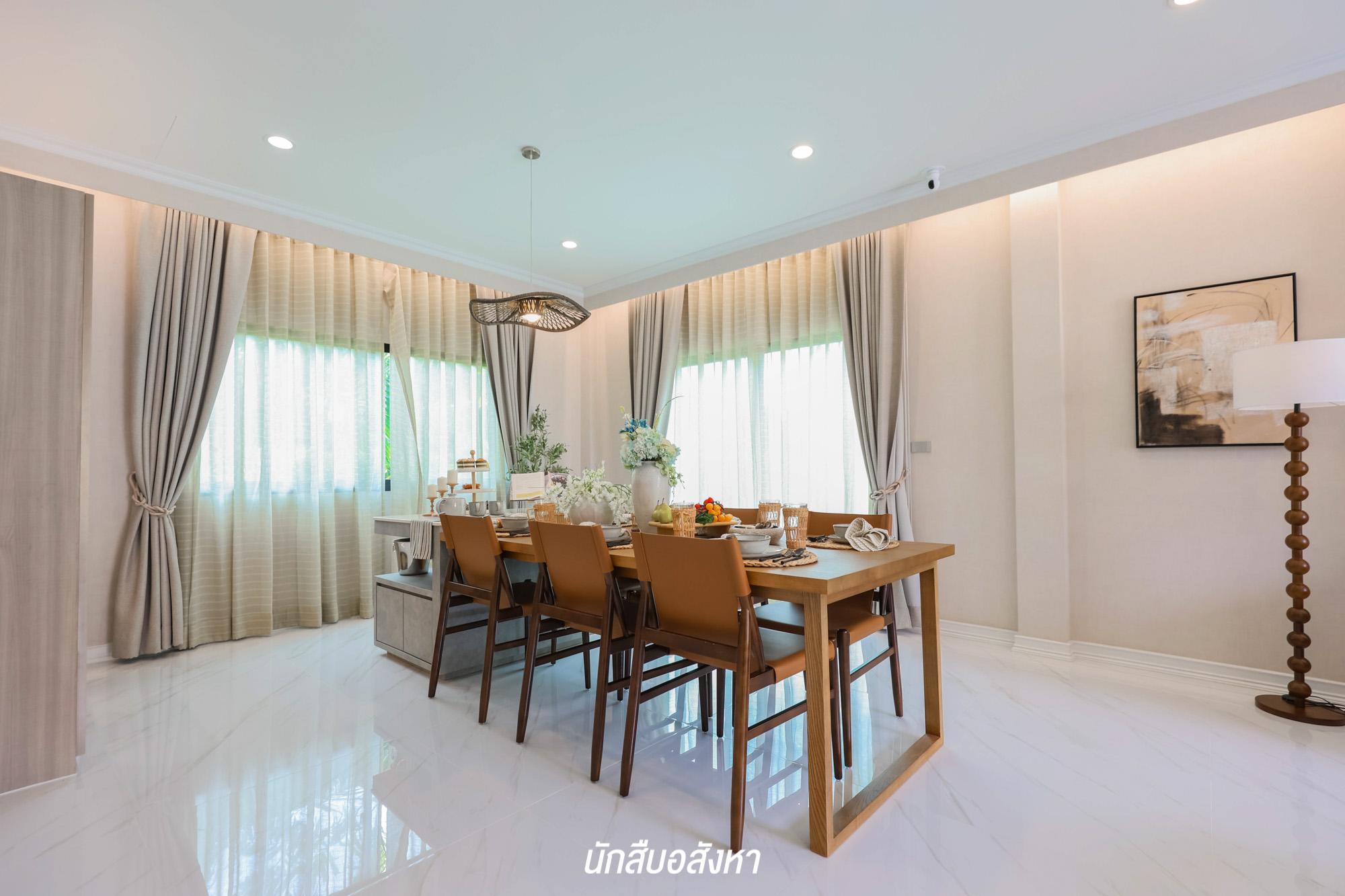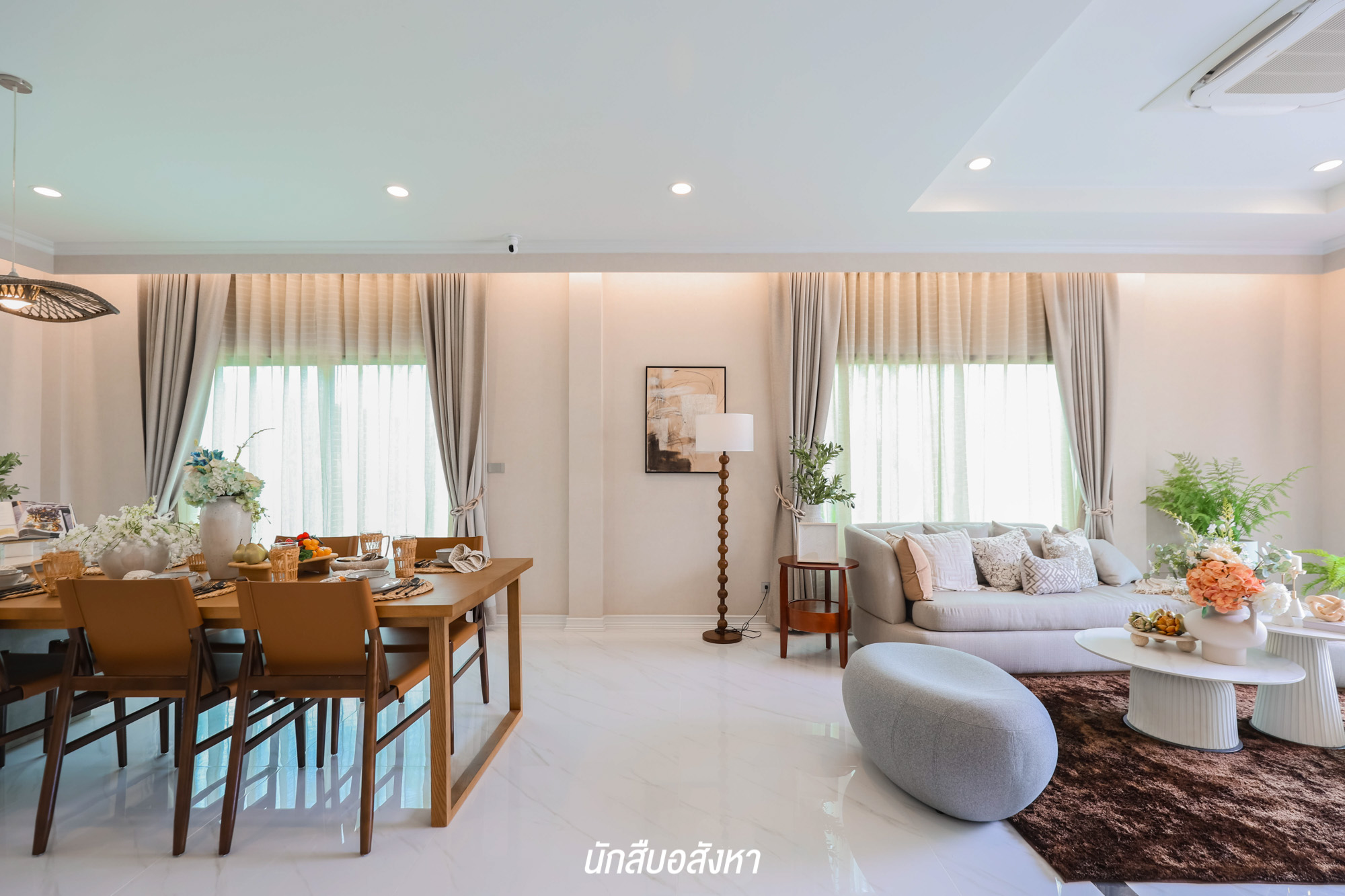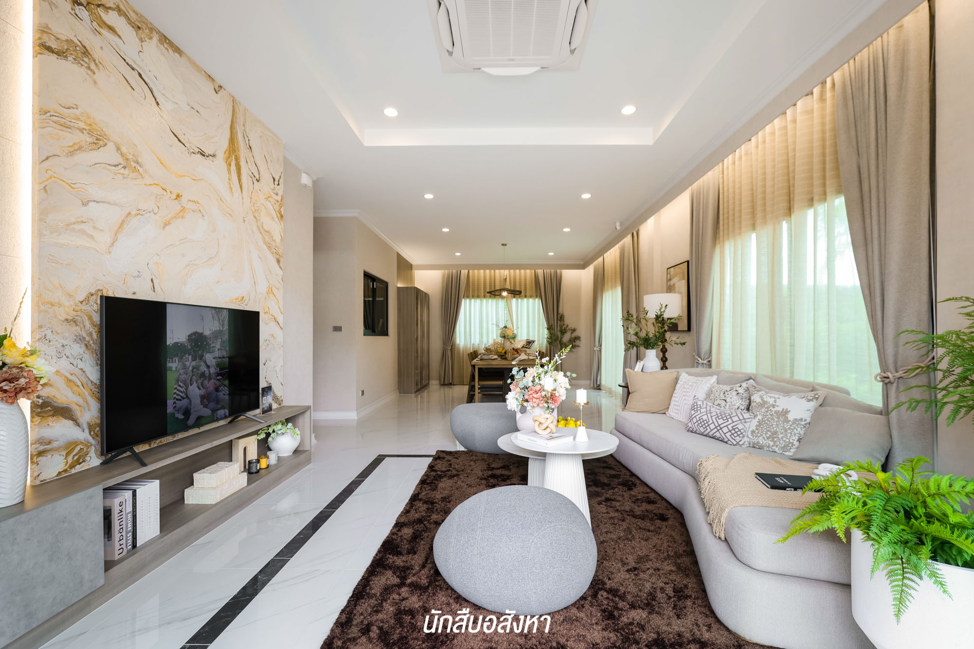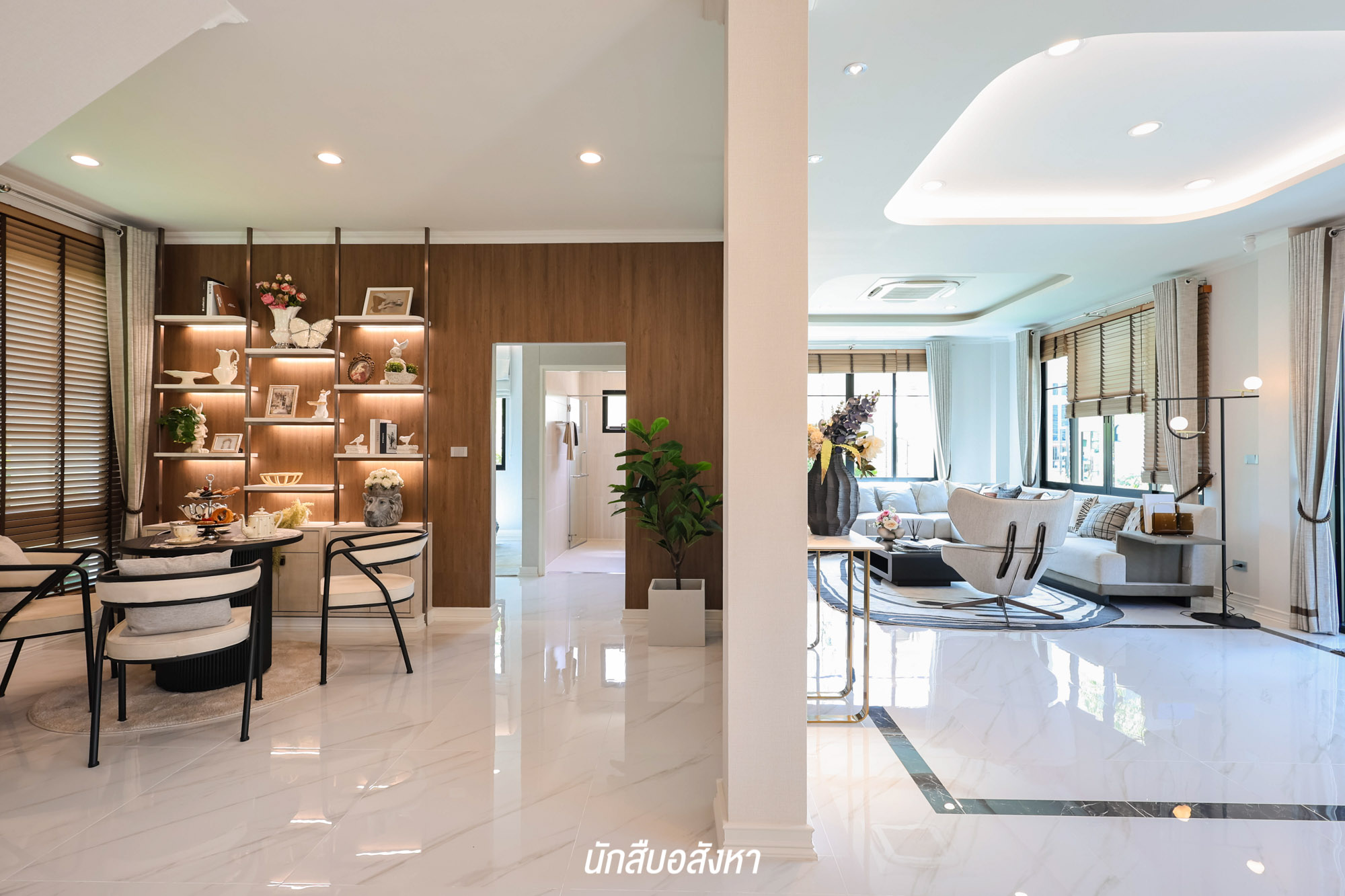 คล้ายกันกับบ้านหลังแรกครับ เข้ามาจะเจอกับพื้นที่ Open Plan ทุกพื้นที่เชื่อมต่อถึงกันโดยไม่มีผนังกั้น สามารถจัดวางฟังก์ชันได้อย่างอิสระ โดยภายในตัวบ้านชั้น 1 ปูพื้นด้วยกระเบื้องแกรนิตโต้ และความสูงเพดานจะอยู่ที่ 2.8 เมตร
