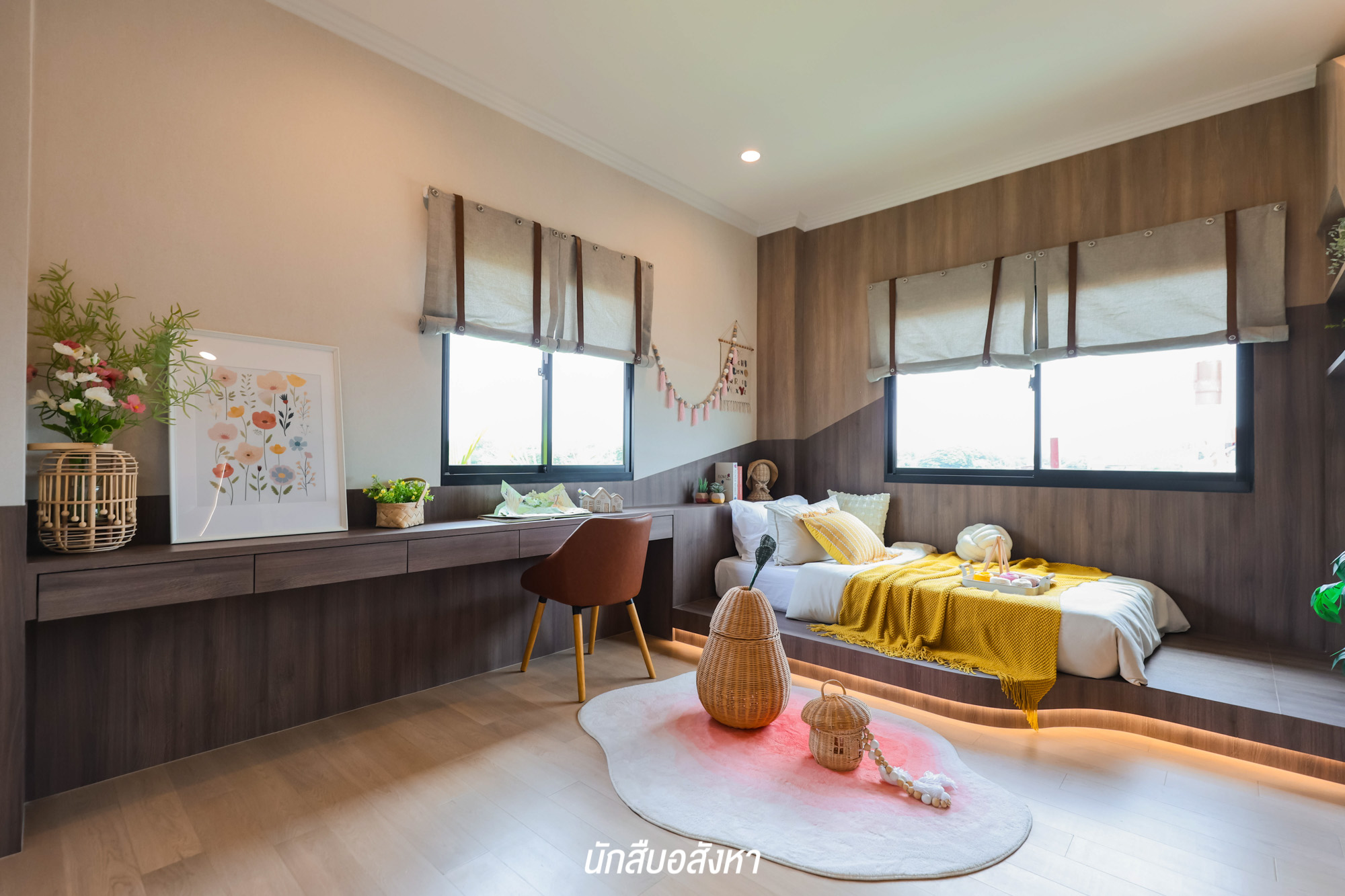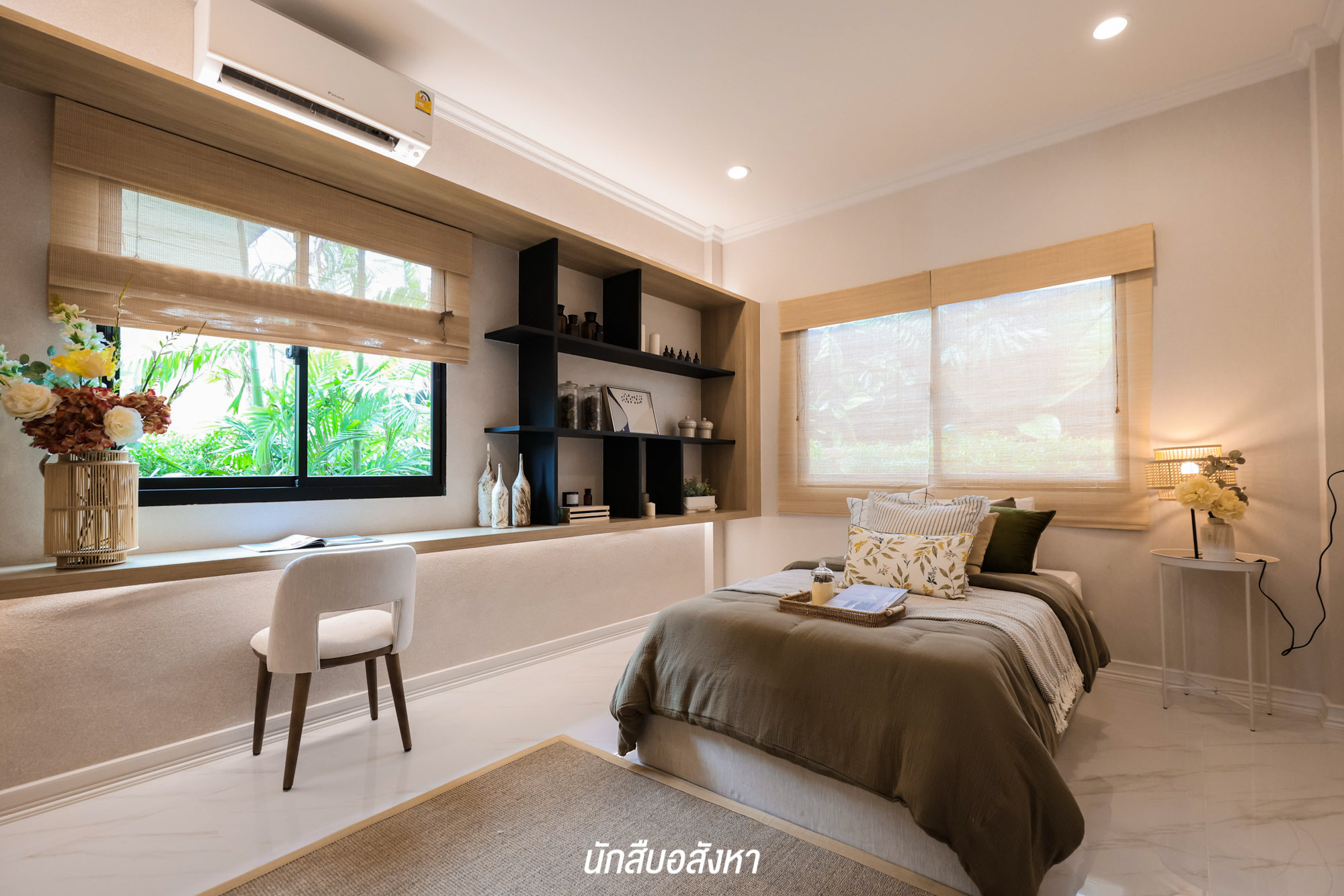 ห้องนอนชั้นล่าง ซึ่งกว้างมากพอที่จะวางเตียงขนาด 5 – 6 ฟุต ได้ โดยที่ยังมีพื้นที่เหลือรอบเตียงให้ใช้งานได้สบาย ๆ สามารถปรับเปลี่ยนให้เป็นห้องนอนของผู้สูงอายุได้ครับ