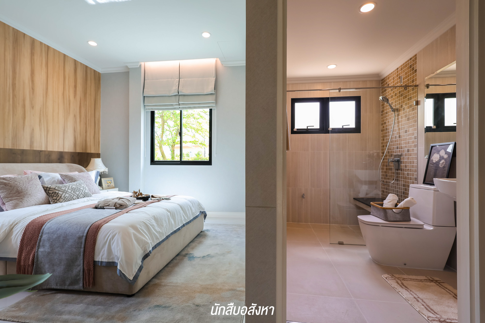 และติดกันเลยจะเป็นห้อง Master Bedroom วางเตียงขนาด 6 ฟุตได้สบาย โดยที่ยังมีพื้นที่รอบเตียงเหลือให้ใช้งานได้สะดวก