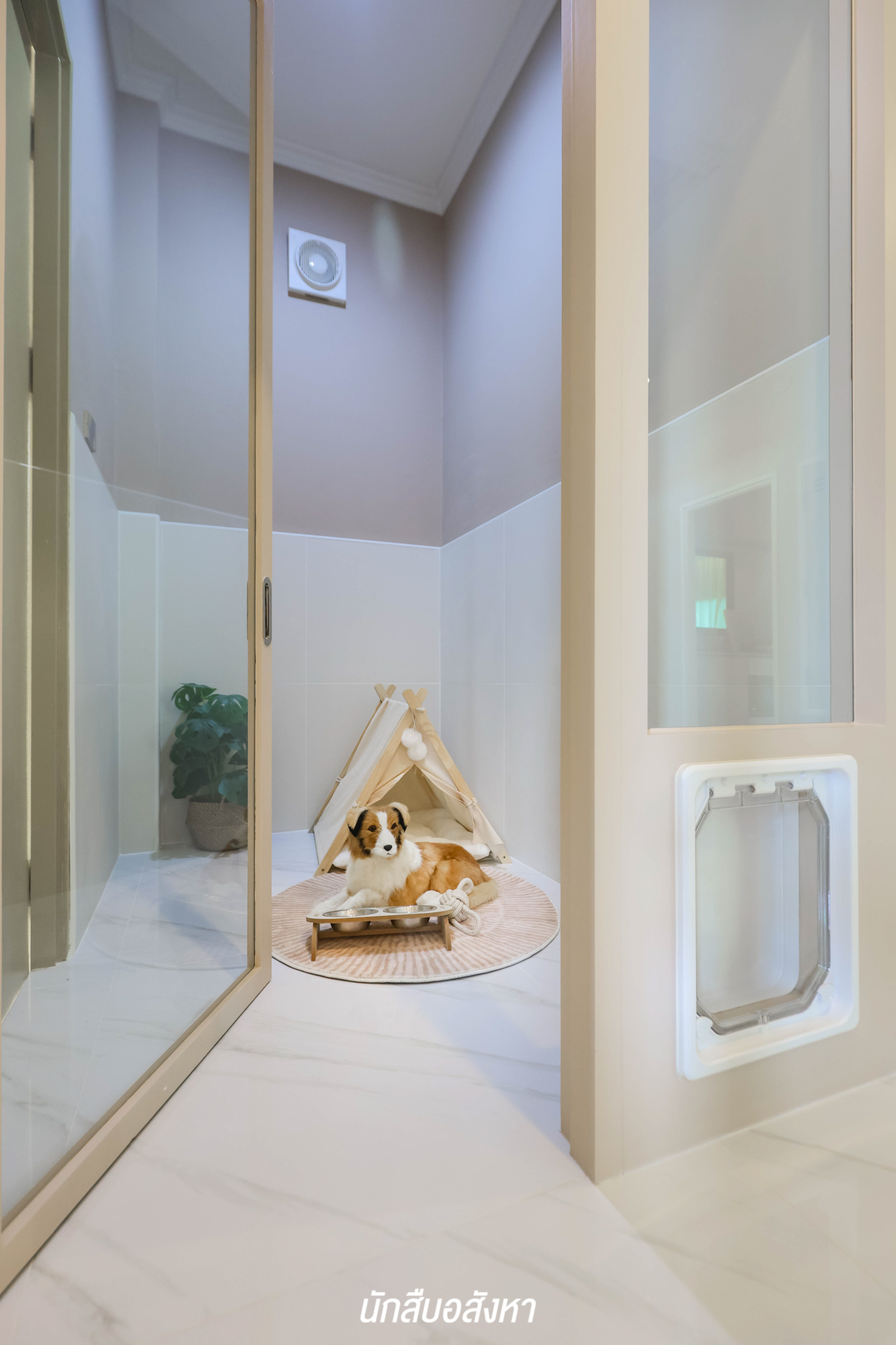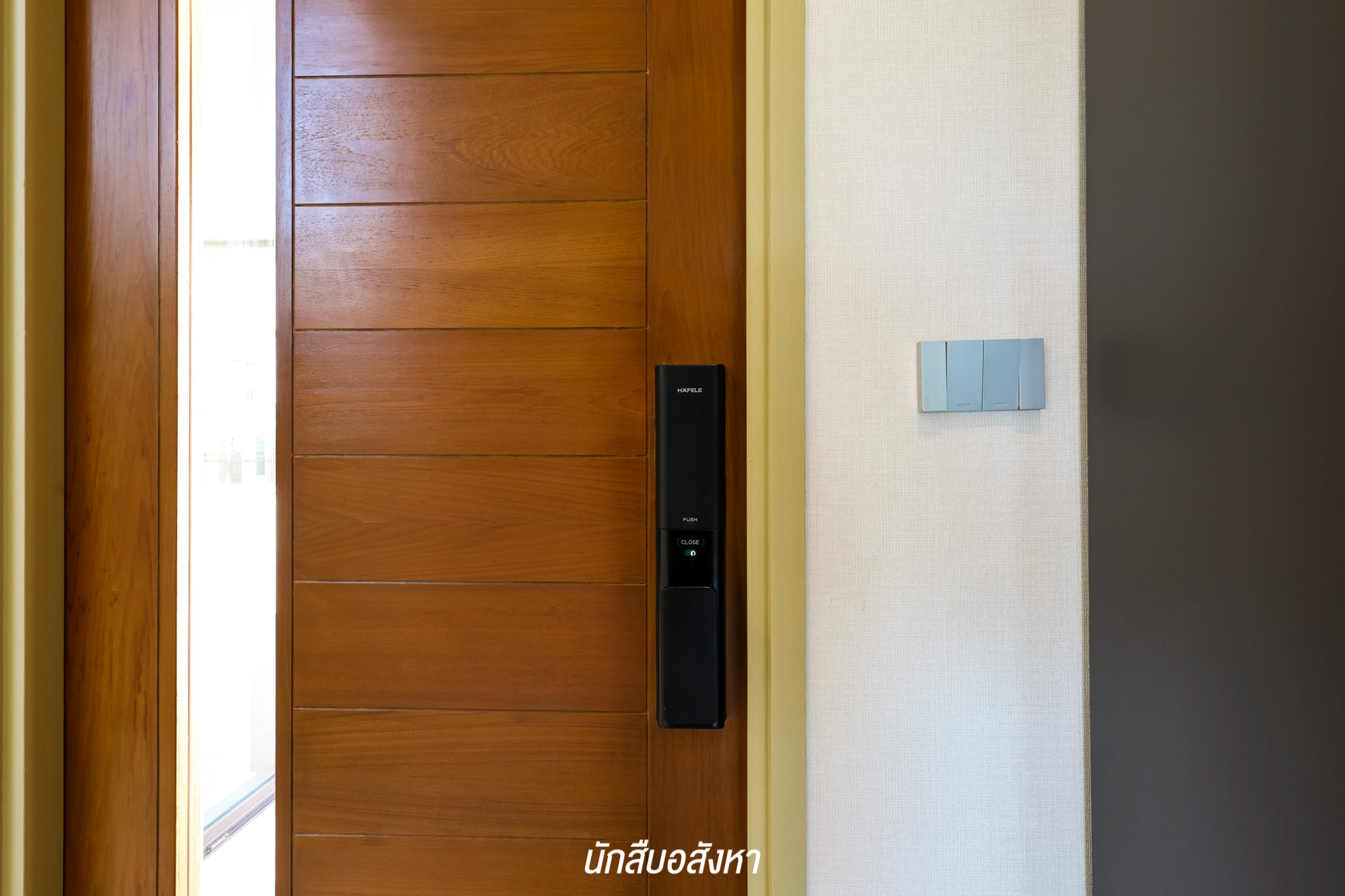 ส่วนประตูบานเล็กที่เข้าจากพื้นที่จอดรถ ก็จะมีการติดตั้ง Digital Door Lock มาให้เช่นเดียวกัน ทำให้มีความสะดวกและปลอดภัยในการใช้งานมากขึ้น ส่วนประตูทางเข้าหลัก เป็นประตูกระจกบานเลื่อนแบบ 4 ตอน เลื่อนอิสระได้ทุกบาน ซึ่งก็มีขนาดใหญ่พอสมควร มาพร้อมกับ Magnetic & Shock Sensor เพื่อความปลอดภัยเช่นเดิม