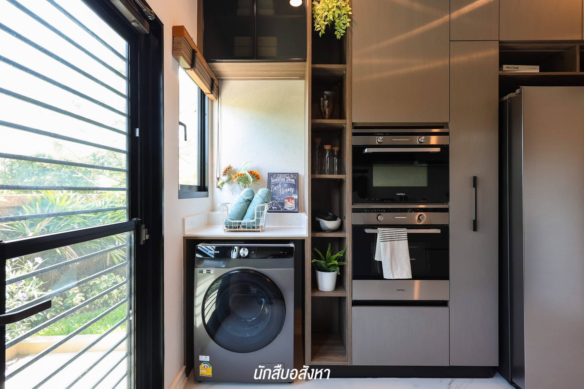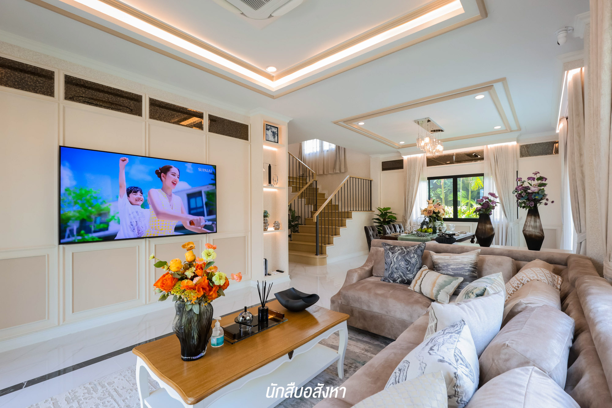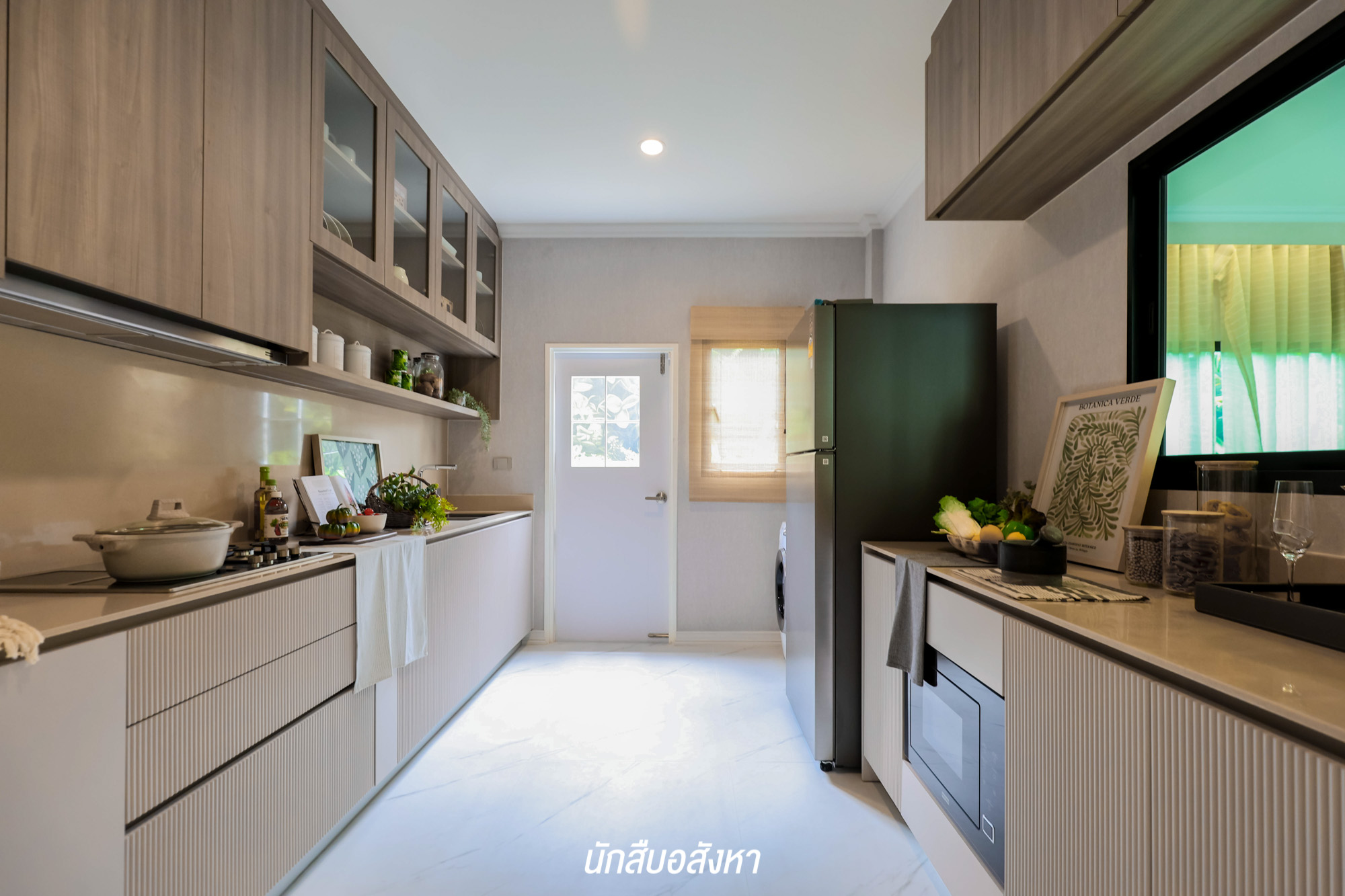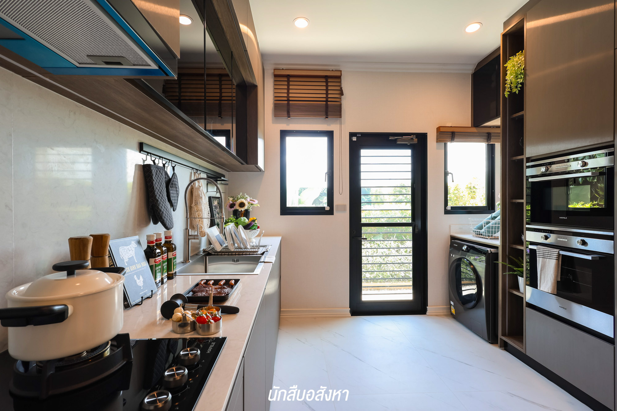และสำหรับห้องครัว ของจริงเป็นห้องโล่ง ๆ สามารถ Built – in เคาน์เตอร์ครัว I-Shape ได้ ซึ่งก่อนขึ้นชั้น 2 แวะบริเวณกลางบ้านตรงหน้าโถงบันได ให้พื้นที่ค่อนข้างกว้าง สามารถจัดเป็นมุมพักผ่อนเหมือนบ้านตัวอย่าง + ห้องเก็บของใต้บันได ส่วนบันไดเป็นโครงสร้างคอนกรีตเสริมเหล็ก ปิดผิวด้วยไม้ประสานปิดผิวไม้โอ๊ค