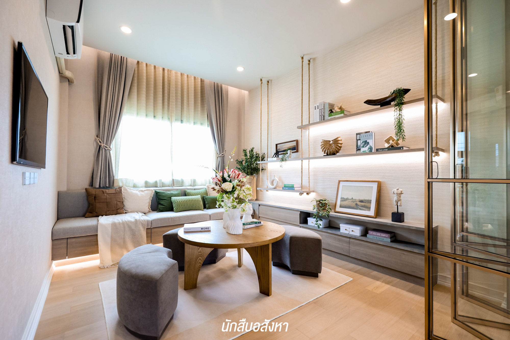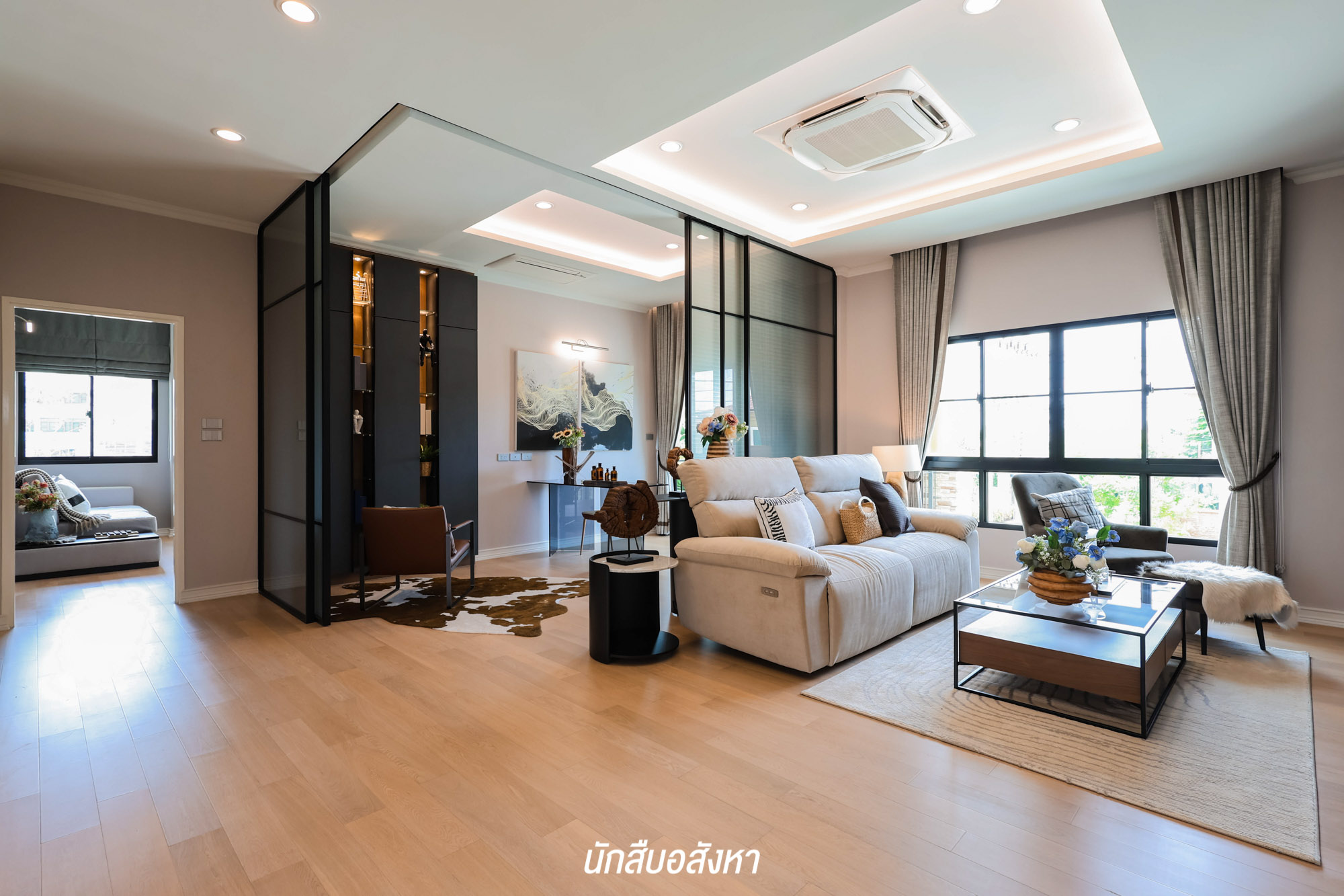 สำหรับบริเวณชั้น 2 เป็นชั้นพักอาศัยเช่นเดียวกัน โดยขึ้นมาบนชั้น 2 เราจะเจอกับพื้นที่อเนกประสงค์ขนาดใหญ่ก่อนเลย สามารถกั้นห้องเป็นอีกหนึ่งได้เลย เหมือนกับบ้านตัวอย่างที่ได้ลองกั้นผนังกระจกมาให้ดูเป็นไอเดีย หรือใครอยากได้พื้นที่ส่วนตัวก็สามารถกั้นเป็นพื้นที่ทำงานจริงจังได้เลย หรือจะเป็นห้องนอนก็ได้ตามต้องการ