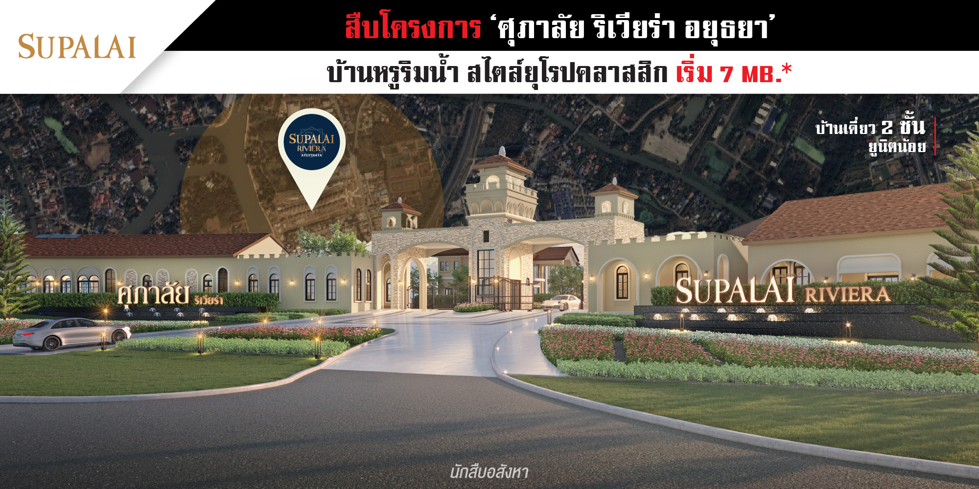 บริษัท ศุภาลัย จำกัด (มหาชน) หรือ ศุภาลัย เป็นดิเวลลอปเปอร์เจ้าแรก ๆ ที่รุกตลาดอสังหาฯ ในภูมิภาคมาอย่างต่อเนื่อง หลายต่อหลายโครงการประสบความสำเร็จเป็นที่ประจักษ์ จากจุดเริ่มต้น 2 จังหวัดแรก สงขลาและขอนแก่น เริ่มกระจายไปยังจังหวัดอื่น ๆ กระทั่งร่วงเวลามากว่า 35 ปี ครอบคลุม 29 จังหวัด รวมทั้งหมด 441 โครงการในปีนี้ ซึ่งผมเชื่อว่า ถ้าหากเอ่ยชื่อมาทุกคนต้องเคยรู้จักอย่างแน่นอน เช่น ศุภาลัย พรีมา วิลล่า นครราชสีมา, ศุภาลัย เบลล่า ถลาง ภูเก็ต และศุภาลัย วิลล์ หัวหิน อย่างในจังหวัดพระนครศรีอยุธยา ก็เป็นอีกหนึ่งทำเลทอง ที่มีโครงการของศุภาลัย มากถึง 6 โครงการ ซึ่งโครงการล่าสุดที่เปิดตัวในช่วงเดือนมีนาคมที่ผ่านมา “ศุภาลัย ริเวียร่า อยุธยา” บ้านเดี่ยว 2 ชั้น ริมน้ำ โดดเด่นด้วยการออกแบบสไตล์ยุโรปคลาสสิก ราคาเริ่ม 7 ล้านกว่า*