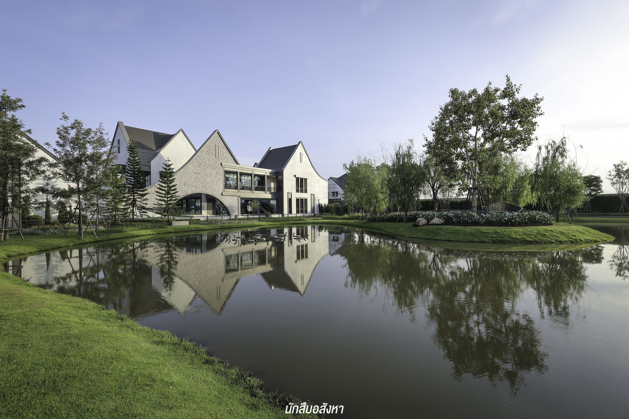 ถ้าดูจากภายนอก จะเห็นได้ว่าบริเวณหน้ากากบ้านถูกดีไซน์ ออกมาให้เป็นหลังคาจั่วทรงสูง ผสมผสานกับดีเทลต่าง ๆ เช่น ซุ้ม Arch โค้ง, ขอบบัว และลูกฟักหน้าต่าง ที่ช่วยให้บ้านดูมีเป็นบ้านฟาร์มเฮ้าส์แบบตะวันตกได้ชัดเจนมากขึ้น เพราะนอกจากเรื่องของความสวยงามแล้ว ข้อดีหลังคาจั่วทรงสูง ช่วยทำให้ฝ้าเพดานของตัวบ้านด้านในได้ความสูงเพิ่มขึ้น ทางโครงการจึงออกแบบฟังก์ชันภายในบ้านให้มีพื้นที่ Double Volume Living ที่รับกันได้ดีกับหน้าต่างบานใหญ่พิเศษ ซึ่งถือว่าเป็นจุดสังเกตที่เห็นได้ชัดของบ้านหลังนี้เลยครับ