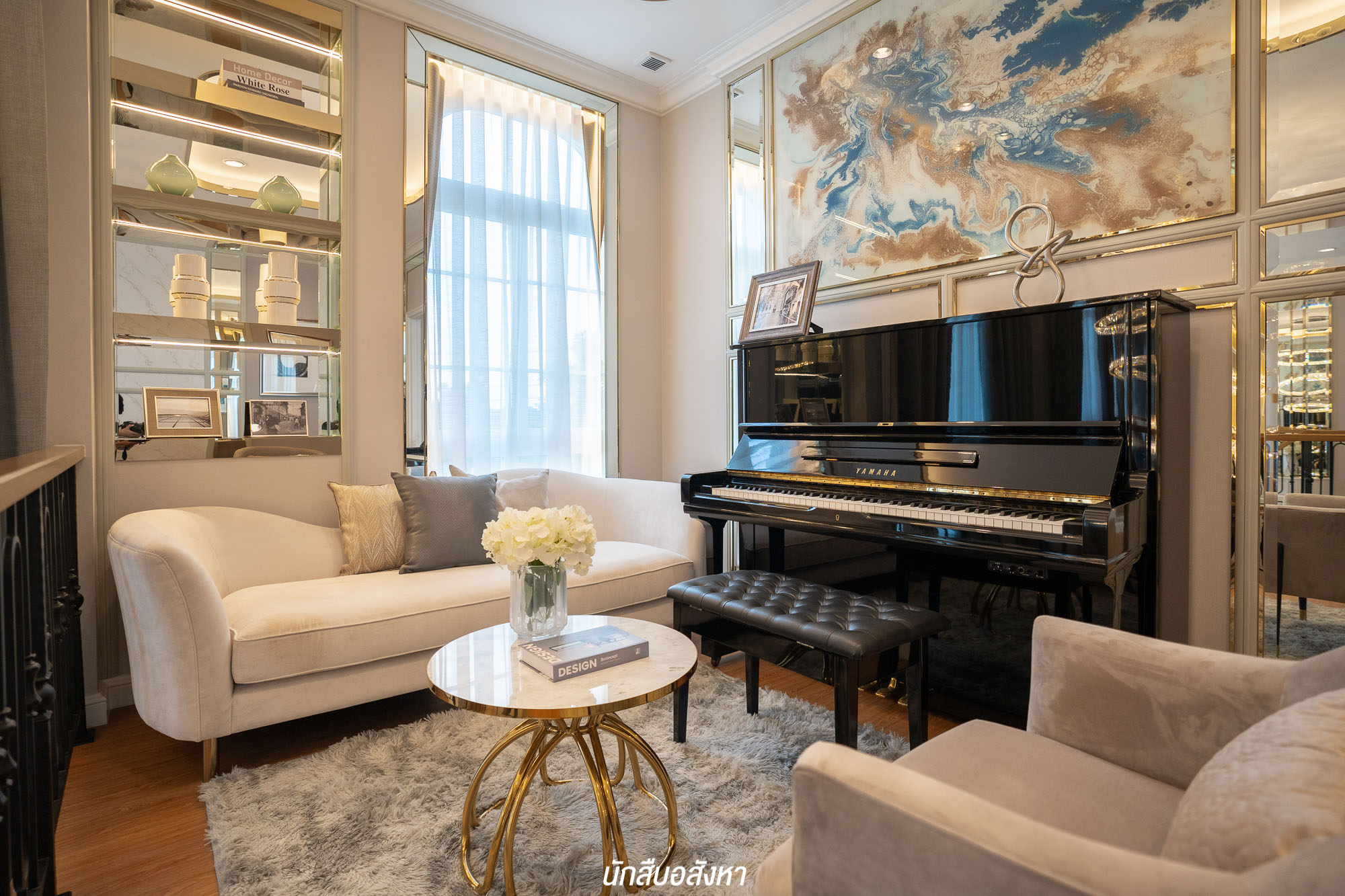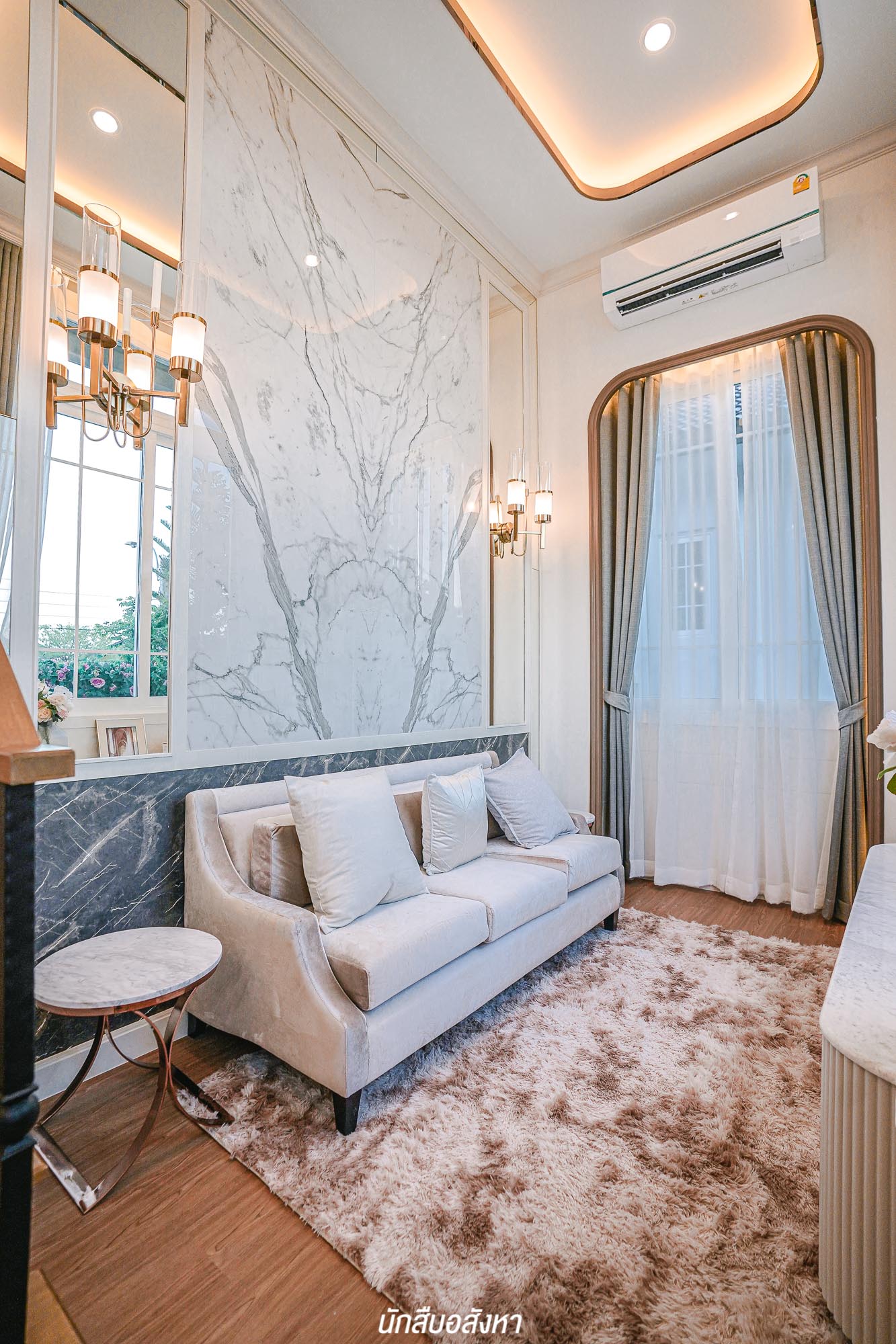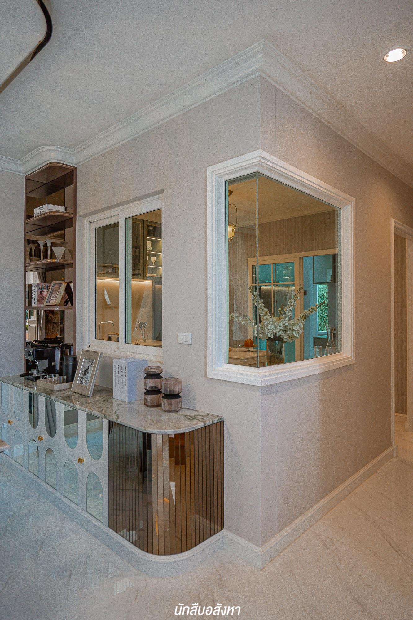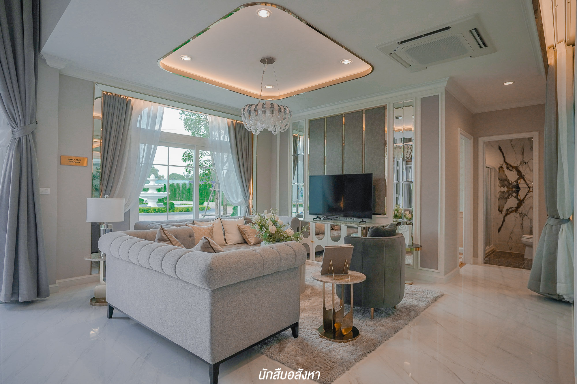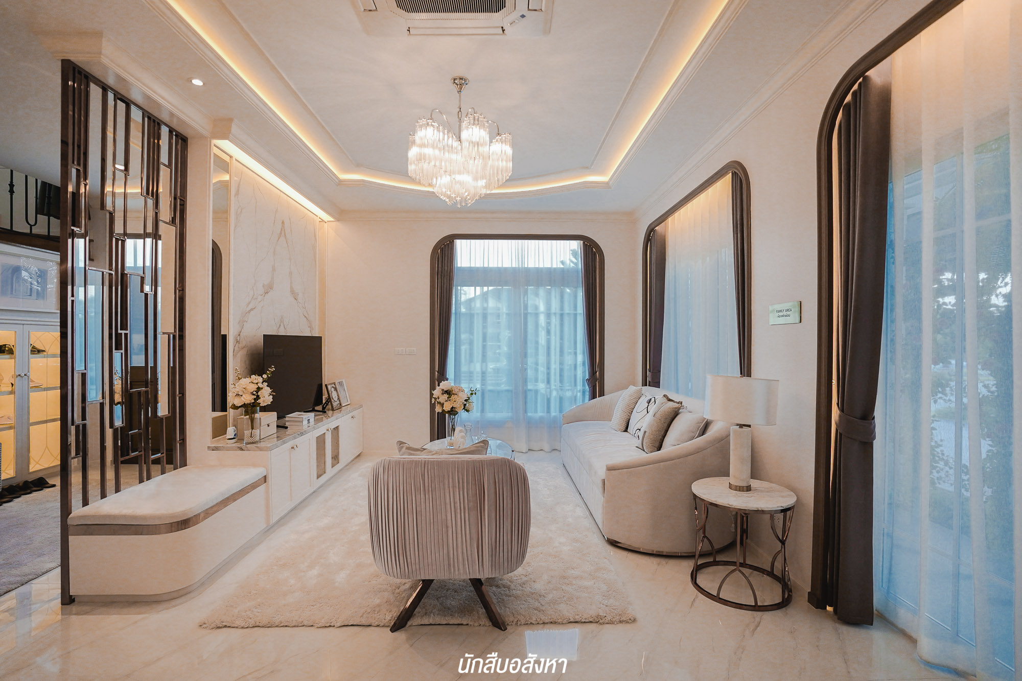 เชื่อมต่อกันเลยจะเป็น Living Area ได้พื้นที่มาค่อนข้างใหญ่ ซึ่งจะอยู่ฝั่งหน้าบ้านข้าง ๆ กันกับ Foyer รองรับแขกได้ประมาณ 6 – 8 คนเลย และสามารถวางโซฟาขนาดใหญ่ได้ถึง 3 ตัว พร้อมโต๊ะกลาง โดยที่ยังมีพื้นที่เหลือด้านข้าง วางทีวีได้เช่นเดียวกัน