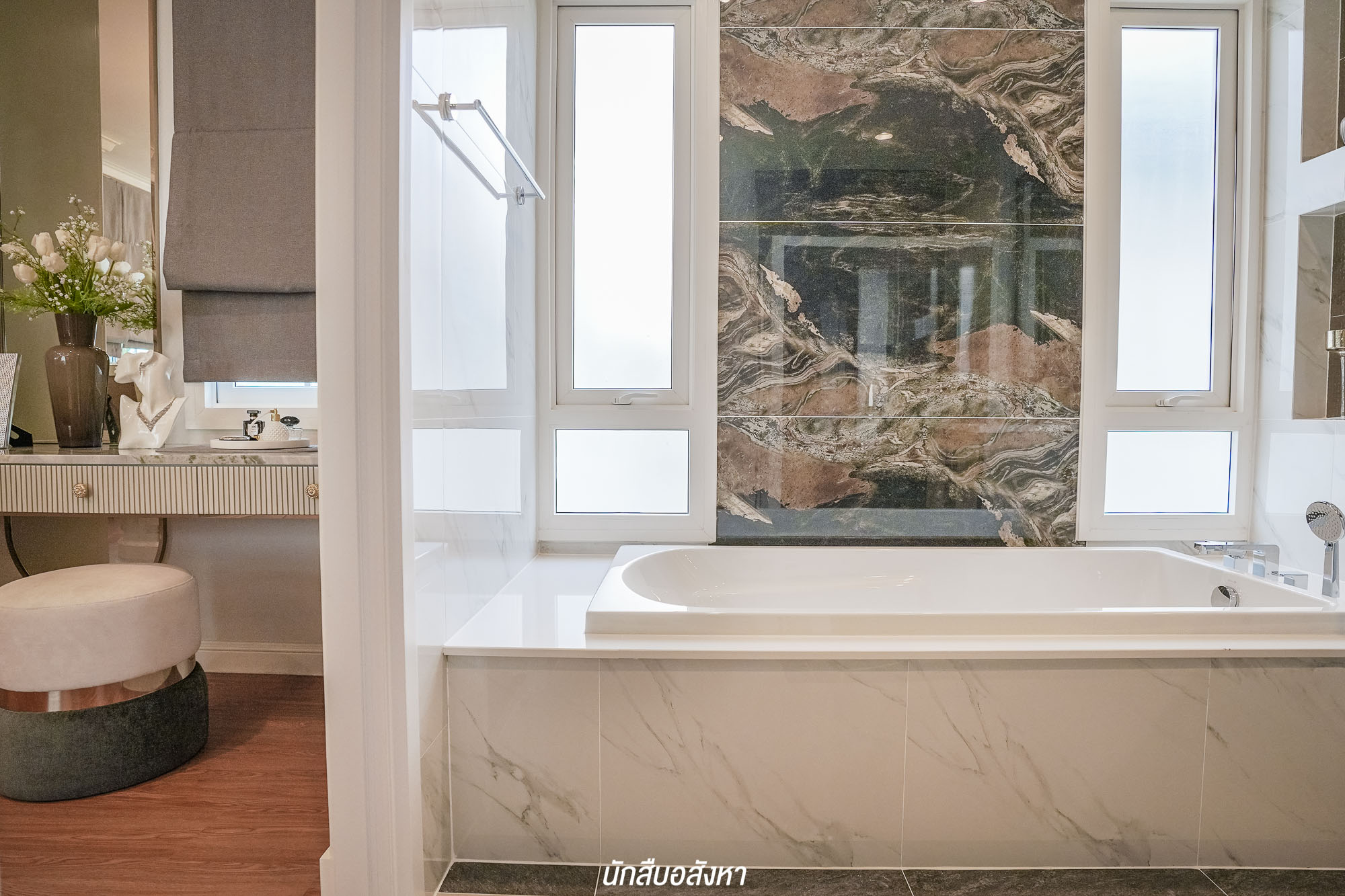 ส่วนมุมแต่งตัวจะอยู่ติดกันกับห้องน้ำโซนด้านหลังบ้าน สามารถ Built ตู้เสื้อผ้าเป็นรูปตัว L ตามแบบบ้านตัวอย่างได้ ส่วนห้องน้ำ ห้องนี้ได้สุขภัณฑ์แบบจัดเต็ม มาพร้อมอ่างอาบน้ำ ขนาด 1.5 เมตรครับ