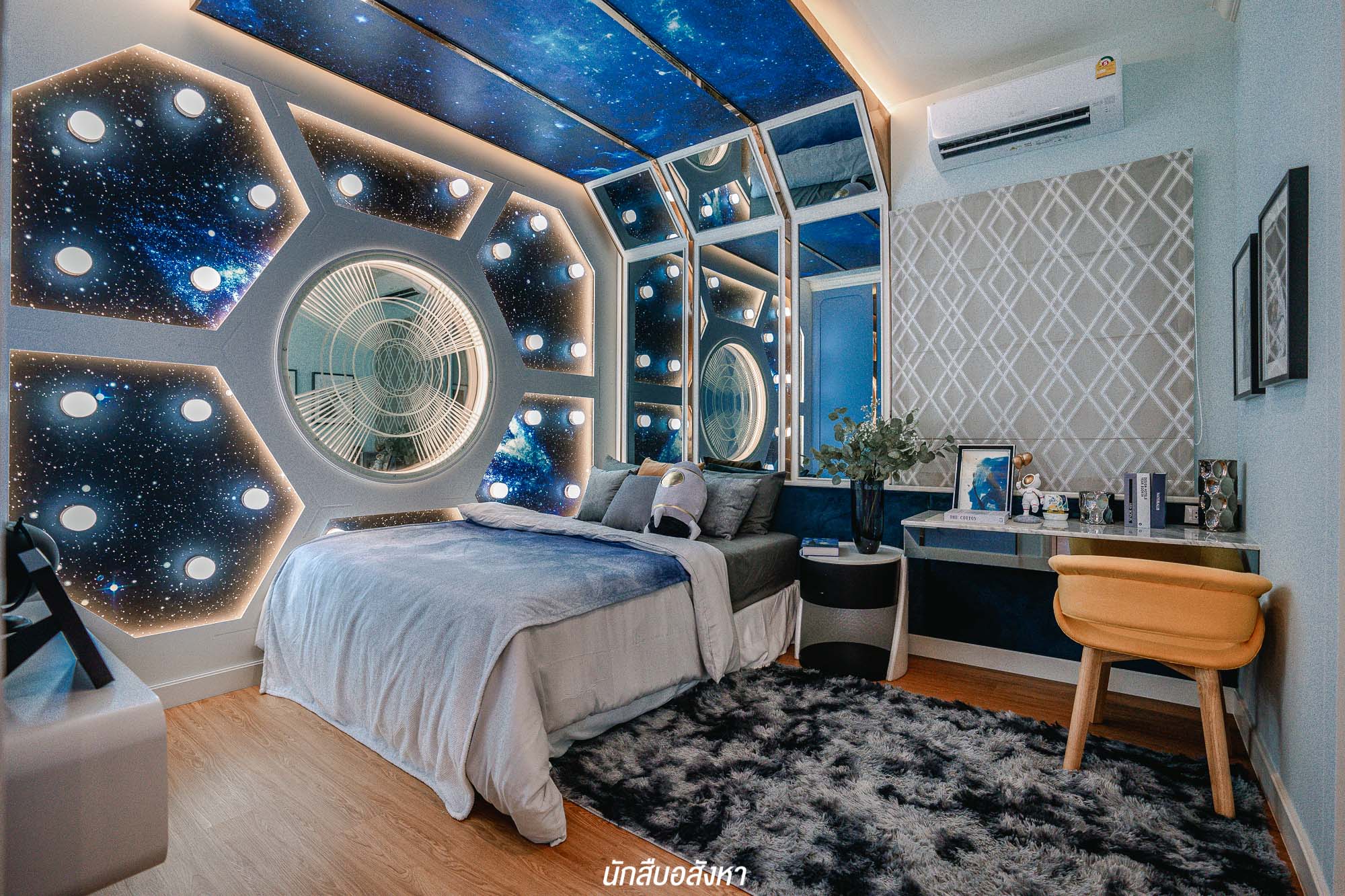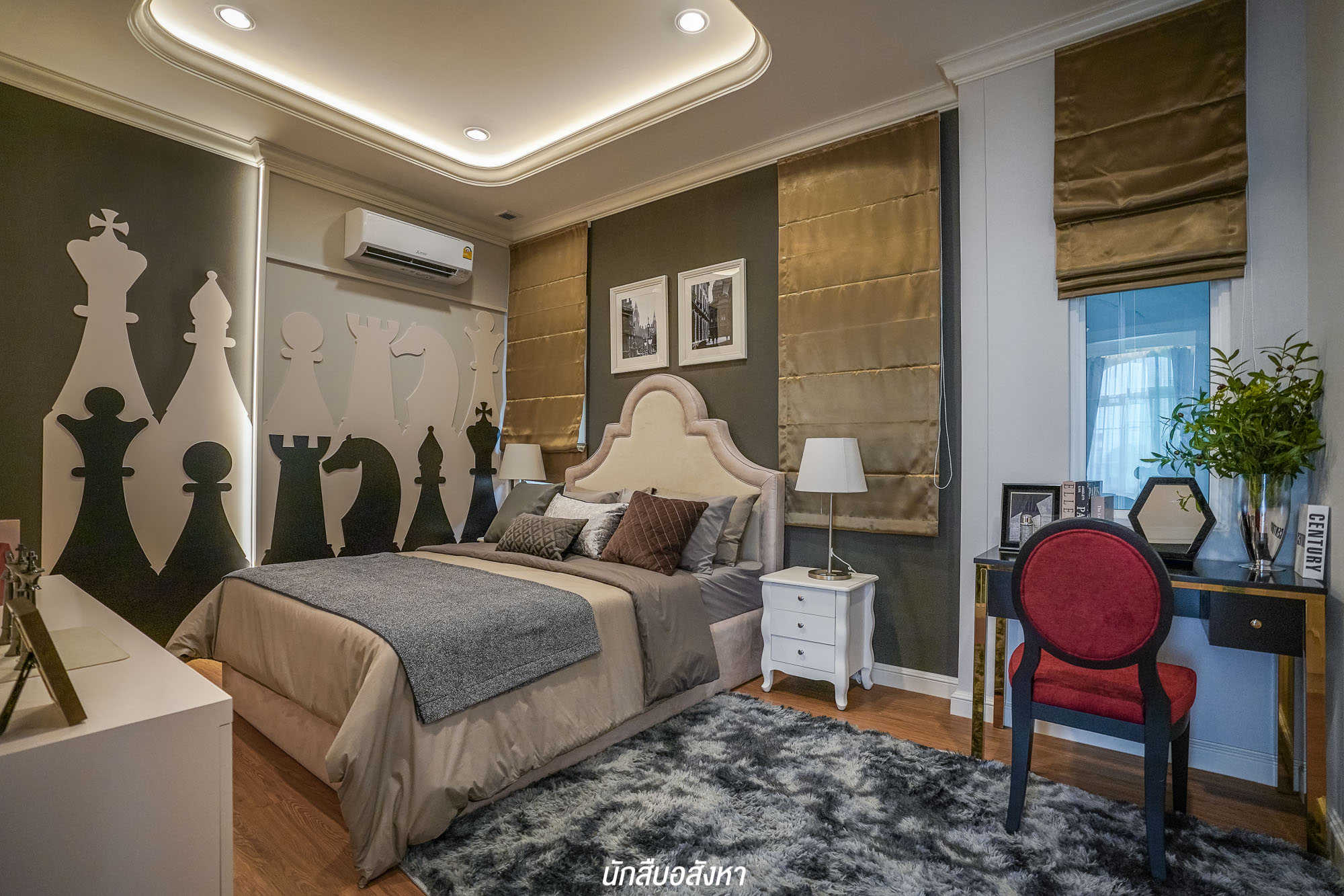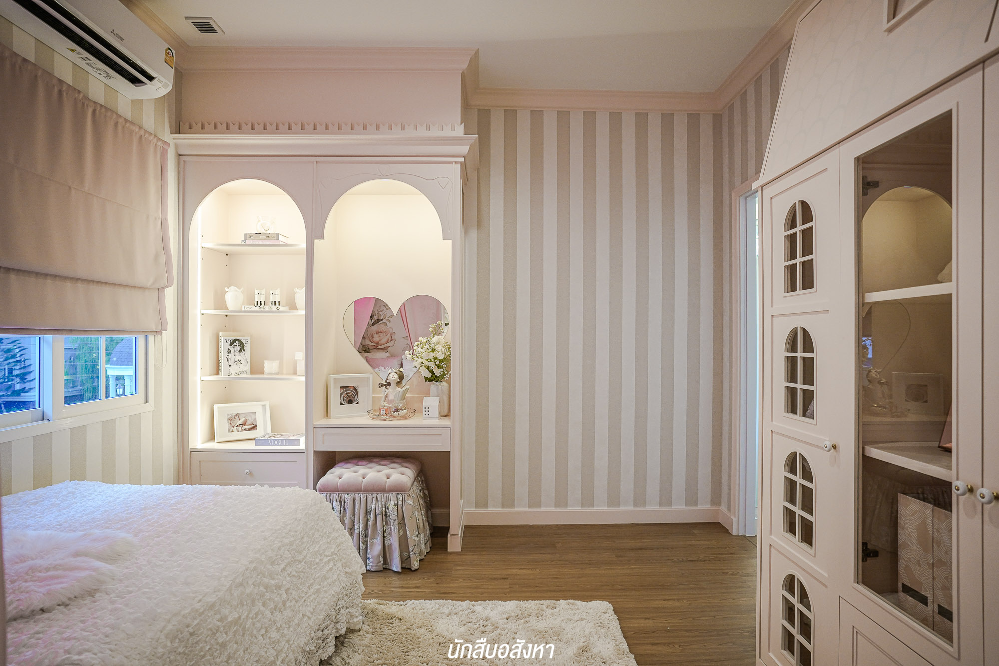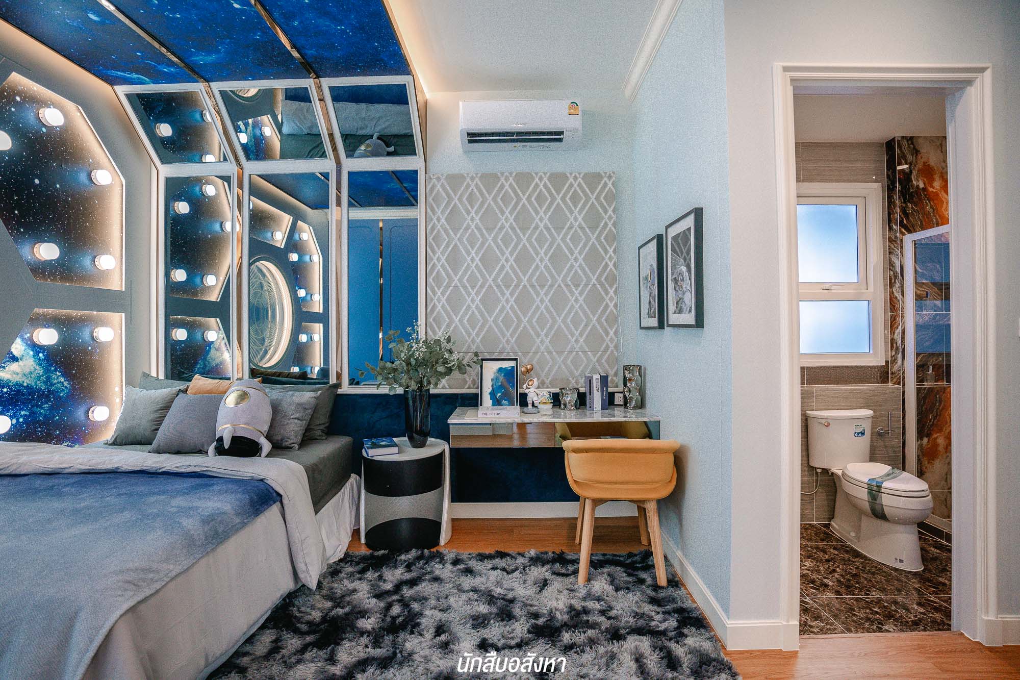 สุดท้ายห้องนอนเล็ก ห้องนี้ได้พื้นที่ค่อนข้างกว้าง อยู่บริเวณกลางบ้านของชั้น 2 สามารถวางเตียงขนาด 5 – 6 ฟุตได้ โดยที่ยังมีพื้นที่ด้านข้างพอให้วางโต๊ะหัวเตียง หรือจะทำเป็นมุมโต๊ะอ่านหนังสือก็ได้เช่นกัน และห้องนอนเล็กจะได้ห้องน้ำภายในตัวเช่นเดียวกันกับห้องอื่น ๆ ครับ