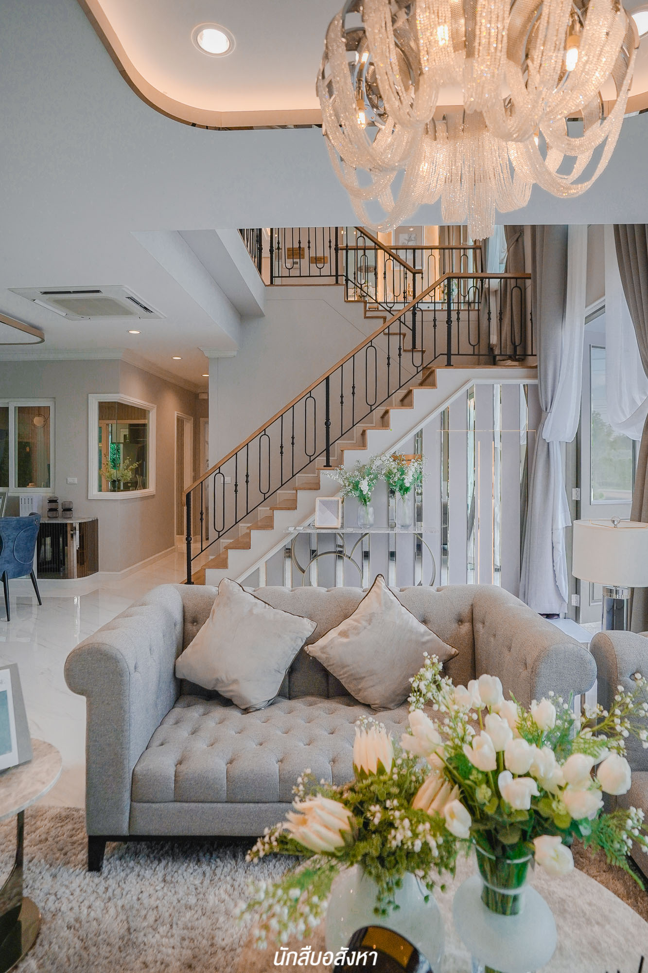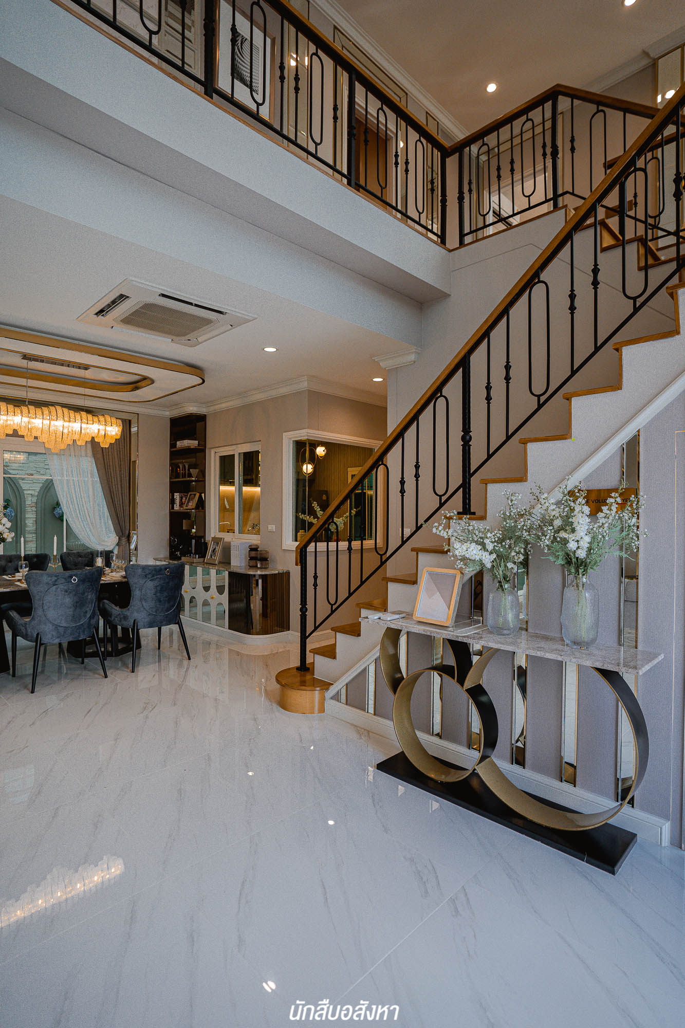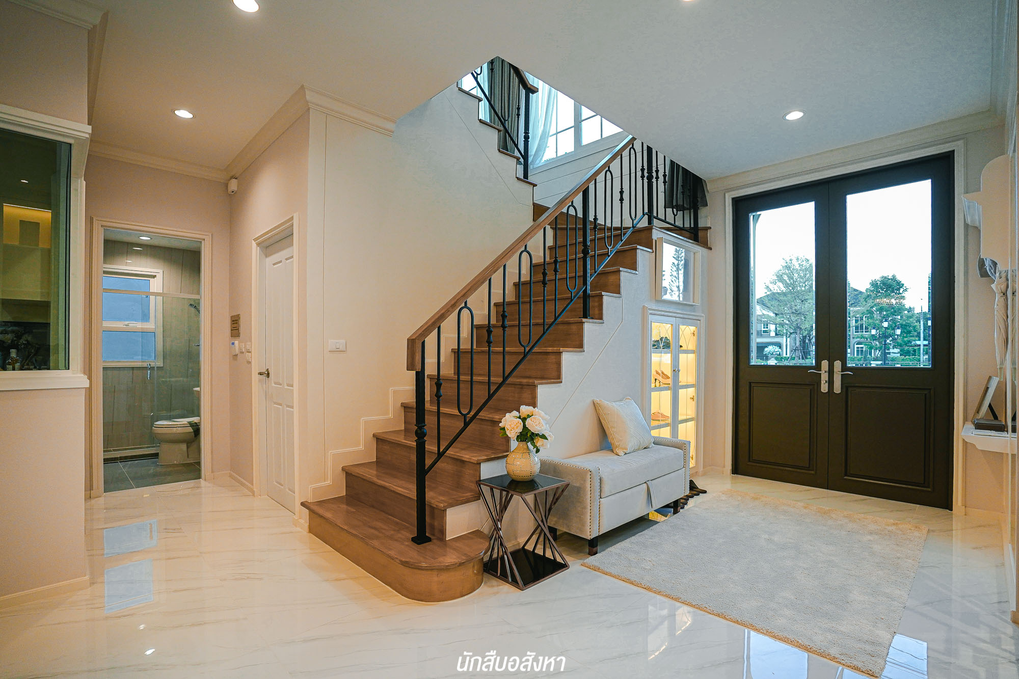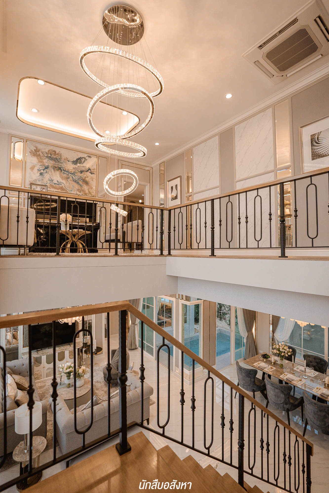 บริเวณโถงบันได ตรงนี้จะได้ช่องแสงขนาดใหญ่ ทำให้ช่วงกลางวันไม่จำเป็นต้องเปิดไฟ เพราะแสงธรรมชาติที่ส่องผ่านเข้ามาทำให้บริเวณตรงค่อนข้างสว่าง + สามารถติด Chandelier ช่วยเพิ่มความ Luxury ได้