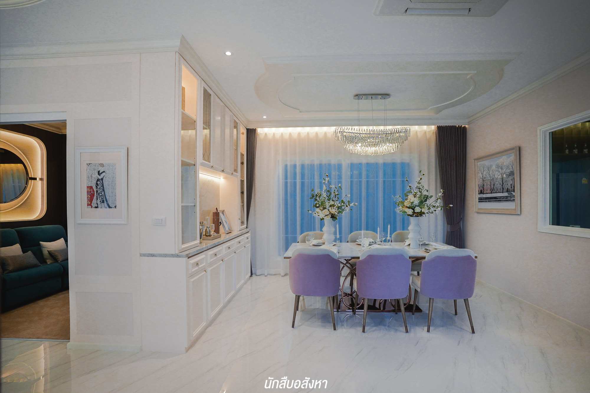 ถัดเข้ามากลางบ้านจะเป็น Dining Area ซึ่งจะอยู่ข้างกันกับห้องครัวด้านขวา โดยจะมีหน้าต่างตรงผนังห้องครัว ทำให้สามารถรับ – ส่ง อาหารผ่านช่องทางนี้ได้ บริเวณนี้ สามารถวางโต๊ะ Long Table ขนาด 6 – 8 คนได้โดยที่ยังมีพื้นที่เหลือด้านข้าง และได้รับช่องแสง ทั้งจากด้านหลังและด้านข้างที่ติดกับสระ ทำให้บริเวณไม่รู้สึกไม่อึดอัด