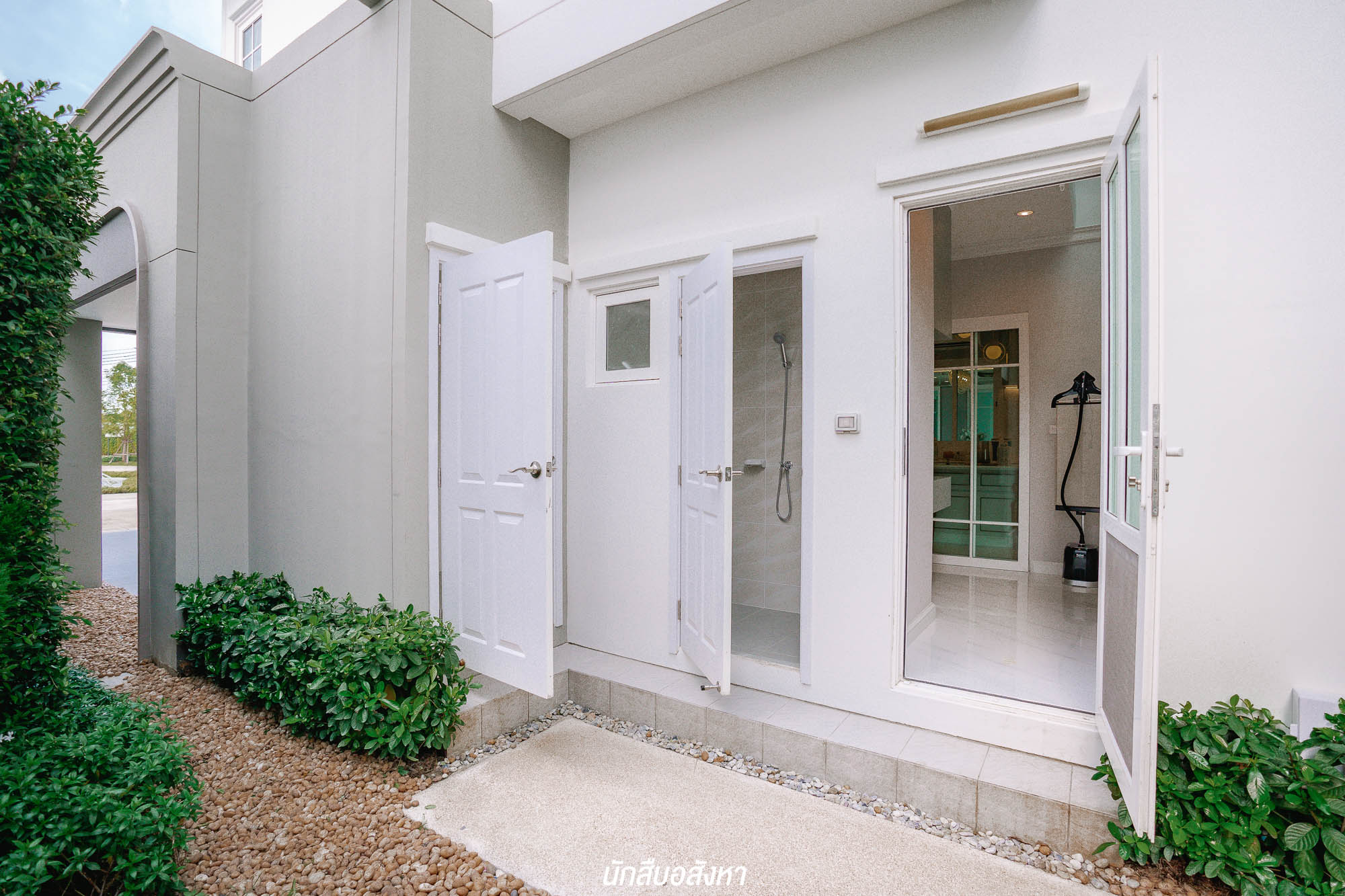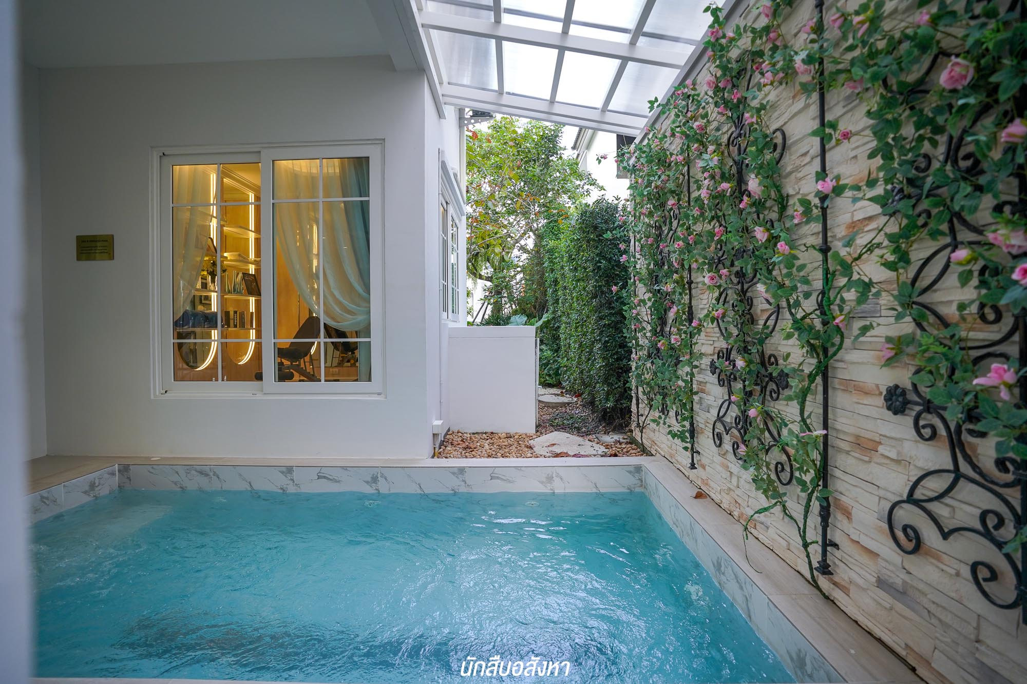 ส่วนด้านซ้ายมือจะเชื่อมกับสระว่ายน้ำส่วนตัว ถ้าเปิดประตูมุมนี้ออกไป จะเจอกับพื้นที่สระว่ายน้ำเลย ซึ่งถูกกั้นด้วยประตูกระจก สามารถเปิดออกได้ 2 ทาง และมองเห็นวิวสระได้จากด้านในบ้านครับ สำหรับตัวสระว่ายน้ำจะเป็น สระว่ายน้ำแบบธาราบำบัดส่วนตัว ขนาด 3.7 x 2 เมตร ที่มาพร้อมระบบคลื่นว่ายทวนกระแสน้ำ ถ้าจะออกกำลังกายจริงจังก็สามารถทำได้ หรือจะปรับให้เป็นโหมดนวดสปา ก็ช่วยให้ผ่อนคลาย และลดความเหนื่อยล้าได้ ซึ่งถ้าดูจากรูปจะเห็นว่าตัวสระไม่ได้มีขนาดที่ใหญ่มาก แต่ใช้งานได้จริง เหมาะกับผู้สูงอายุ หรือคนที่ต้องการพื้นที่ส่วนตัวมากกว่า ซึ่งถ้าต้องการว่ายน้ำจริงจัง ทางโครงการก็มี Swimming Pool ขนาดใหญ่ให้บริการที่คลับเฮ้าส์ครับ