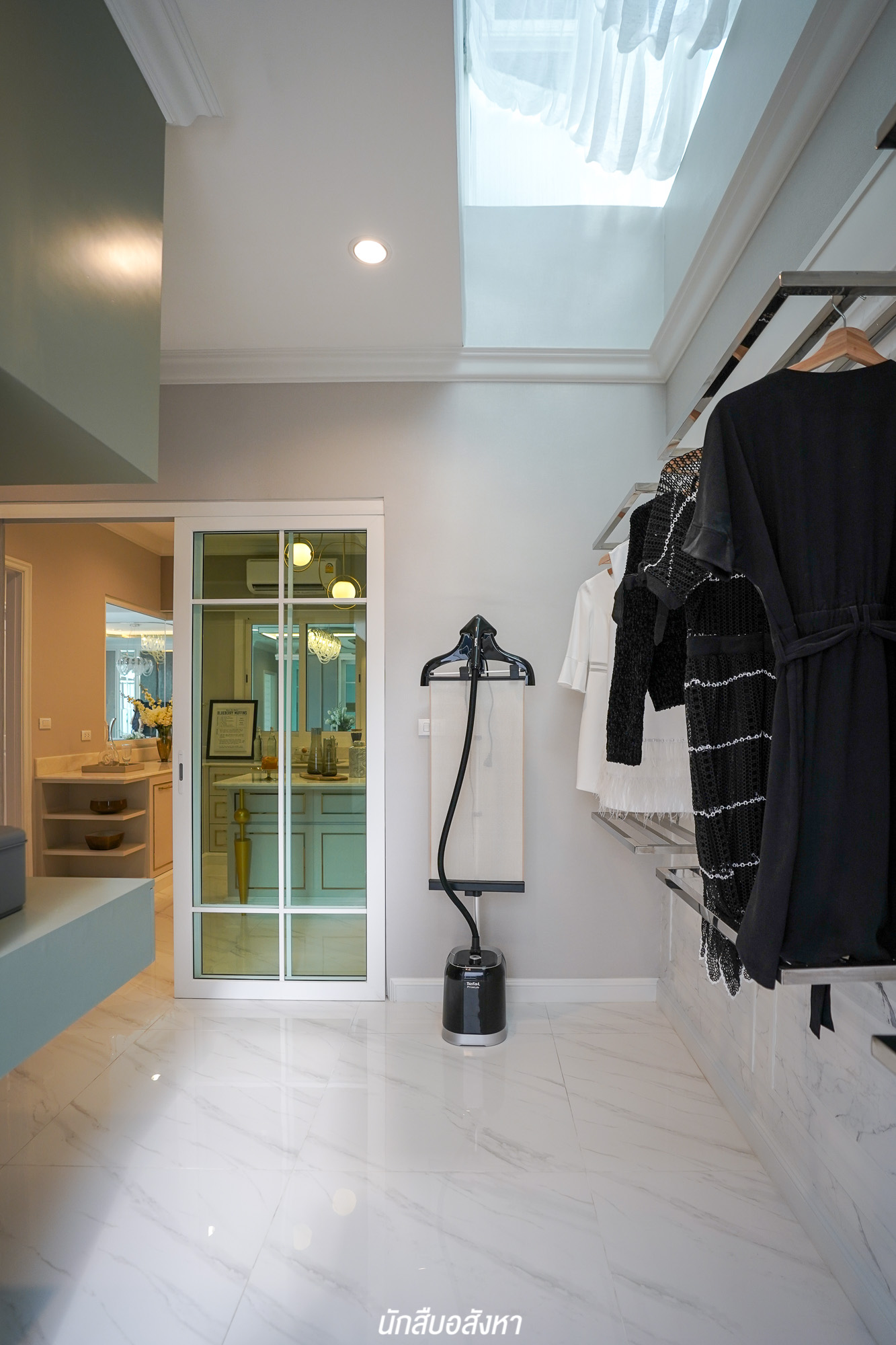 และที่ติดกันเลยจะเป็นอีกหนึ่งไฮไลท์ของบ้านคือ Glasshouse Laundry ห้องซัก – ตาก – รีด ขนาดใหญ่ ถูกออกแบบมาให้มี Skylight ช่วยให้ ตากผ้าในห้องได้โดยที่แสงเข้าถึง ทำให้ผ้าไม่มีกลิ่นอับ สามารถจัดพื้นที่ได้อย่างเป็นสัดส่วน จะ Built ชั้นวางของหรือติดราวแขวนเสื้อผ้าเพิ่มเติมก็ทำได้ โดยที่ยังมีพื้นที่ว่างเพียงพอสำหรับวางเครื่องซักผ้าและเครื่องอบผ้าได้อย่างลงตัว ซึ่งจากห้องซักรีด หลังบ้านจะเป็นโซนซักล้างที่เชื่อมต่อกันกับห้องนอนและห้องน้ำแม่บ้านครับ
