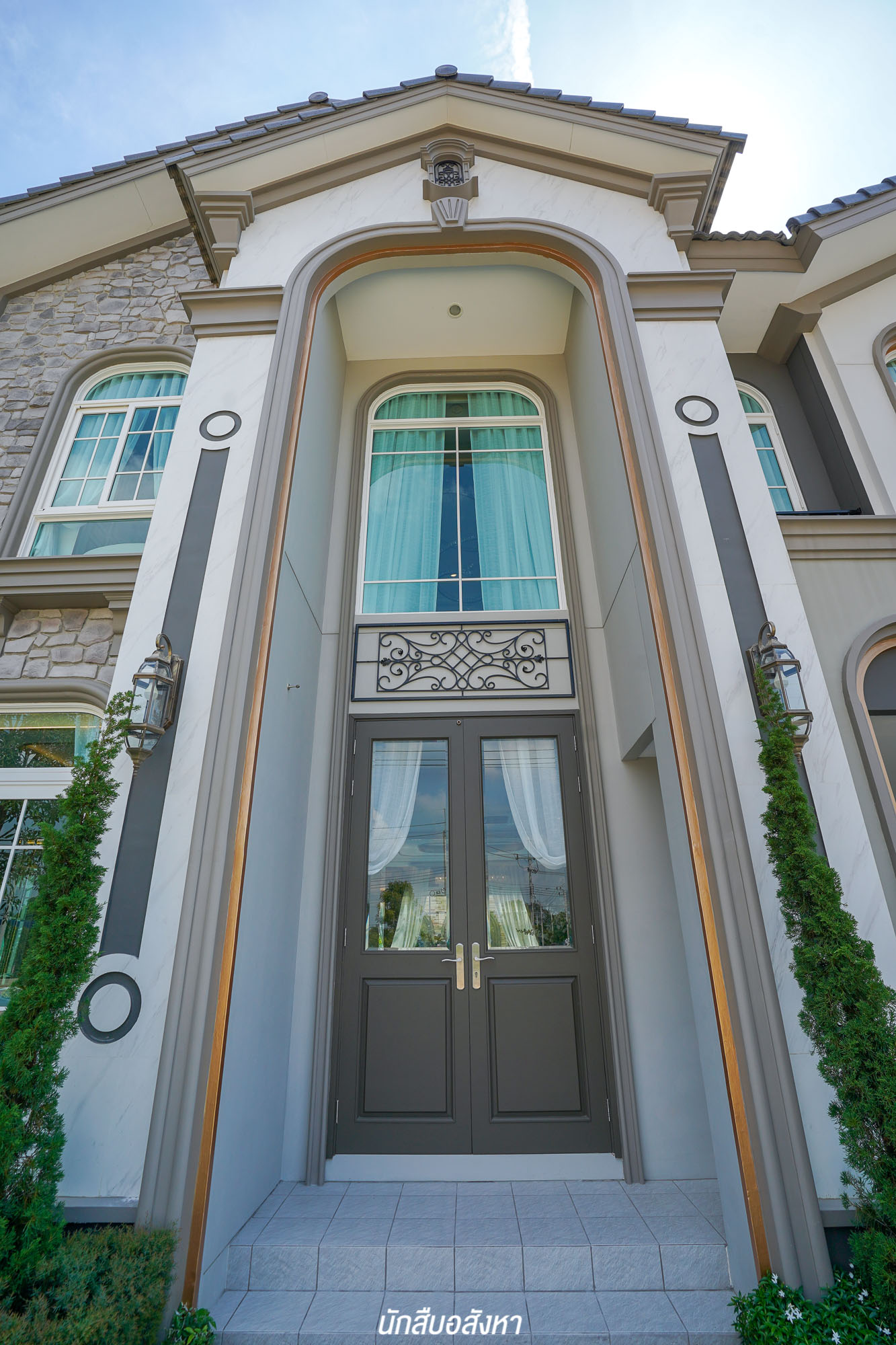 เมื่อดูจากภายนอก จะเห็นได้ว่าบ้านถูกออกแบบมาในสไตล์ Modern European และบริเวณหน้ากากถูกดีไซน์ด้วยซุ้มเสาคู่ ความสูงถึงหลังคา ทำให้เป็น Main Entrance ส่วนบานประตูถูกใช้เป็นประตูบานเปิดคู่รับกันกับซุ้มทรงสูง ช่วยให้บ้านดูมีโอ่อ่า ตามแบบฉบับยุโรปคลาสสิก ซึ่งถือว่าเป็นจุดสังเกตที่เห็นได้ชัดของบ้านหลังนี้ครับ