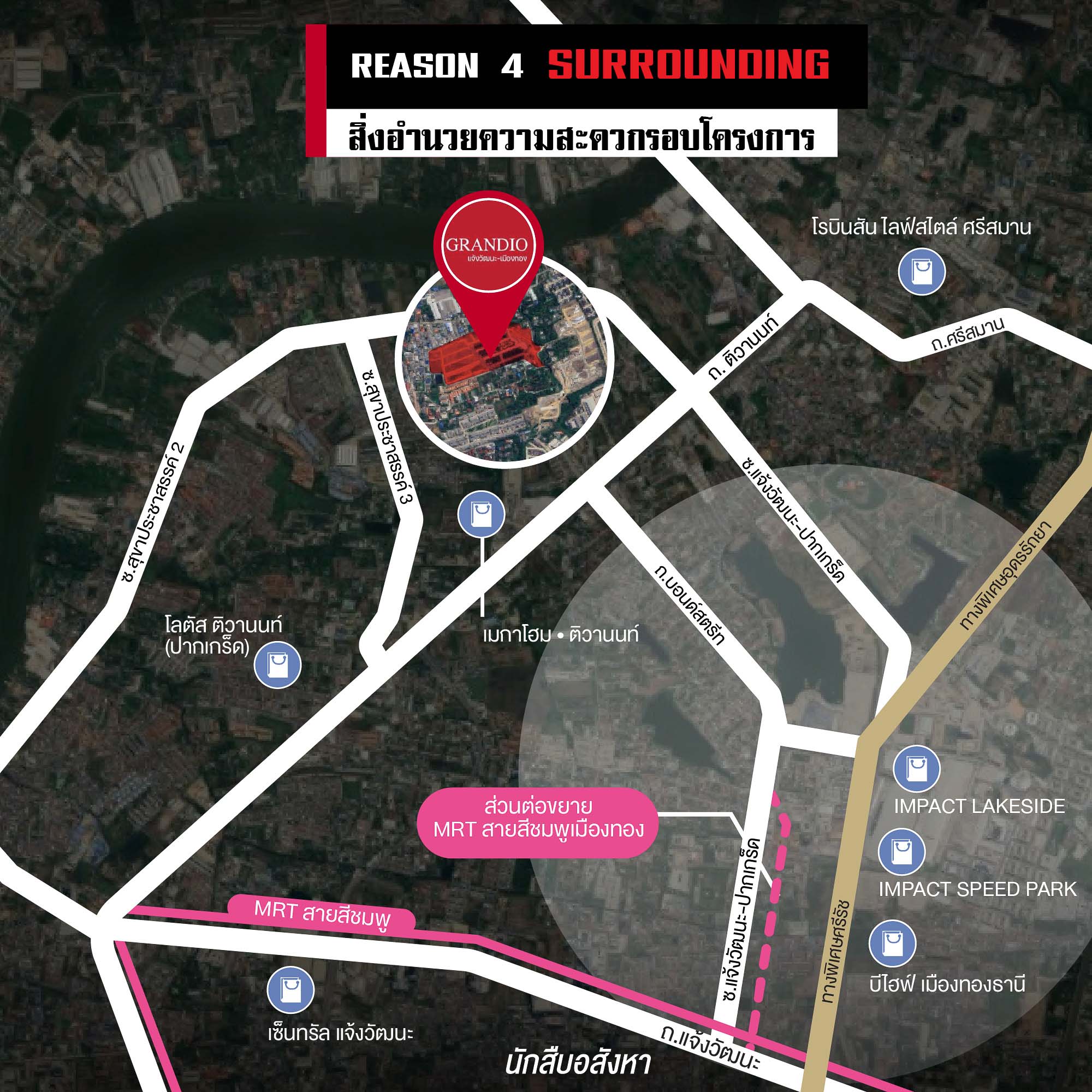 และอีกเหตุผลสำคัญที่ผมจะไม่พูดถึงไม่ได้เลยก็คือ แจ้งวัฒนะ – เมืองทองเป็นย่านที่ใกล้ทั้งสถานที่จัดงานสำคัญ และแหล่งไลฟ์สไตล์มากมาย ไม่ว่าจะเป็น ศูนย์แสดงสินค้าและการประชุมอิมแพคเมืองทองธานี เป็นเหมือนศูนย์กลางไลฟ์สไตล์ Cosmo Barzaar, Software Park Office Building, Hotel และคอนโดฯ หรือจะเป็นห้างสรรพสินค้าชั้นนำ ขยับมาทางโซนแยกปากเกร็ด – แจ้งวัฒนะ ก็จะมีทั้งร้านอาหาร ร้านค้าต่าง ๆ เซ็นทรัล แจ้งวัฒนะ, โฮมโปร แจ้งวัฒนะ, โลตัส ติวานนท์ (ปากเกร็ด), ไทวัสดุ • แจ้งวัฒนะ, แม็คโคร แจ้งวัฒนะ และอื่น ๆ อีกมากมาย