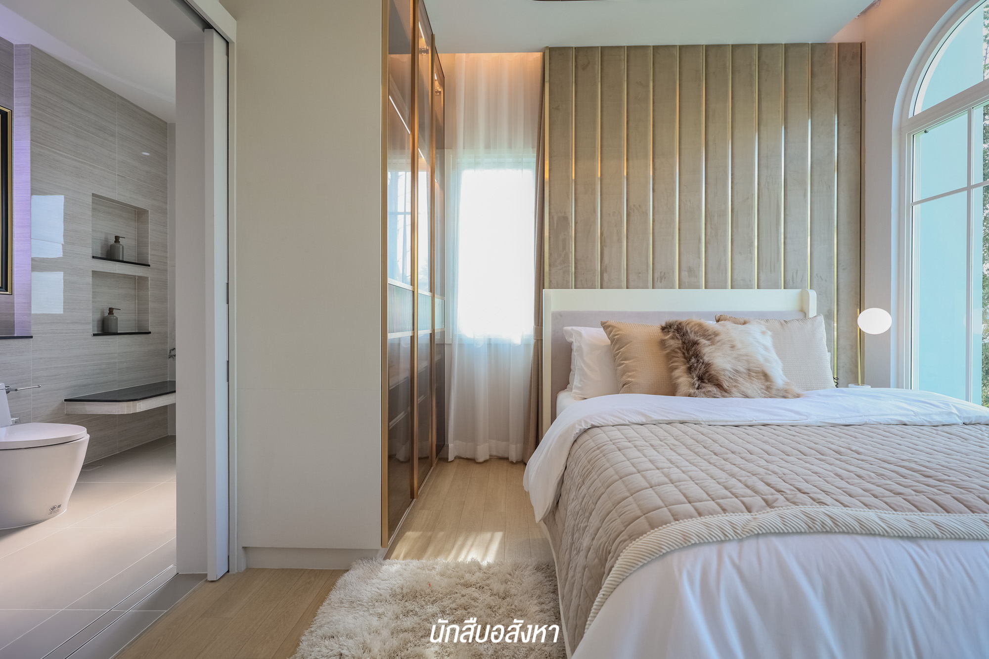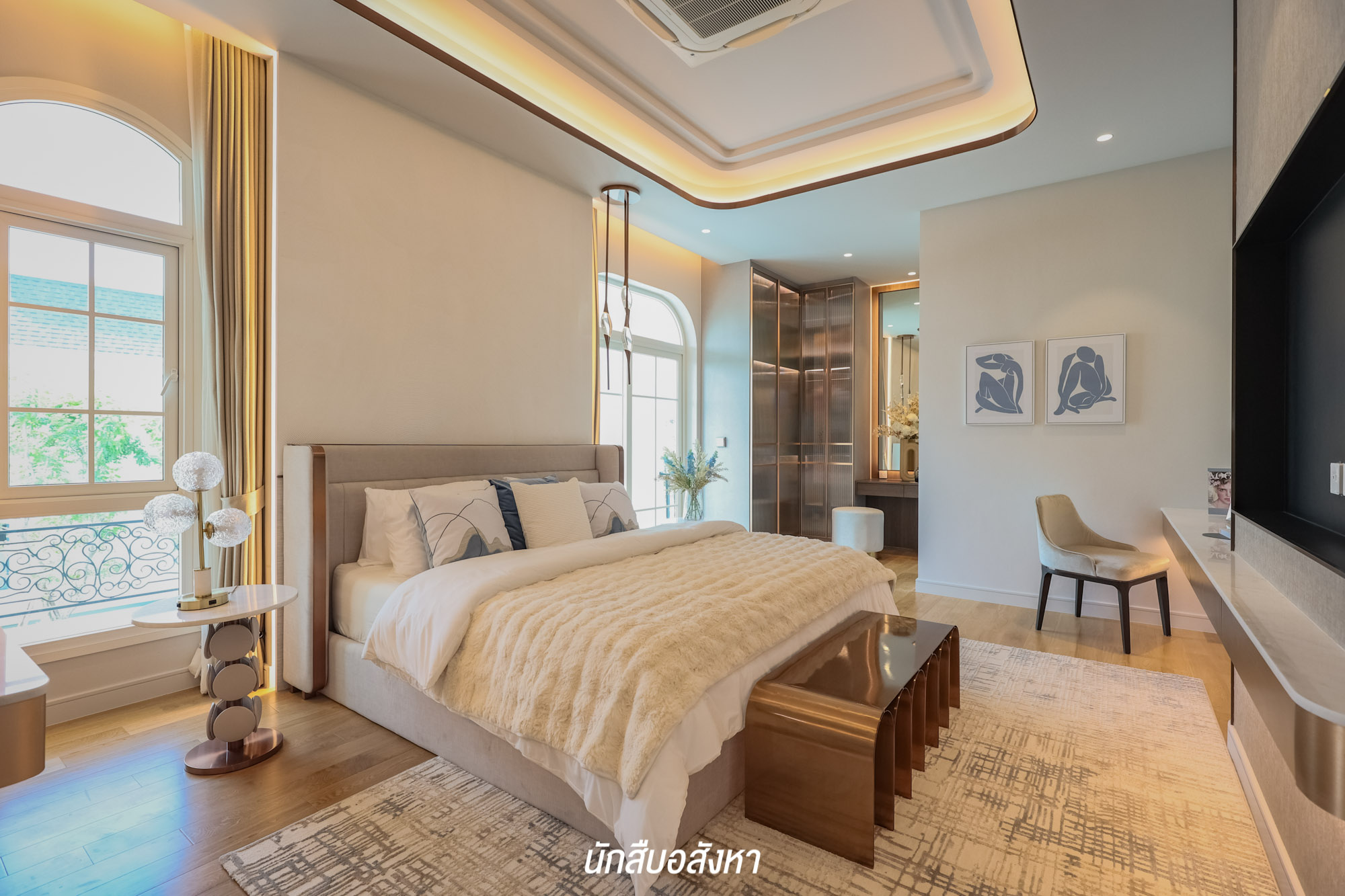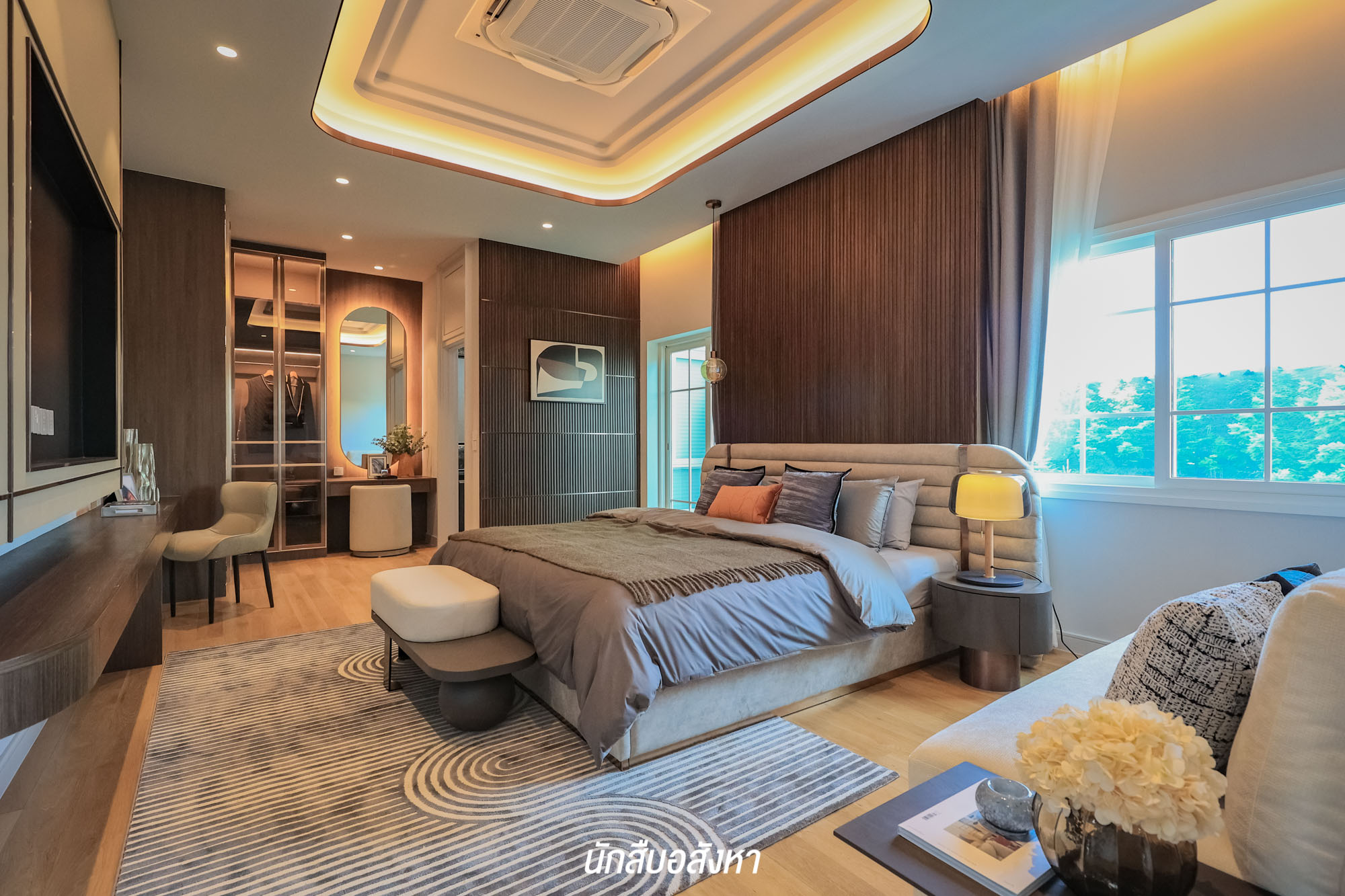 Master Bedroom พื้นที่ใช้สอยขนาดใหญ่ จัดแต่งมุมได้ครบ สำหรับห้องนี้จะแบ่งเป็นมุมที่นอน มุมพักผ่อน Walk in closet และห้องน้ำส่วนตัว