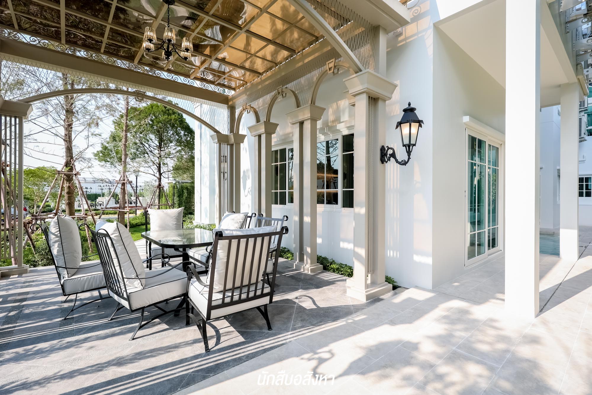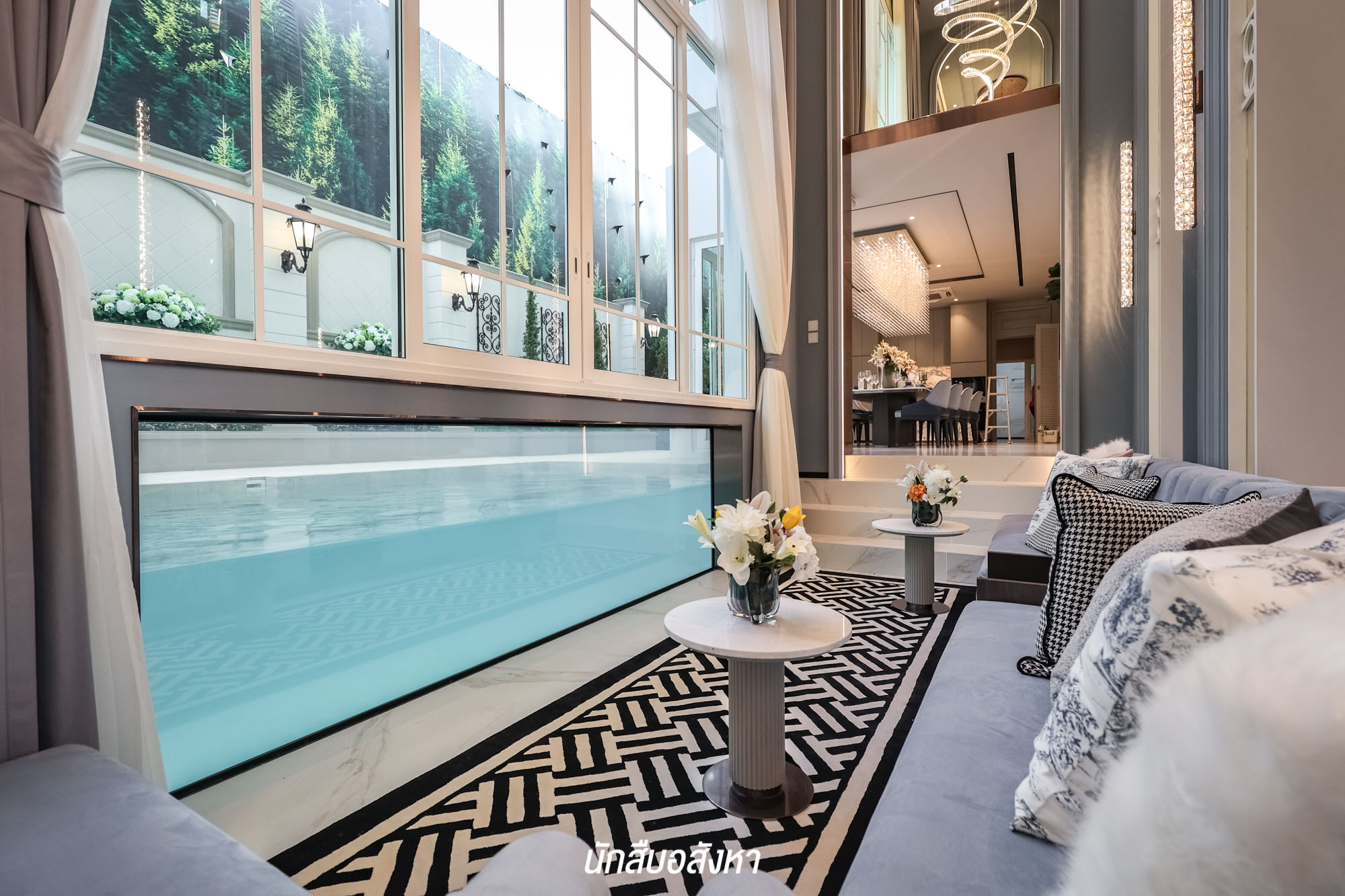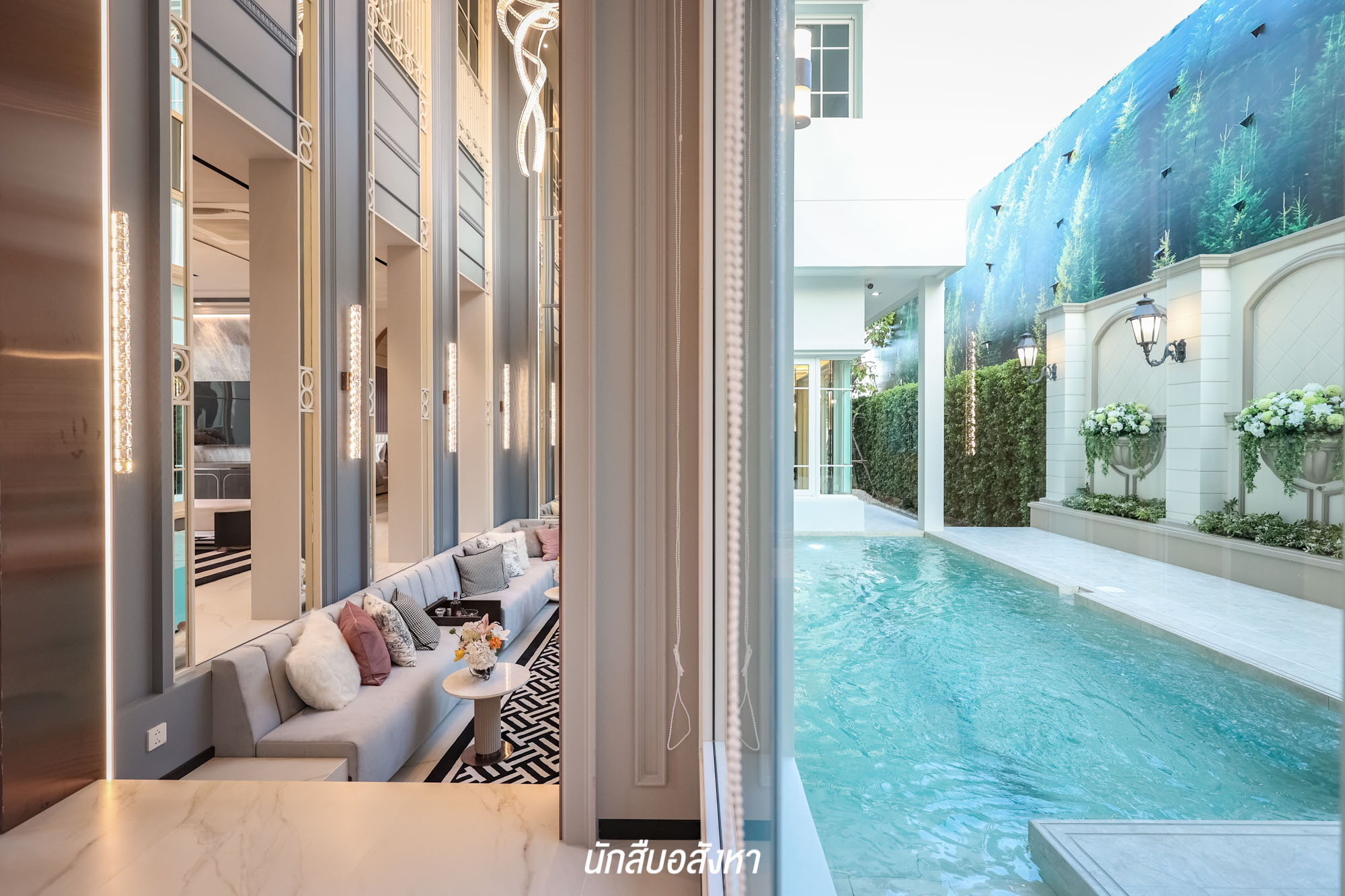 รูปแบบฟาซาดภายนอกนำเส้นโค้งและลวดลายจากสถาปัตยกรรมสมัยศตวรรษที่ 17 มาใช้ พร้อมผสมผสานความโมเดิร์นเพื่อความทันสมัย ภายนอกบ่งบอกถึงสถาปัตกรรมคลาสสิกที่กลมกลืมทั้งโครงการ แต่ฟังก์ชันภายในบ้านดีไซน์ไม่เหมือนใคร มีไฮไลท์สำคัญ คือฟังก์ชัน Grand Sunken Lounge & Swimming Pool ที่ให้ฟีลการพักผ่อนท่ามกลาง Pool Villa ได้ทุกวัน ตัวสระว่ายน้ำเป็นระบบเกลือ มีระบบน้ำทวนกระแส (Spa & Endless Pool) ทำให้สามารถว่ายน้ำได้จริงจิง หรือจะนวดเพื่อผ่อนคลายแบบสปาได้เช่นกัน