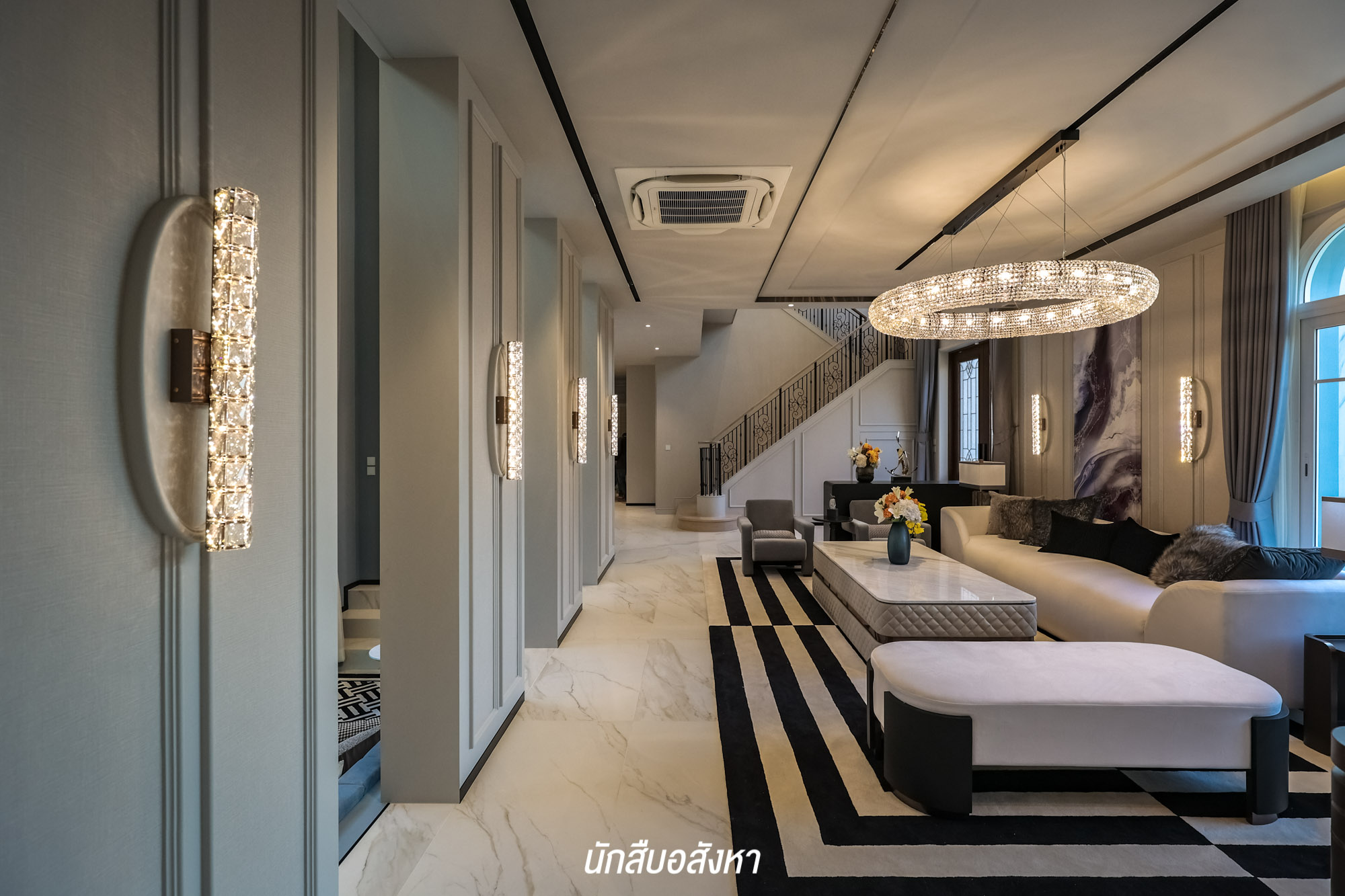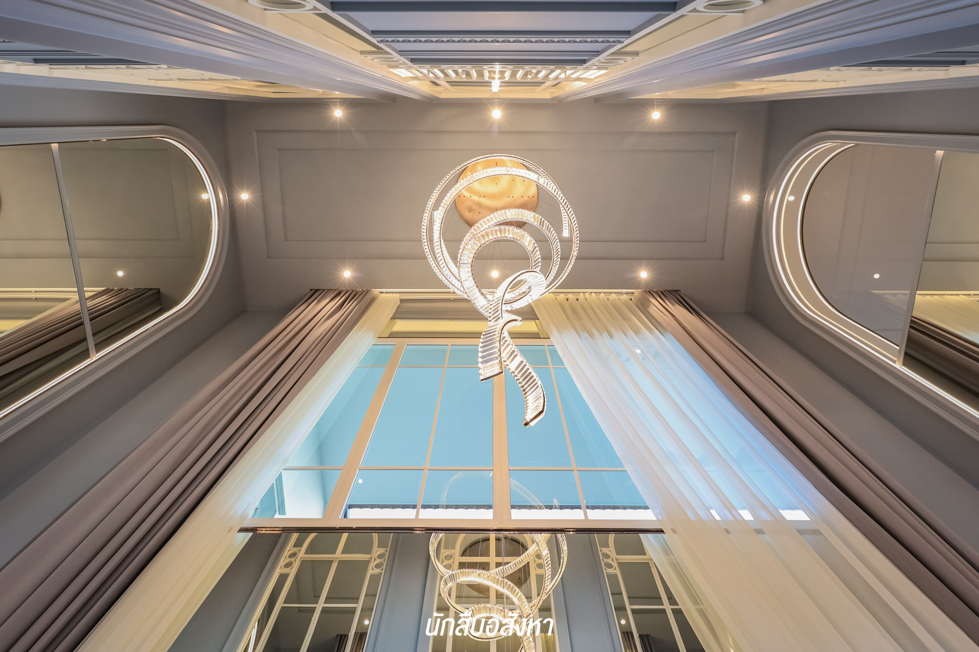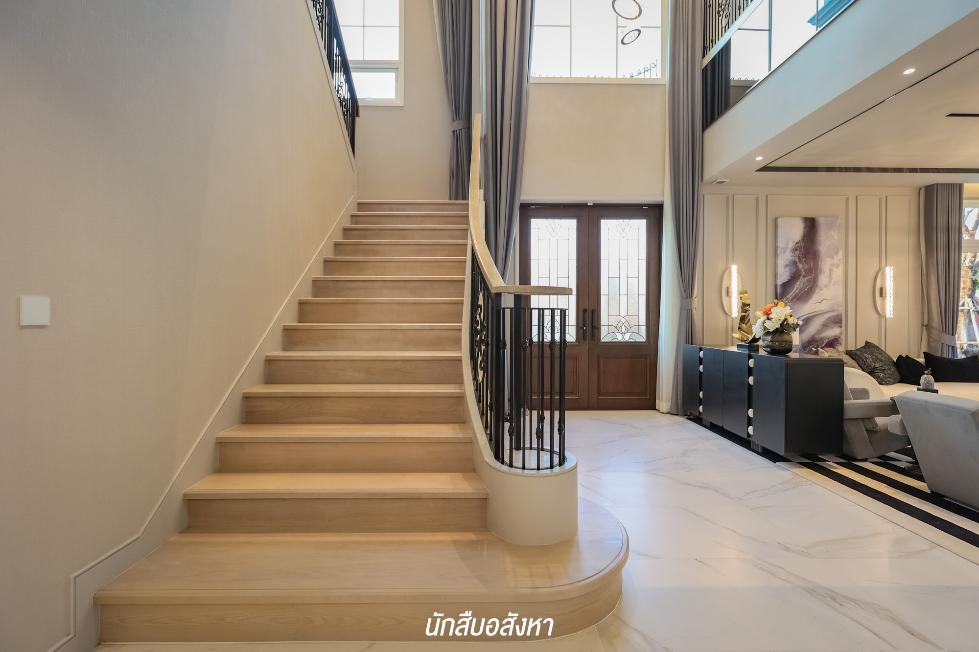 Double Volume Foyer ความสูง 7 เมตร ฝั่งหนึ่งเป็นบันได และอีกปีกของบ้านเป็น Living Area ขนาดใหญ่ พื้นที่ไม่ได้ถูกจำกัดกั้น ฉะนั้นบริเวณโถงชั้นล่างจะสัมผัสถึงความโปร่งโล่งเหมาะจะเป็นที่พักผ่อนรับแขก