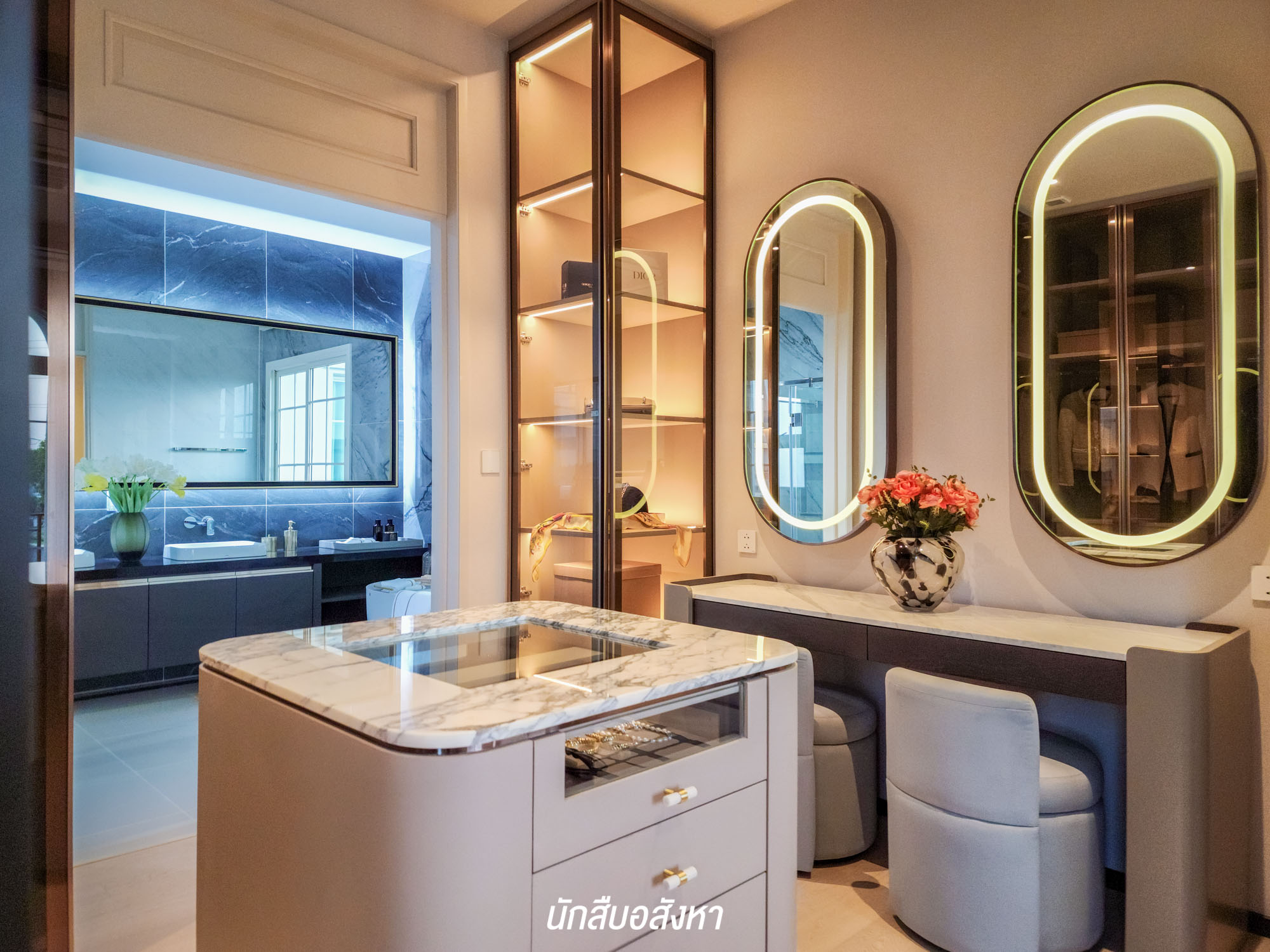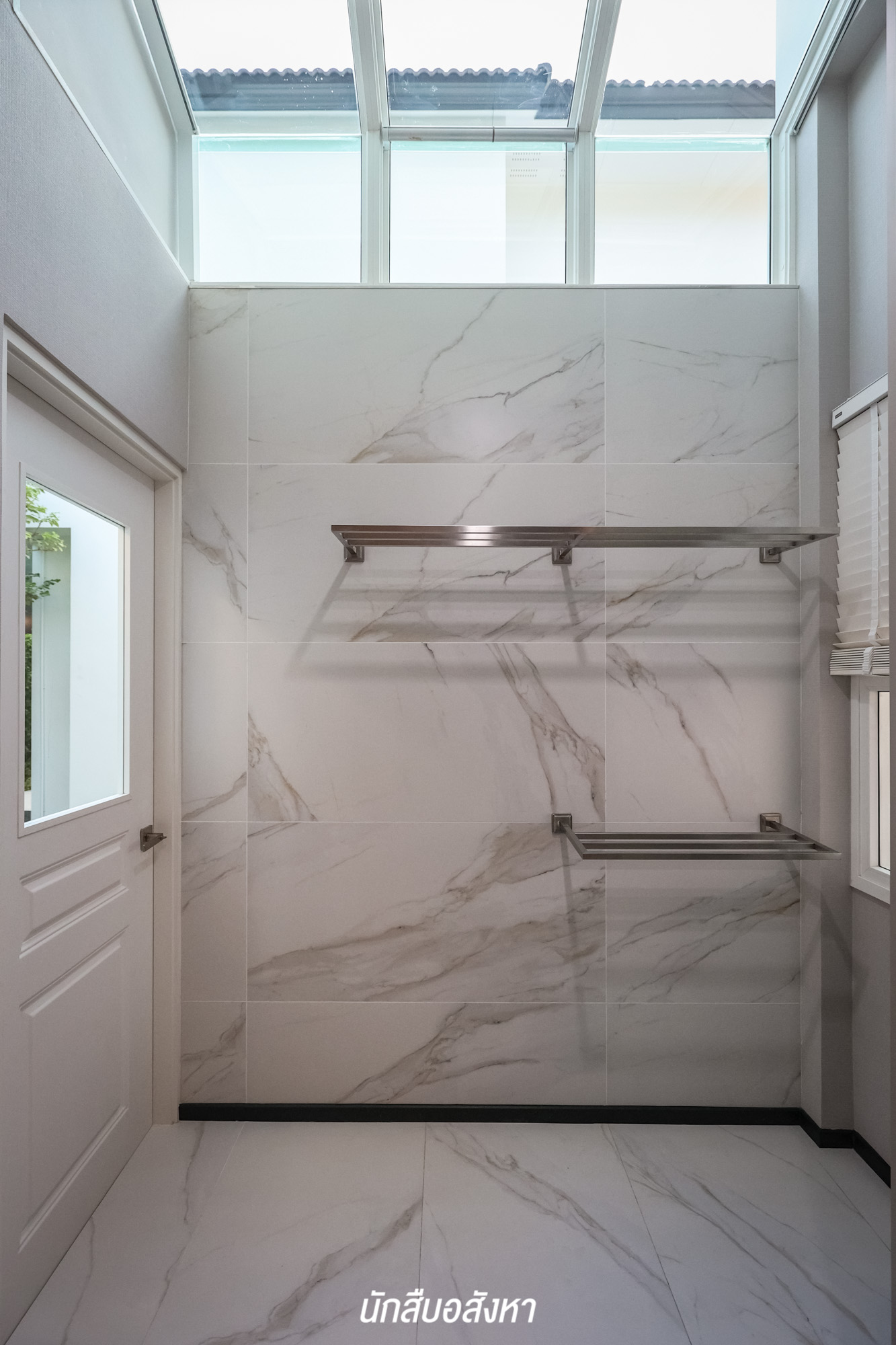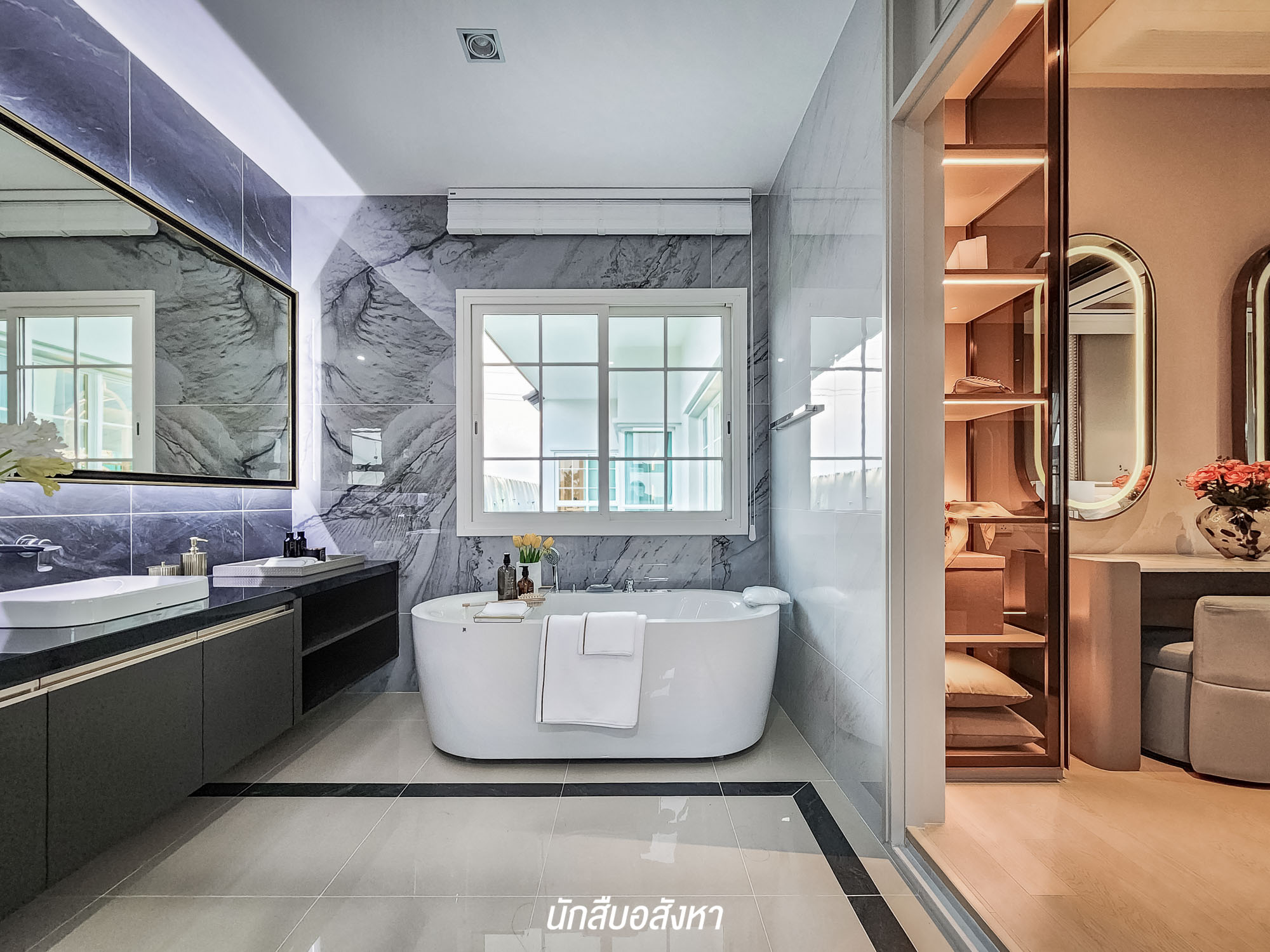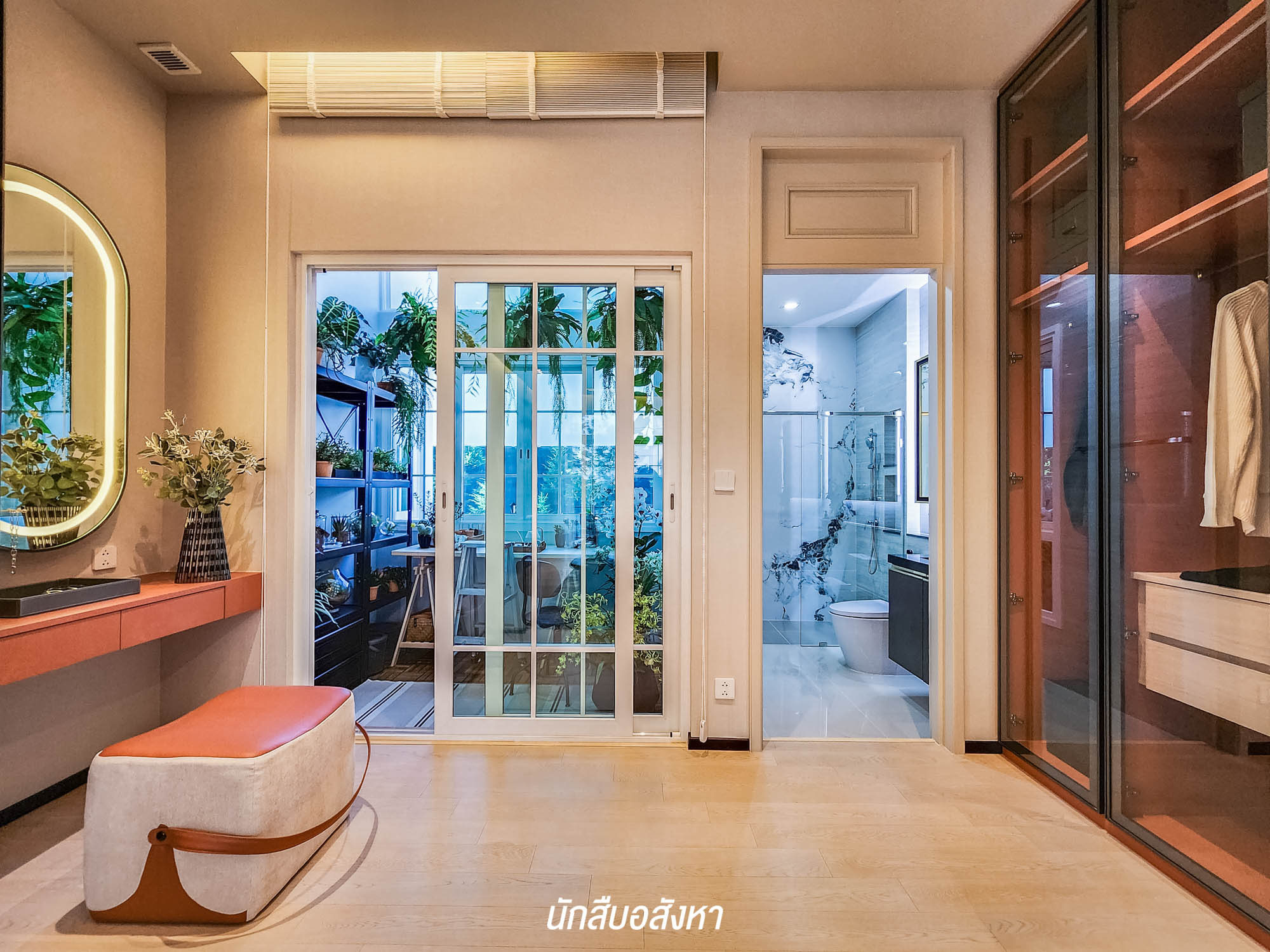 Walk in closet มีขนาดใหญ่ เชื่อมต่อกับห้องน้ำส่วนตัว แบ่งโซน His & Her และมีอ่างอาบน้ำ อุปกรณ์อำนวยความสะดวกครบครัน กั้นโซนเปียกและแห้ง อย่างที่บอกว่าดีไซน์พยายามให้ทุกมุมเชื่อมต่อกับธรรมชาติ รวมถึงภายในห้องน้ำก็เช่นกัน จะมีช่องแสง ดึงแสง ดึงอากาศให้ถ่ายเทได้