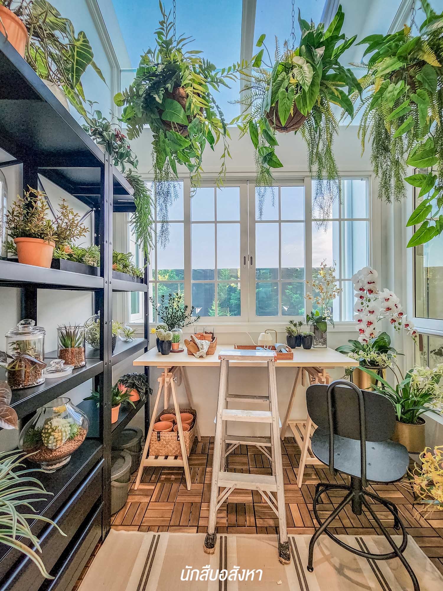 ชั้นที่ 2 ออกแบบฟังก์มาคล้ายๆ กับบ้านหลังแรก ทั้งมุมไหว้พระ และมุมทำงานจะห่างกันพอดี เวลาใช้งานร่วมกันจึงไม่รบกวนกัน