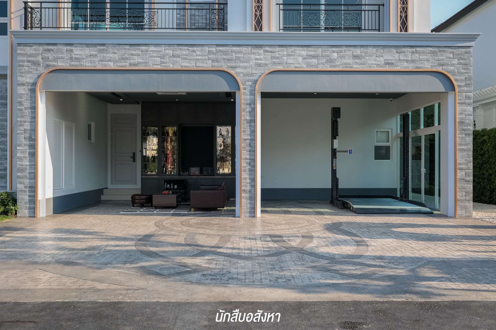 ที่จอดรถออกแบบเป็น Garage House สำหรับบ้านหลังนี้จอดรถได้ 4 คัน ความสูงของที่จอดรถ 3.8 เมตร จึงสามารถรองรับการติดตั้งลิฟต์จอดรถ ทำให้จอดสูงสุดได้ถึง 8 คัน บริเวณโรงจอดรถจะมีช่องเก็บของซึ่งตรงกับช่องว่างของบันได ใช้เก็บของชิ้นใหญ่ๆ พวกอุปกรณ์ทำความสะอาด ทำสวน เน้นการดีไซน์ให้ใช้ประโยชน์คุ้มค่ามากที่สุด