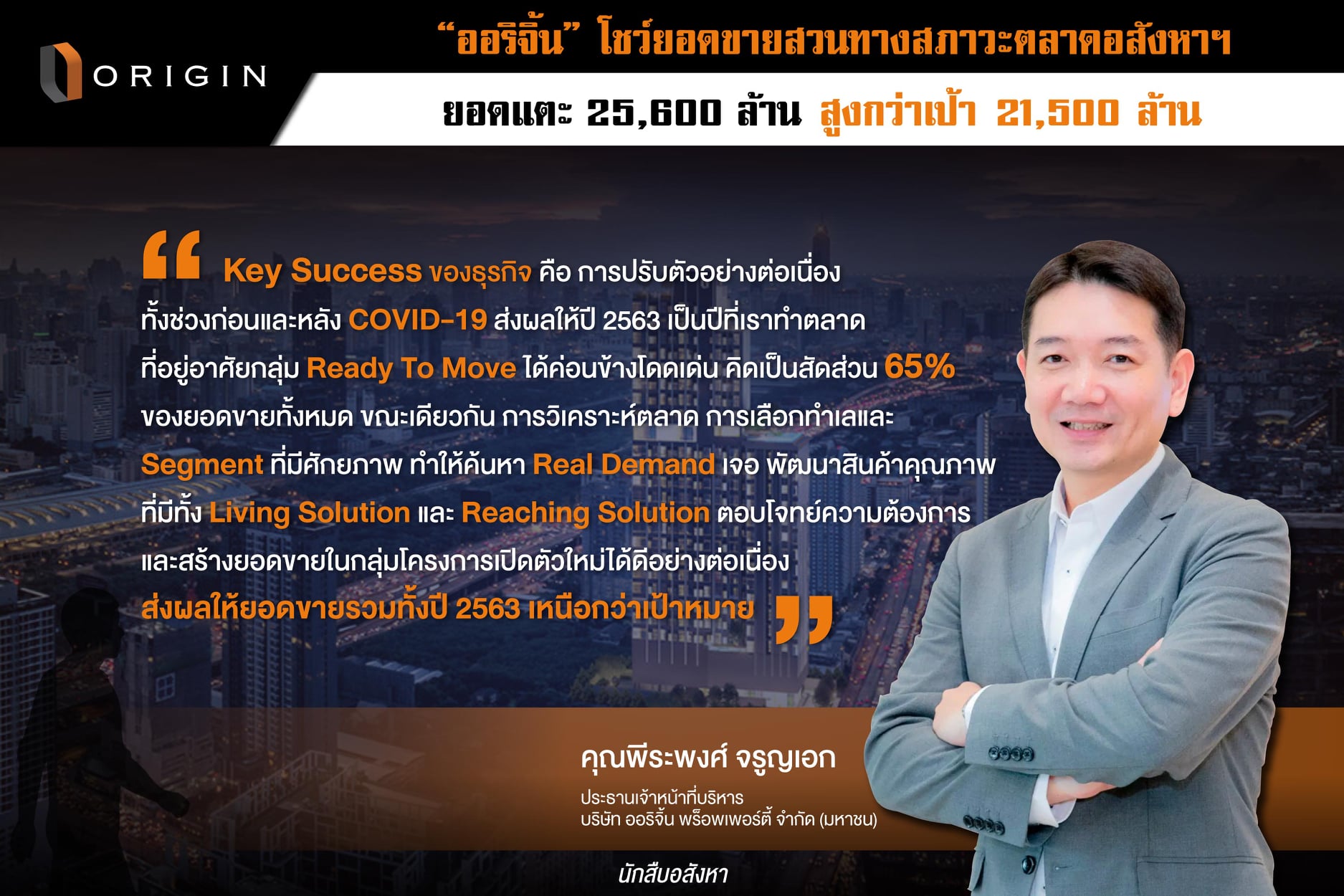 ปี 2563 แม้จะมีการแพร่ระบาดของ COVID – 19 แต่ก็ยังคงเป็นปีที่ทาง Origin ปรับตัวได้อย่างรวดเร็ว และสามารถสร้างยอดขายที่โตสวนกระแสสภาวะตลาดอสังหาฯ โดยยอดขายของปี 2563 อยู่ที่ 25,600 ล้าน สูงกว่าเป้า 21,500 ล้าน ซึ่งทาง Origin เองมีการปรับตัวหลายอย่างตั้งแต่ช่วง COVID – 19 ทั้งการปรับสัดส่วนพัฒนาโครงการบ้านจัดสรรภายใต้บริษัท บริทาเนีย เพิ่มขึ้น อีกทั้งครอบคลุมกลุ่มบ้านราคา 2 – 5 ล้านภายใต้แบรนด์ Brighton รวมถึงแตะ Segment 7 – 10 ล้านภายใต้แบรนด์ Grand Britania และ Segment 25 ล้านบาทขึ้นไปภายใต้แบรนด์ Belgravia นี่จึงเป็นอีกสาเหตุที่ทำให้มียอดขายบ้านจัดสรรในสัดส่วน 25%