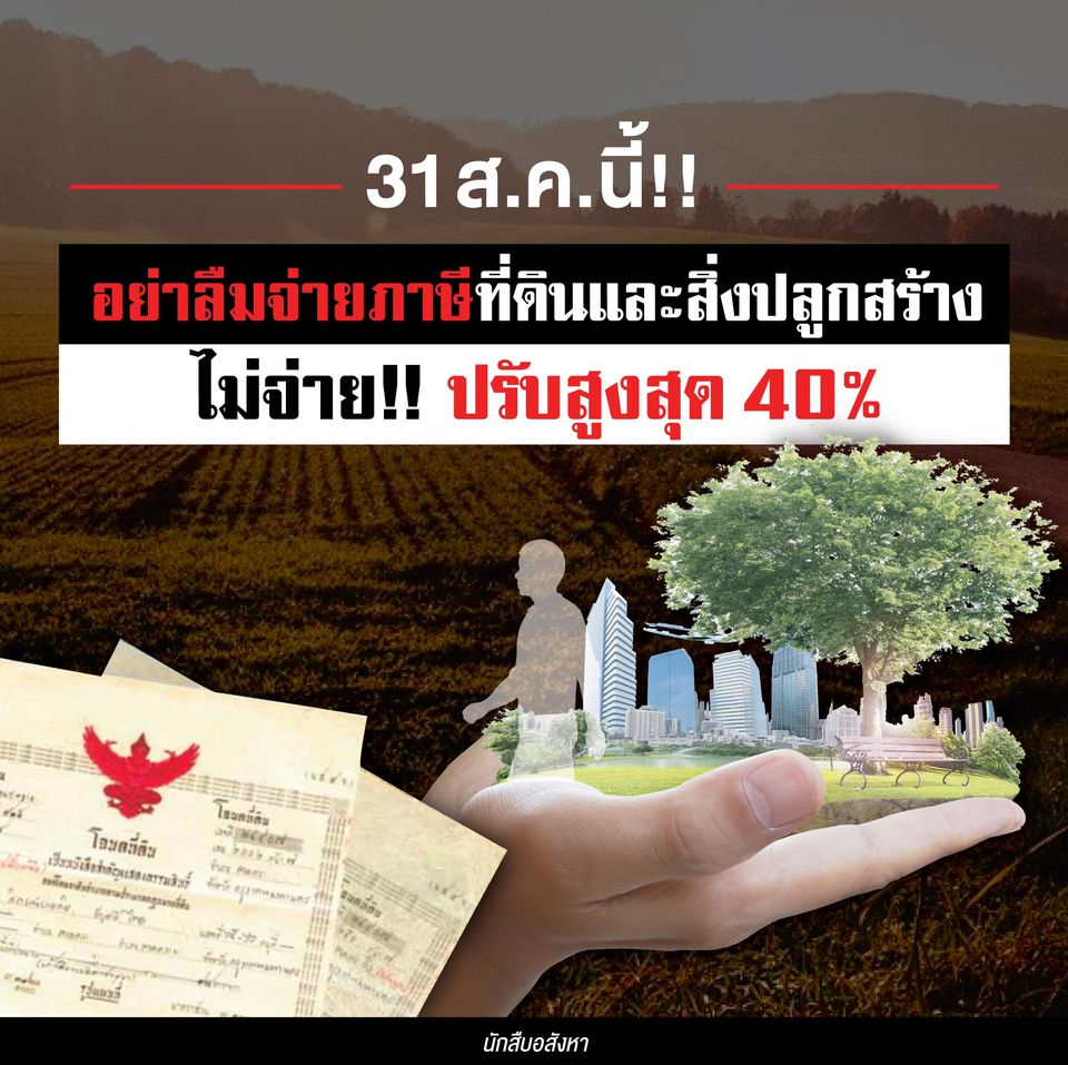 อีกเส้นตายที่ใกล้เข้ามาก็คือ ภาษีที่ดินและสิ่งปลูกสร้าง!! สิ้นเดือนนี้แล้วนะครับสำหรับการจ่าย หากใครที่ได้รับหนังสือแจ้งเตือนแล้วก็อย่าลืมตรวจความถูกต้องและเสียภาษีให้ตรงเวลานะครับ ลองมาดูกรณีไม่จ่ายหรือจ่ายช้ากันครับว่ามีอะไรบ้าง…