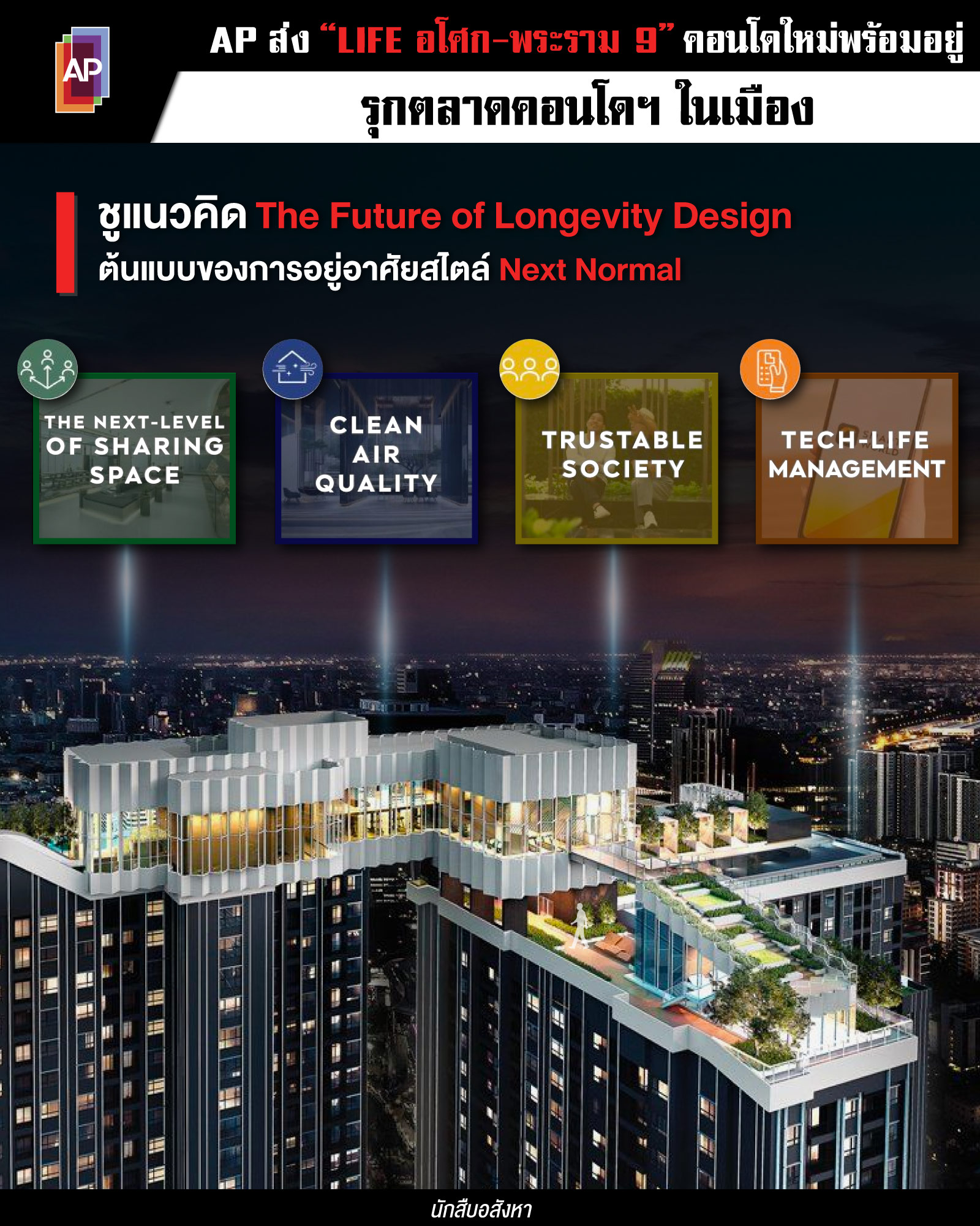 แม้ว่าสภาพตลาดอสังหาฯ จะมีวิกฤตเกิดขึ้นมากมาย แต่แบรนด์ AP เป็นอีกแบรนด์ที่ผมชื่นชมเรื่องการปรับตัวที่รวดเร็ว และยังสามารถพิสูจน์ให้เห็นถึงศักยภาพของแบรนด์หลายต่อหลายครั้ง อย่างล่าสุดนี้ก็เช่นกันครับที่ทาง AP เตรียมรุกตลาดคอนโดฯ ในเมืองด้วยการส่งคอนโดใหม่พร้อมอยู่อย่าง “LIFE อโศก – พระราม 9” บนพื้นที่ส่วนกลางกว่า 7.5 ไร่ ที่เป็น Project ร่วมลงทุนโครงการที่ 11 ระหว่าง AP และพันธมิตรญี่ปุ่นอย่าง Mitsubishi Estate มูลค่ากว่า 9,800 ล้าน แต่สิ่งที่น่าสนใจก็คือแนวคิด The Future of Longevity Design เพื่อการอยู่อาศัยร่วมกันในบรรทัดฐานใหม่อย่างยั่งยืน หรือต้นแบบของการอยู่อาศัยสไตล์ Next Normal นั่นเองครับ ซึ่งแนวคิดทั้ง 4 ได้แก่…