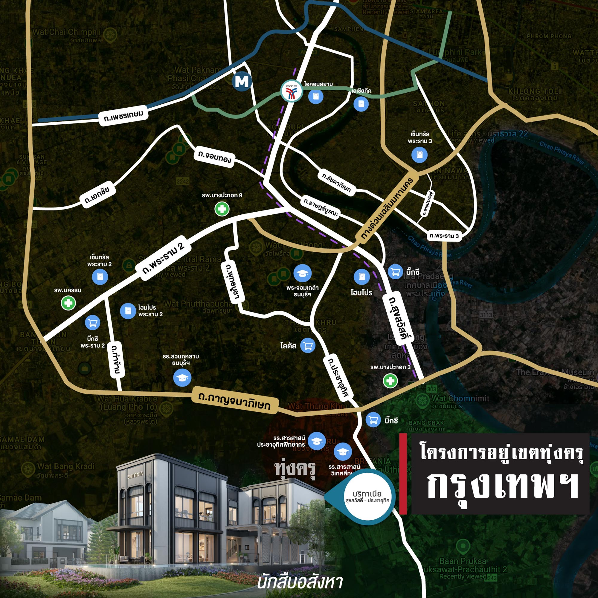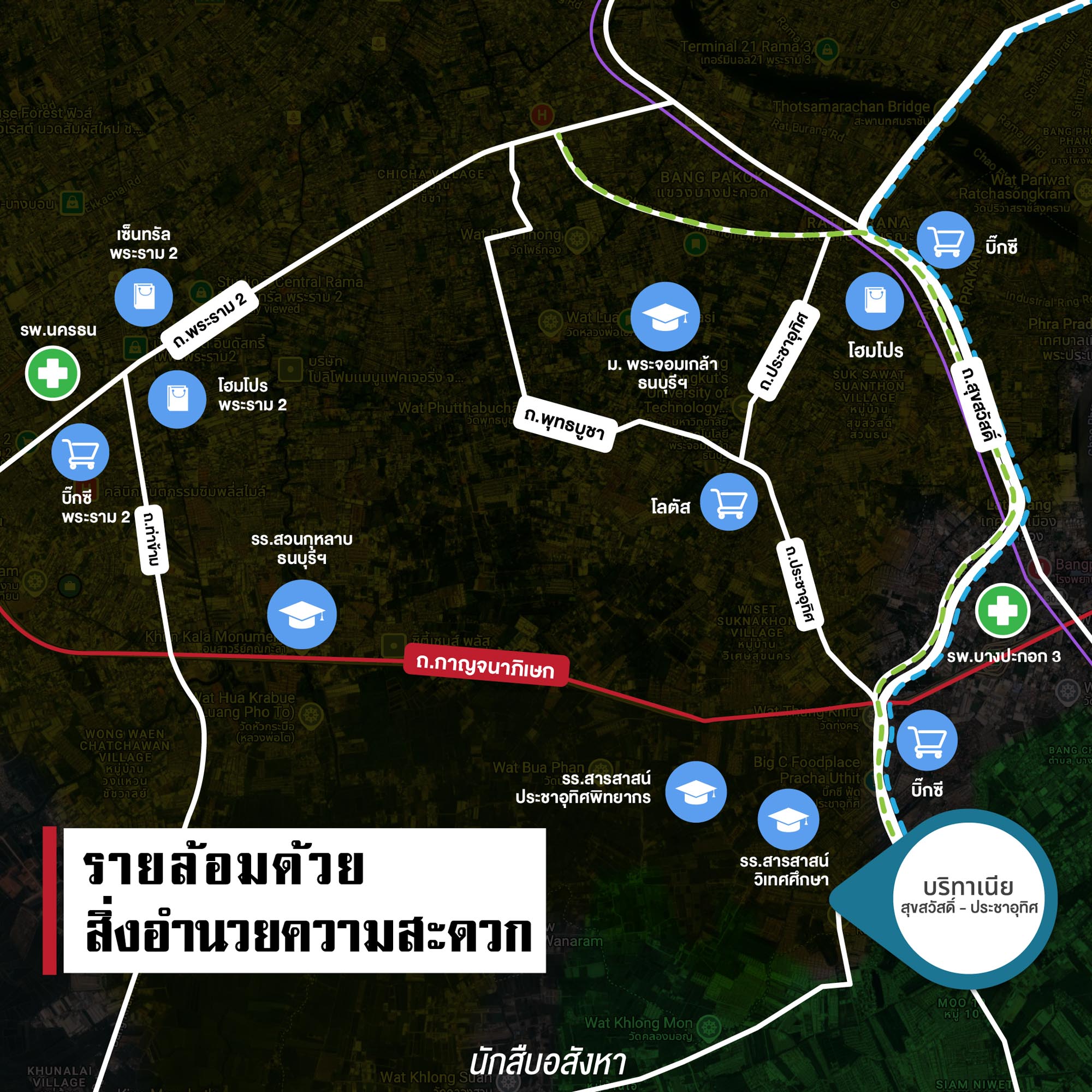 ◾ ทำเล ที่ตั้งของโครงการอยู่ติดกับถนนใหญ่ 4 เลน ช่วงต้นซอยประชาอุทิศ 90 ทำให้เวลาเดินทางเข้าออกโครงการออกถนนใหญ่ขับรถง่ายกว่า อีกทั้งแหล่งอำนวยความสะดวกรอบโครงการก็ถือว่าแวดล้อมครบครัน ไม่ว่าจะเป็นห้าง สถานศึกษา หรือโรงพยาบาลชั้นนำมีรอบด้าน นอกจากนี้แล้ว ในอนาคตแนวรถไฟฟ้าสายสีม่วงใต้ พาดผ่านถนนสุขสวัสดิ์ มาจนถึงครุใน เมื่อแล้วเสร็จเวลานั้นจะเห็นการเปลี่ยนแปลงก้าวกระโดดแน่นอนครับ