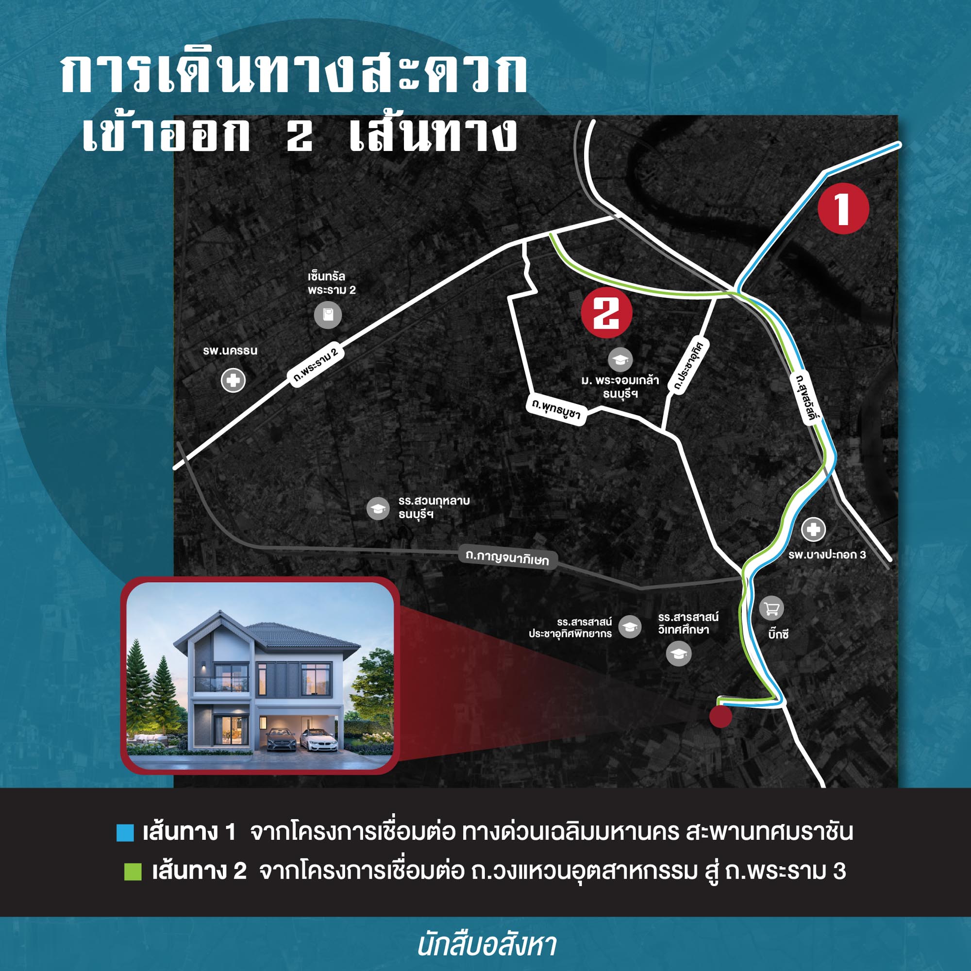 จุดเด่นของทำเลคือ เราสามารถซื้อบ้านใหม่ที่ตอบโจทย์ ด้วยพื้นที่ใช้สอย ในราคาที่จับต้องได้ และในแง่ของการเดินทางที่เชื่อมต่อเมือง ประชาอุทิศ 90 เป็นทำเลที่ขยับจากถนนสุขสวัสดิ์ออกมานิดเดียว และมีทางเข้าออกไปเชื่อมต่อกับทางพิเศษได้หลายเส้นทาง และอีกปัจจัยที่สำคัญคือการตัดถนนวงแหวนรอบนอกฯ (สุขสวัสด์-บางขุนเทียน) ทำให้การเดินทางจากประชาอุทิศ ไปพระรามสอง สมุทรสาคร บางบัวทอง ก็ง่าย นอกจากนี้ประชาอุทิศ 90 ยังอยู่ในจุดที่เข้าถึงรถไฟฟ้าสายสีม่วงใต้ได้ง่ายอีกด้วย ทำให้ในอนาคตอีกประมาณ 3 ปีต่อจากนี้ Infrastructure ในโซนสุขสวัสดิ์-ประชาอุทิศ จะมีการเติบโตที่สมบูรณ์แบบมากขึ้น เฉกเช่นเดียวกับทำเลใกล้รถไฟฟ้าอื่นๆ และนี่จึงเป็นเหตุผลว่าทำไมต้องซื้อบ้านโซน ประชาอุทิศ 90 ตอนนี้ครับ