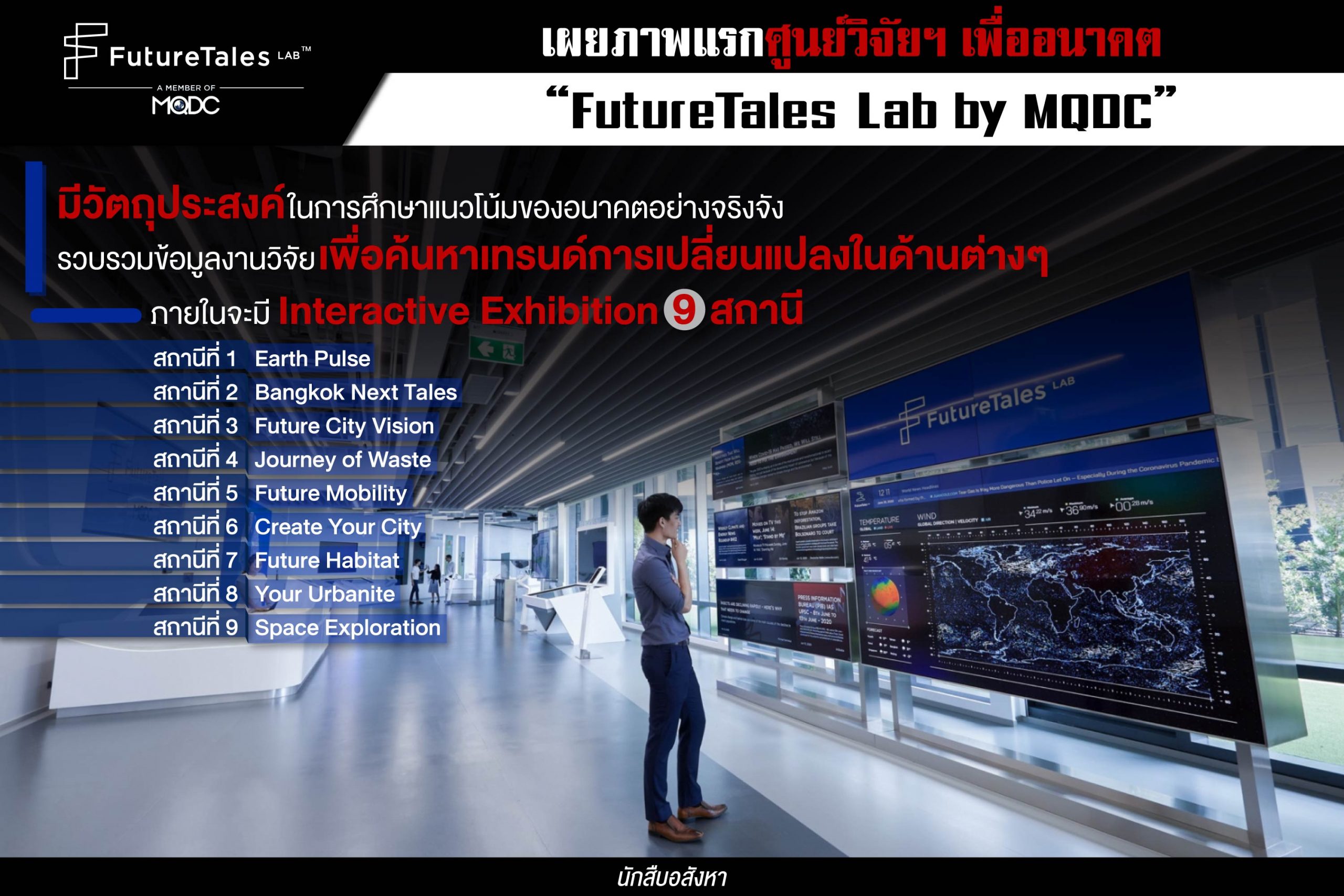 สำหรับ “FutureTales Lab by MQDC” นั้น ภายในศูนย์ฯ จะมี Interactive Exhibition ซึ่งเป็นนิทรรศการอนาคตศึกษาด้วยกัน 9 สถานี ที่นำทีมวิจัยงานโดย ดร. การดี เลียวไพโรจน์ หัวหน้าคณะที่ปรึกษา FutureTales Lab by MQDC พร้อมด้วยทีมนักวิจัยด้านการคาดการณ์อนาคตที่มีความรู้ความสามารถเฉพาะด้าน เพื่อมุ่งวิจัย และวิเคราะห์ข้อมูลที่สำคัญต่ออนาคต ในประเด็นต่างๆ ทั้งการอยู่อาศัย (Future of Living) เทคโนโลยีและนวัตกรรมหุ่นยนต์ (Technology & Robotics) และการใช้ชีวิตในอวกาศ (Space Exploration) โดยศูนย์ฯ วิจัย “FutureTales Lab by MQDC” จะตั้งอยู่ที่ชั้น 8 ของโครงการ True Digital Park ครับ