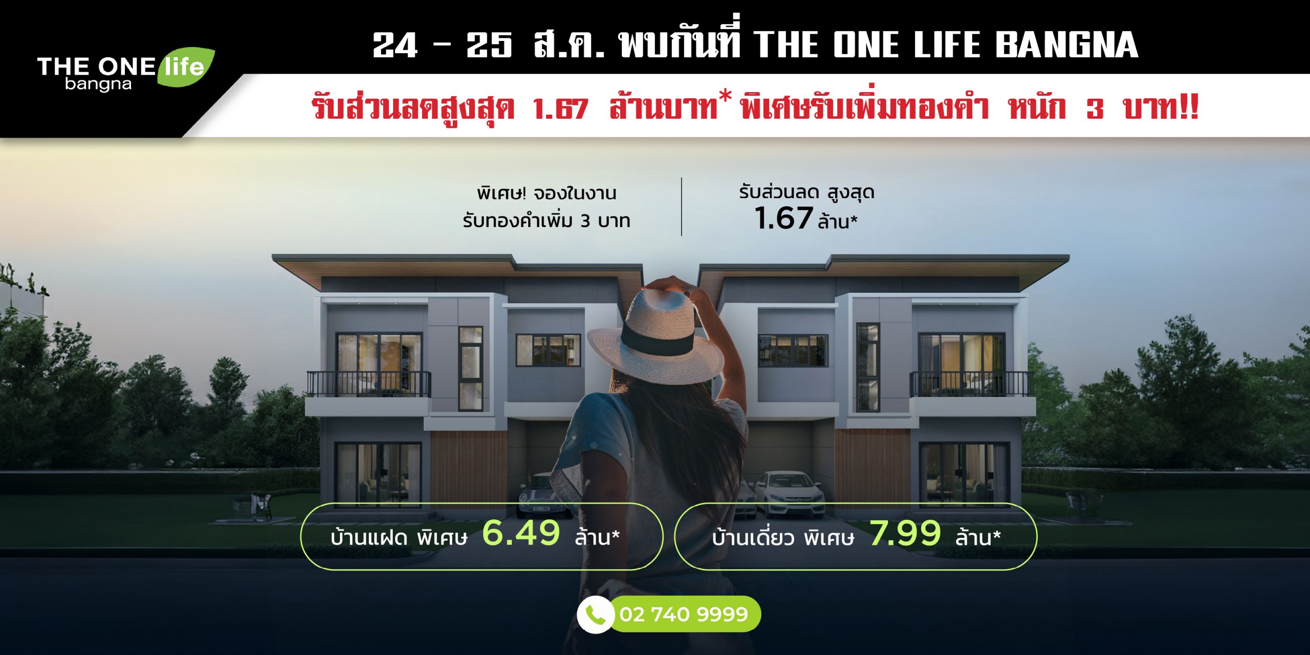 ใครกำลังมองหาบ้านย่านบางนา กม. 8 ราคาไม่เกิน 10 ลบ. เตรียมตัวให้พร้อม! วันที่ 24-25 สิงหาคมนี้ ต้องห้ามพลาดงาน SPECIAL LET’S MOVE LIFE รับส่วนลดสูงสุด 1.67 ล้านบาท* พิเศษรับเพิ่มทองคำ หนัก 3 บาท!! ชวนทุกคนมา Move สู่ความคุ้มค่าและสะดวกสบาย ไปกับโครงการ “THE ONE life bangna” ตัวโครงการอยู่ติดโรงเรียนสาธิตมหาวิทยาลัยรามคำแหง 2 หน้าทางเข้าโครงการจะเป็นบิสทาวน์ มีร้านค้าร้านอาหารคึกคัก เดินทางเชื่อมต่อทำเลอื่น ๆ ได้สะดวก เพราะอยู่ใกล้ถนนทางคู่ขนานวงแหวนกาญจนาภิเษกและถนนเฉลิมพระเกียรติ ร. 9 ใกล้เมกา บางนา