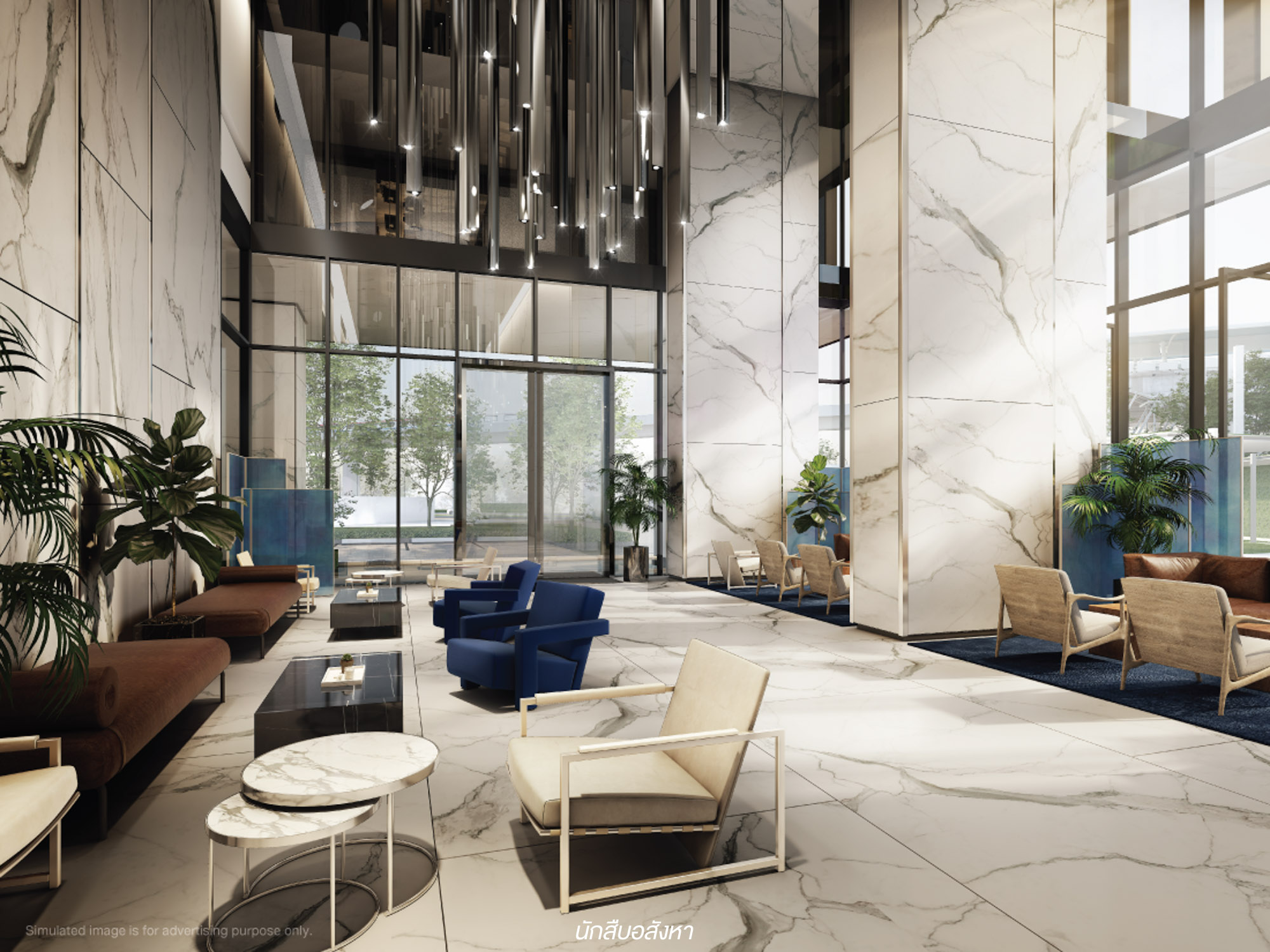 Lobby : เริ่มกันที่ Lobby ของโครงการที่ตกแต่งด้วยหินอ่อน ให้เรื่องของความหรูหรา และยังดูโอ่โถงด้วยการดีไซน์แบบ Double Volume พร้อมตกแต่งด้วย Modren Chandelier สวยงามมากจริงๆ ครับ ซึ่งพื้นที่สามารถใช้สำหรับนั่งรถรอรับ – ส่ง หรือรอรถจาก Auto Parking ได้ครับ